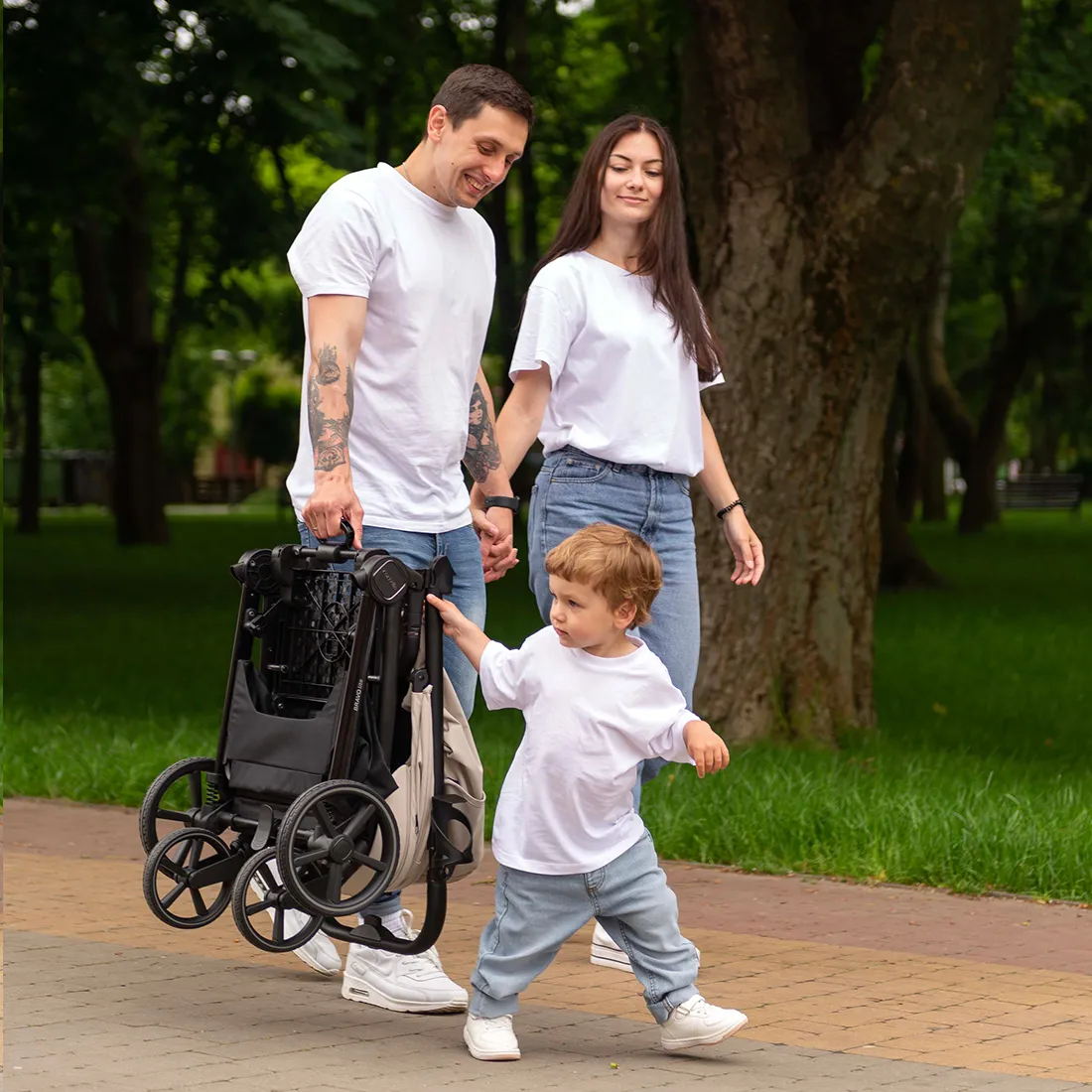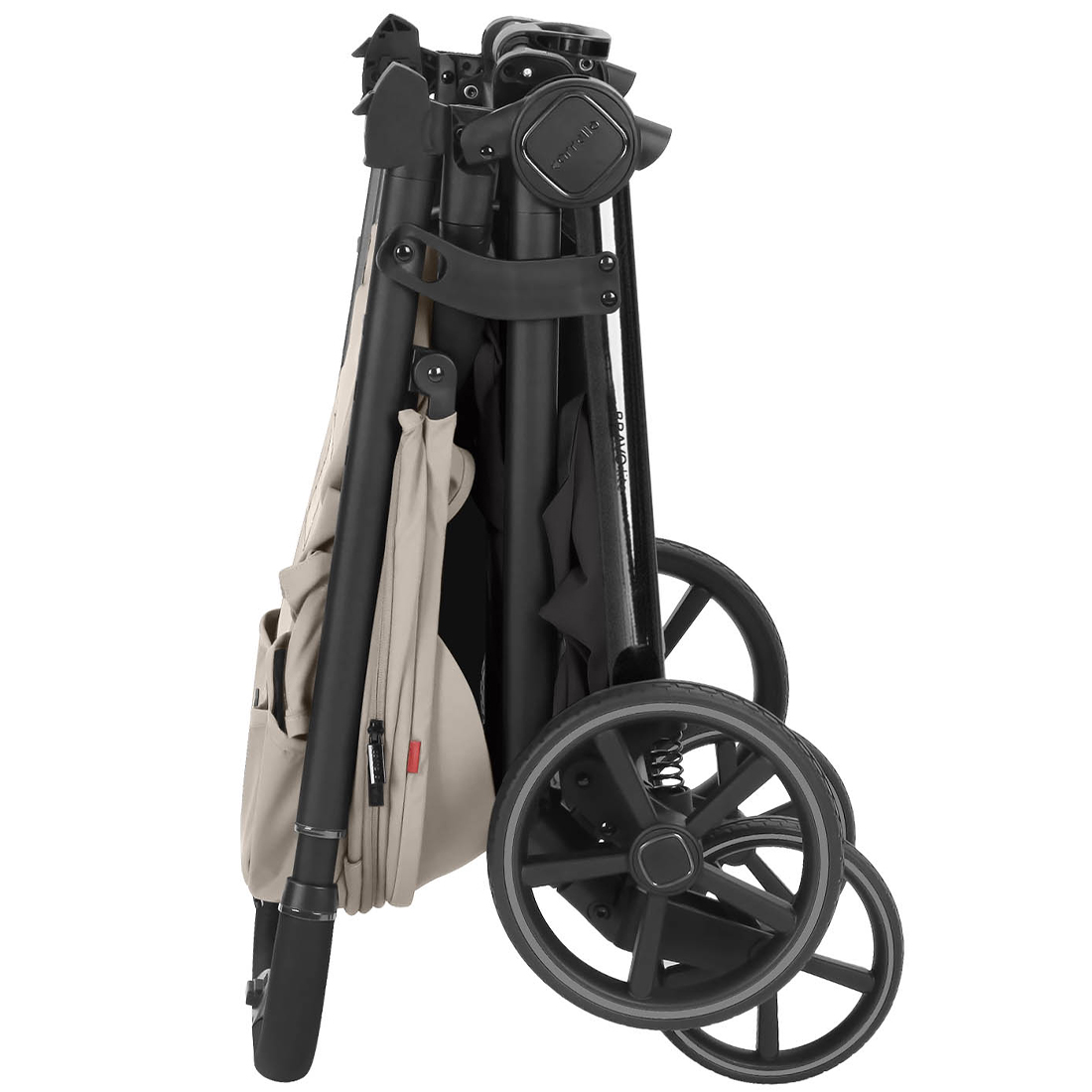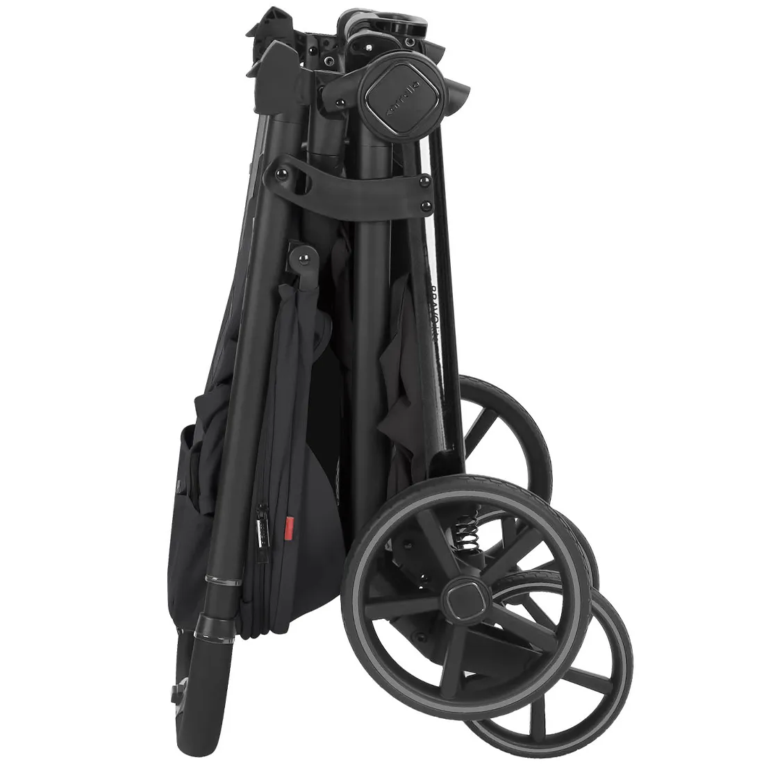 Коляска складывается сидением внутрь - текстиль сиденья защищен от загрязнений. В сложенном виде коляска блокируется и сохраняет вертикальное положение.