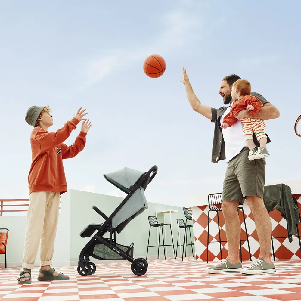 Надежная алюминиевая рама опирается на четыре полиуретановых колеса, снабженных амортизаторами. Задняя ось шире передней, на ней расположен стояночный тормоз. Передние поворотные колеса по диаметру меньше, но именно они способствуют хорошей маневренности. При движении по неровной дороге их лучше зафиксировать в положении «прямо». На раме имеется сетчатая корзина для вещей — хорошая возможность освободить мамины руки от тяжестей, позволяя ей лучше заботиться о крохе.