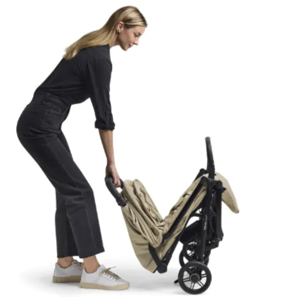 Коляска легко складывается одной рукой, даже с прикреплённым бампером, и остаётся в вертикальном положении после складывания. Для обеспечения максимальной гигиены ручка и капюшон всегда приподняты над землёй.