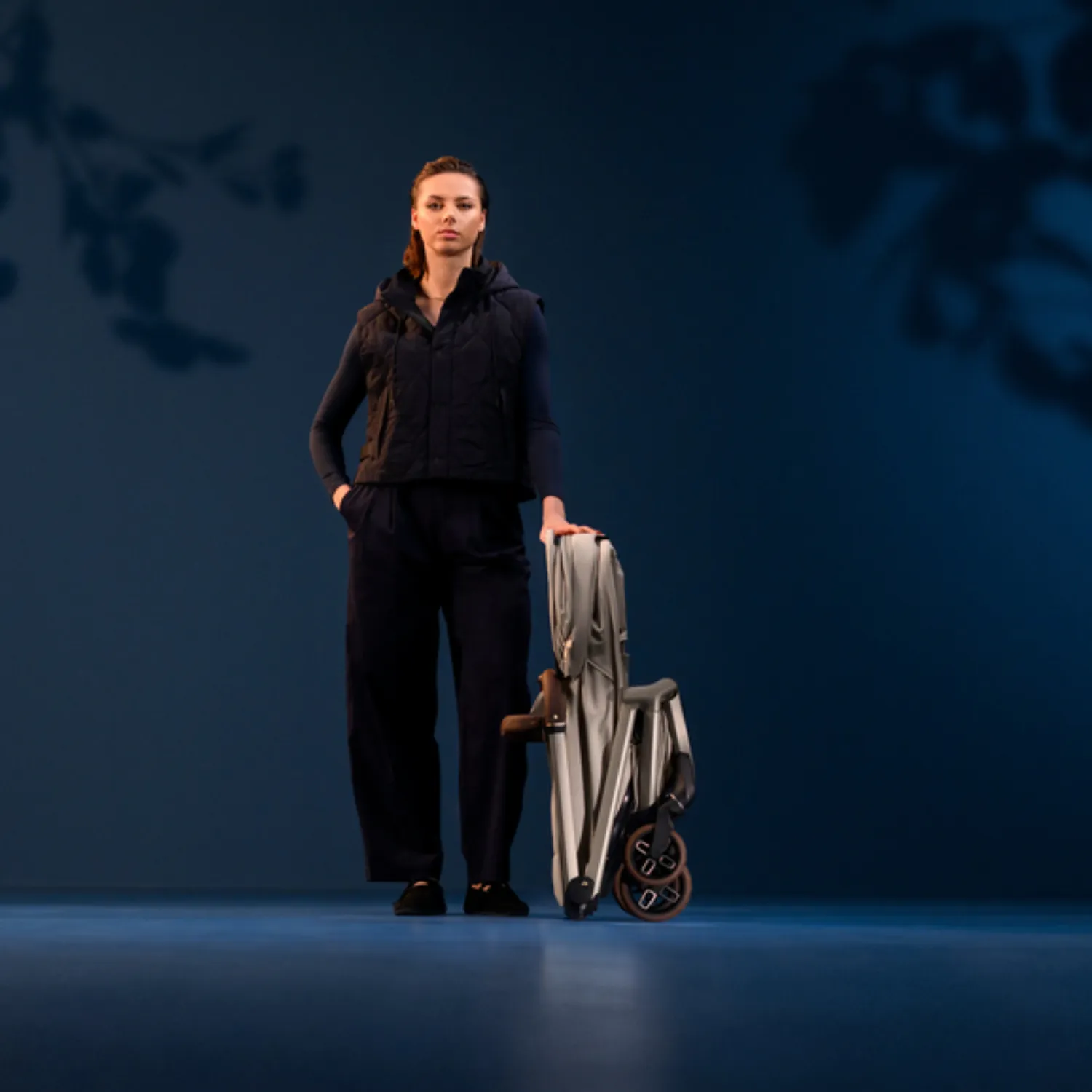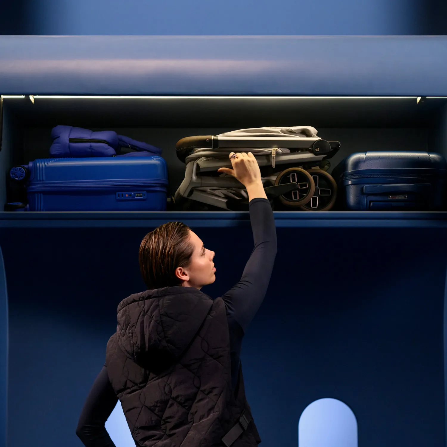 При посадке легко сложите коляску одной рукой и несите ее за интегрированный ремень, освободив обе руки для вашего маленького исследователя.