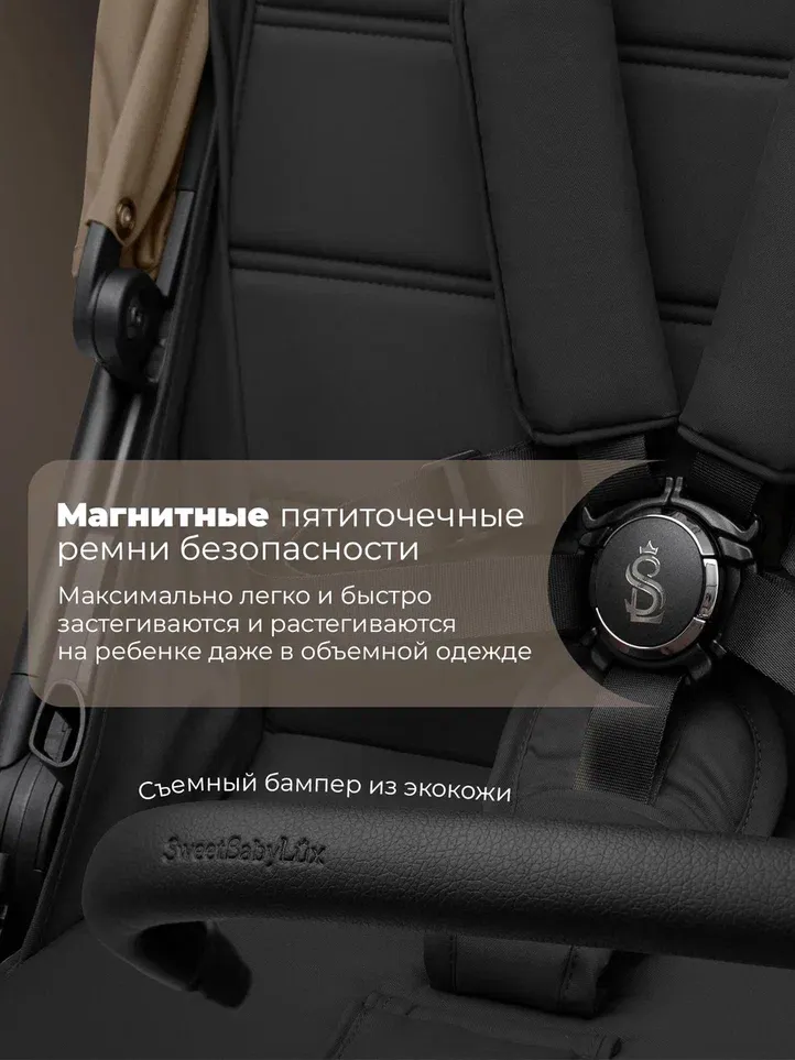 Пятиточечные магнитные ремни с мягкими накладками и съемный поворотный бампер для быстрой и легкой посадки..