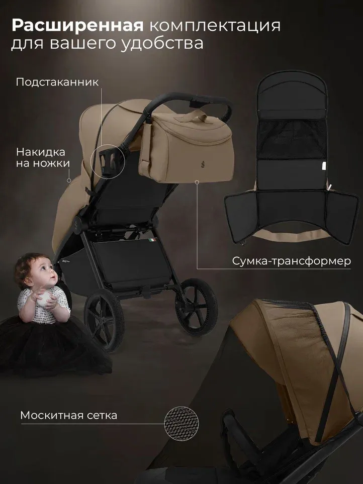 В комплекте все необходимое: москитная сетка, накидка на ножки, подстаканник, сумка для мамы.