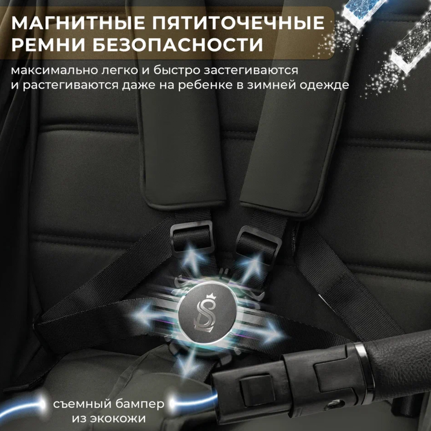 - магнитные пятиточечные ремни безопасности максимально легко и быстро застегиваются и расстегиваются даже на ребенке в зимней одежде