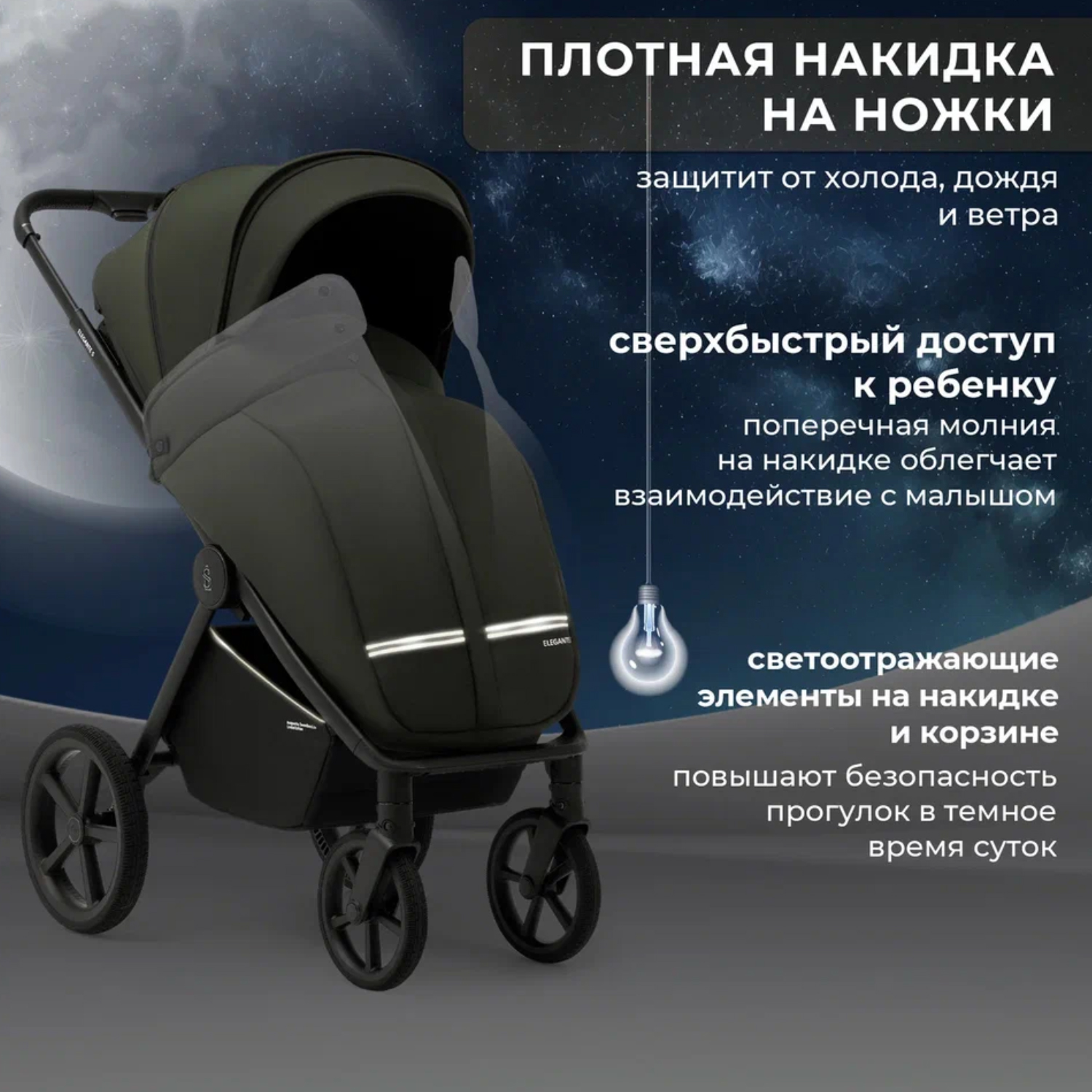 Созданная с акцентом на детали, Elegante S оснащена телескопической ручкой, которая подстраивается под любой рост родителей, и глубоким капором с дополнительной секцией на молнии, который надежно защитит малыша от солнечных лучей и любопытных глаз во время прогулки.