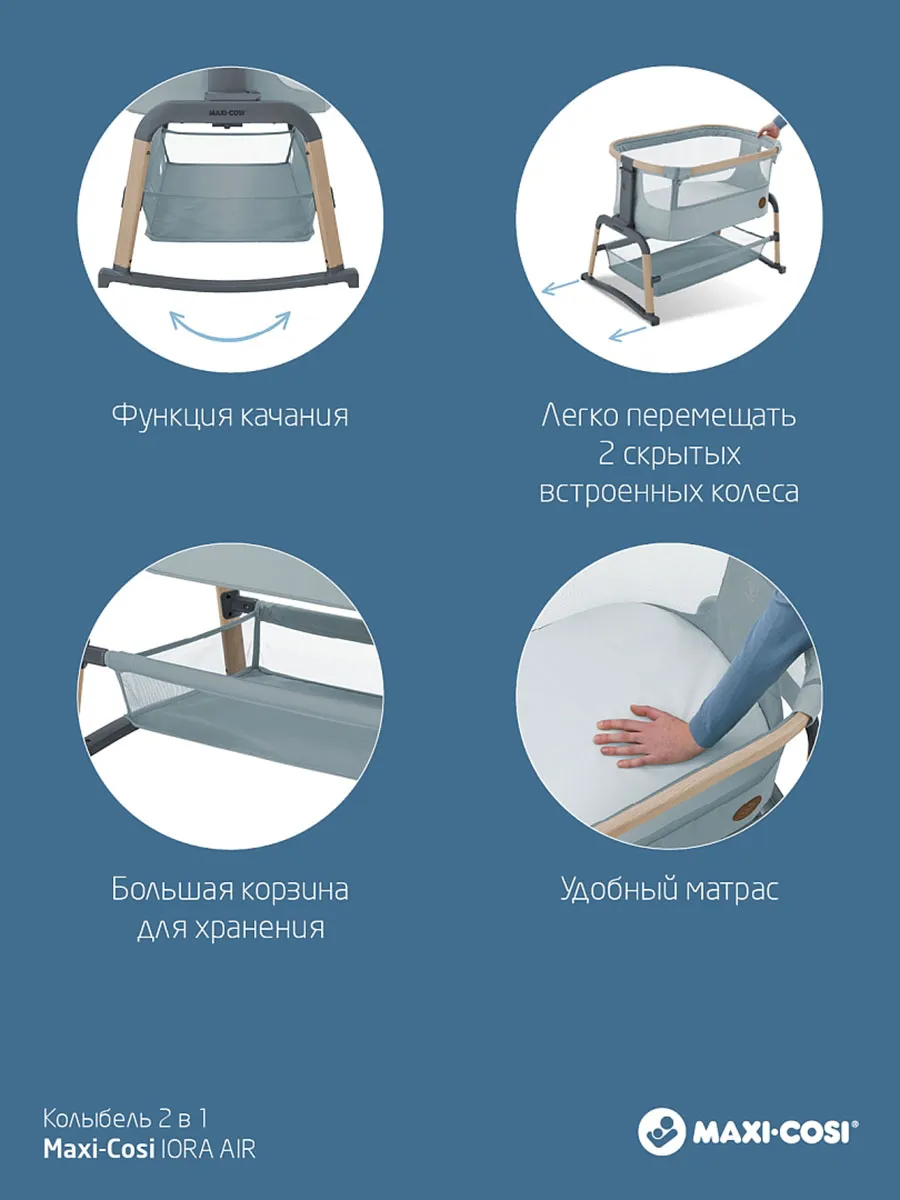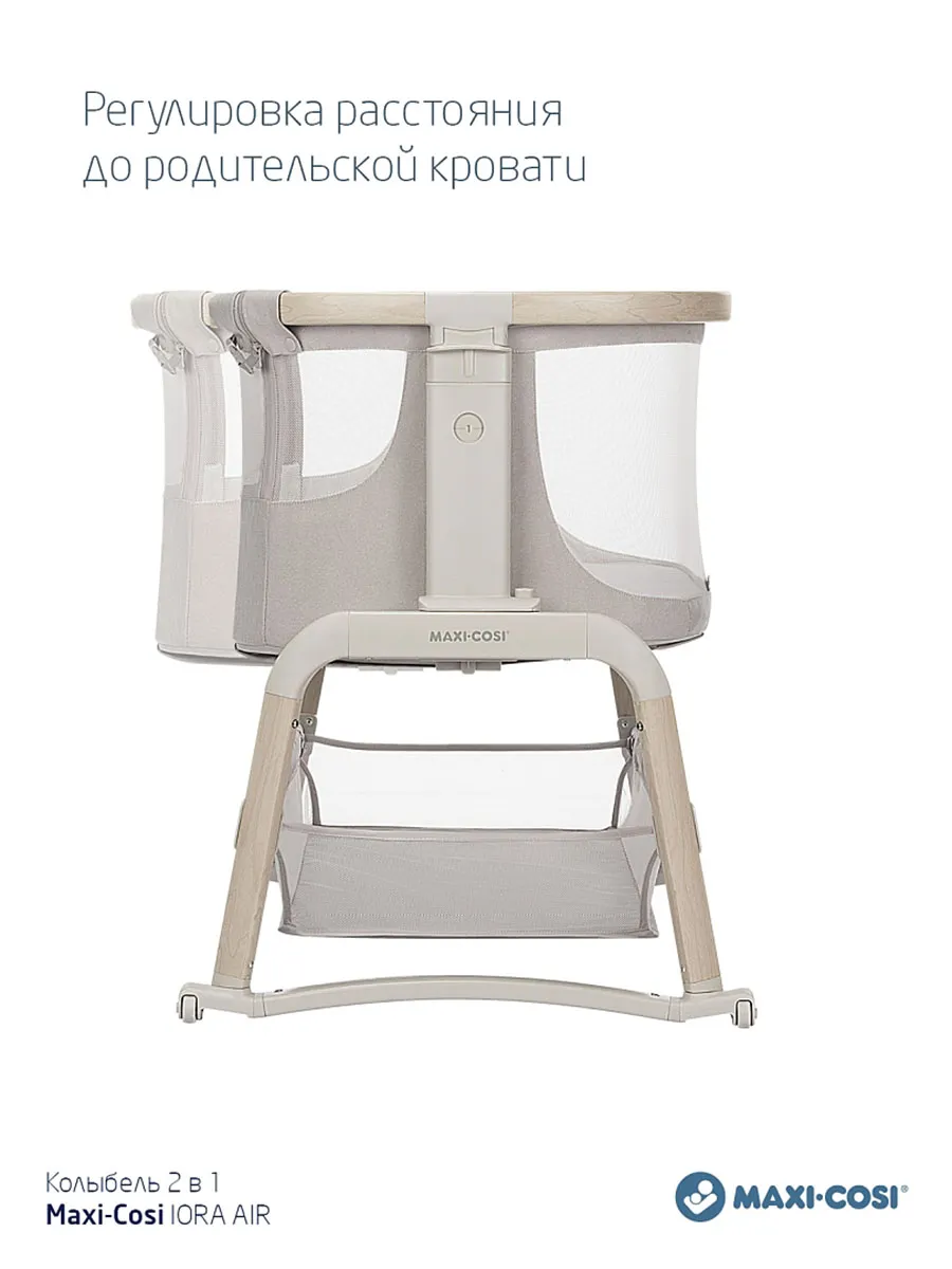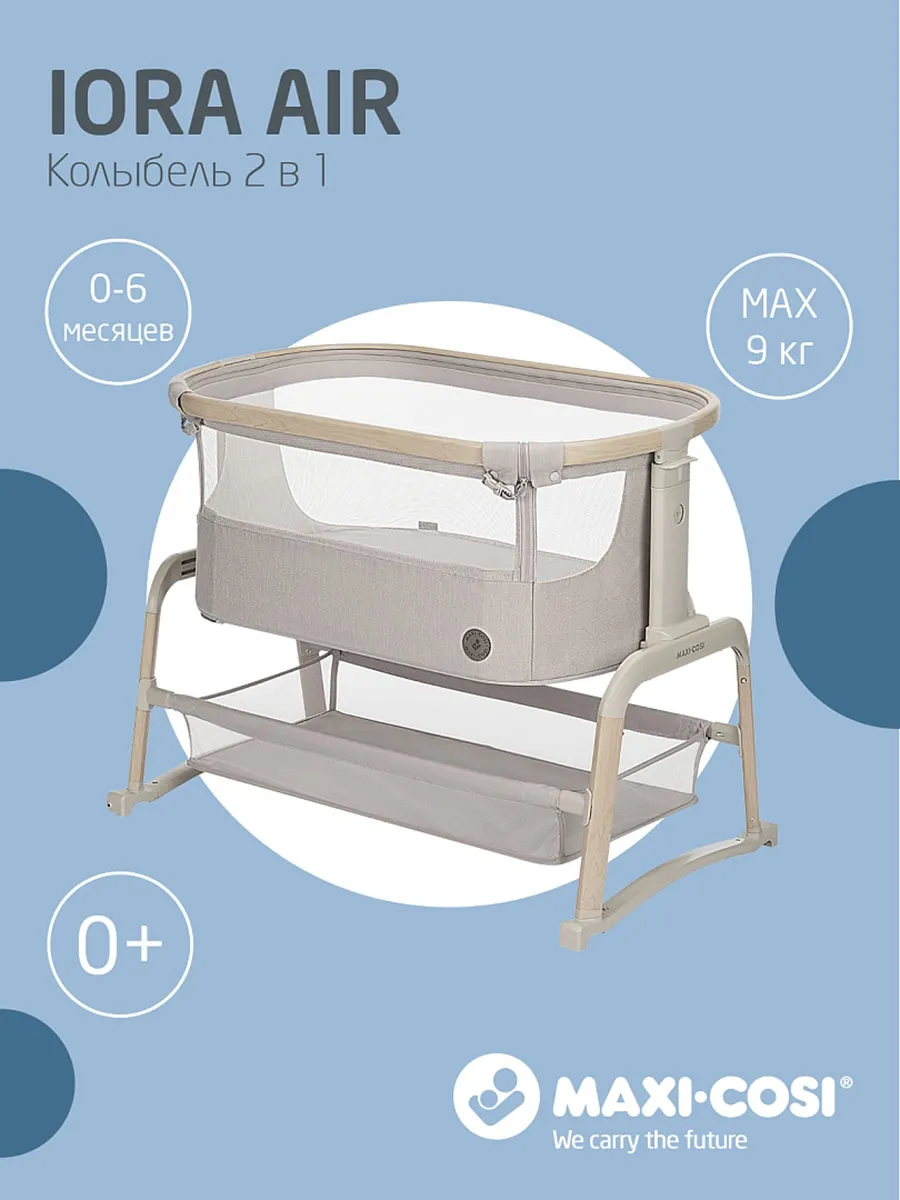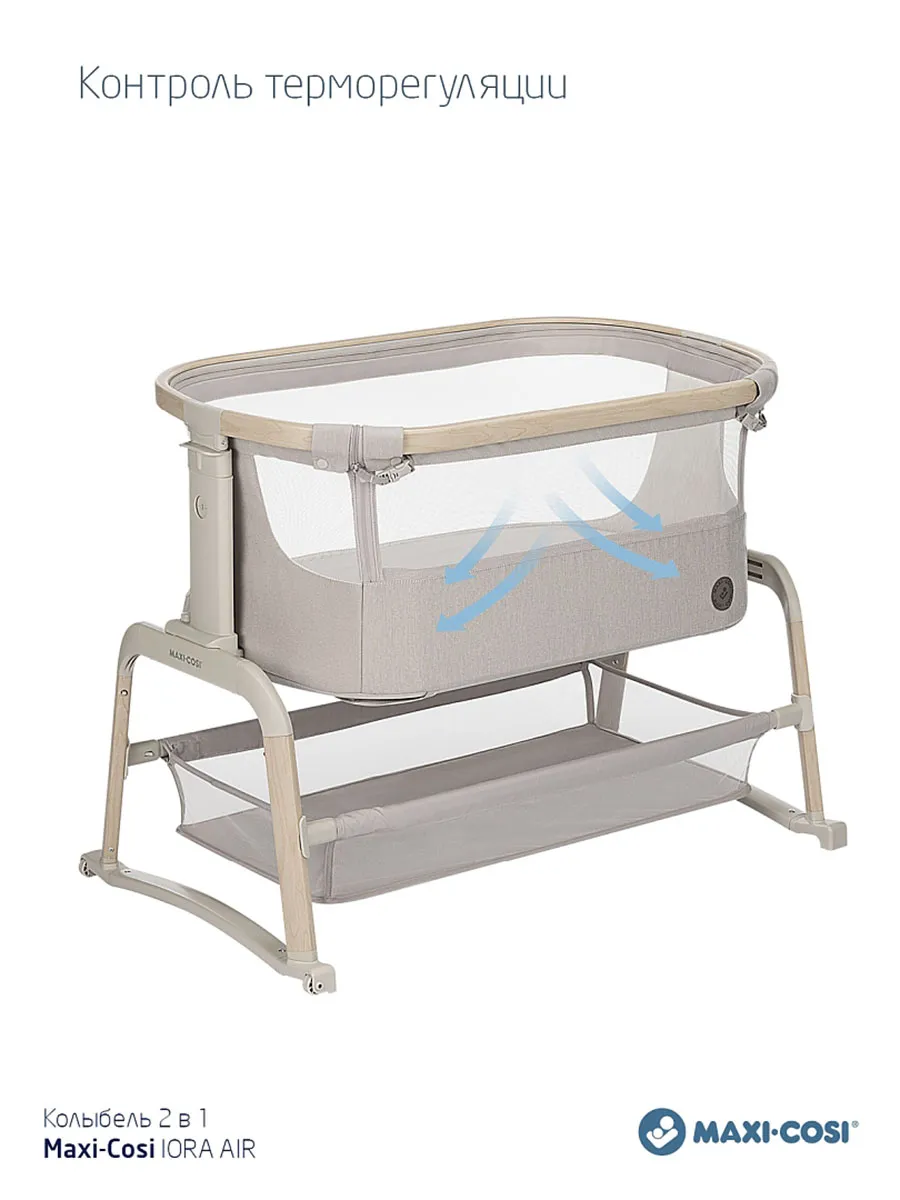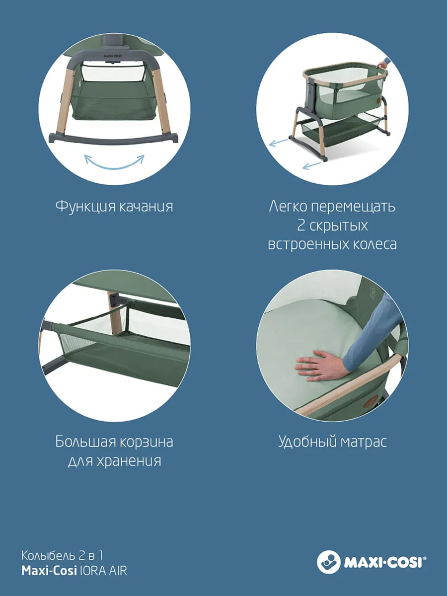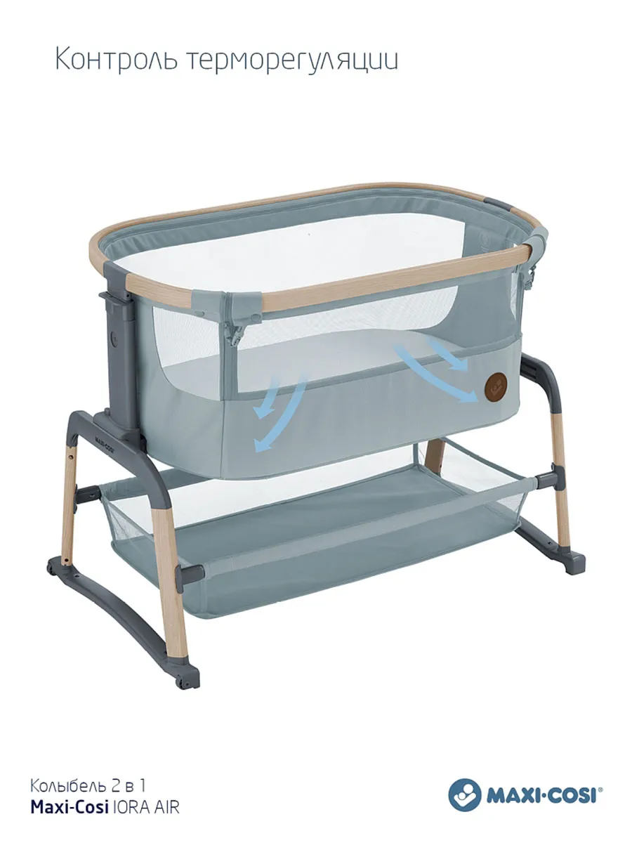 Maxi-Cosi Iora Air — это очень удобная и успокаивающая детская кроватка, созданная для того, чтобы быть ближе с вашим ребенком рядом и укреплять эту особую связь. Роскошный толстый матрас обеспечит вашему малышу весь необходимый комфорт. А во время более трудного сна удобная функция покачивания поможет успокоить вашего ребенка и снова заснуть. Модель Iora Air, изготовленная из сверхмягких тканей премиум-класса, на 100 % переработанных, имеет дышащую сетчатую ткань по всему периметру. А большая корзина для хранения внизу гарантирует, что все предметы первой необходимости вашего ребенка будут под рукой для круглосуточного ухода.