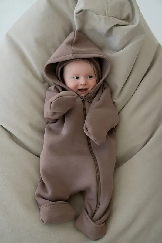 Комбинезон на молнии из футера с начесом с капюшонами и отворачивающимися манжетами. Температурный режим от -5 до +10 (в зависимости от того, что надеть под комбинезон). Молния по длине изделия позволяет быстро переодеть ребенка.