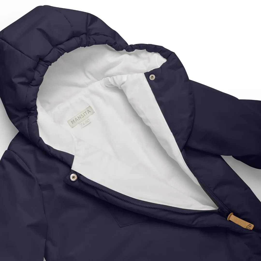 Mansita Monk — утеплённый демисезонный комбинезон на подкладке из 100% хлопка. Представлен в двух вариантах в зависимости от размера: с закрытой стопой (размеры 56-62, 62-68, 68-74) и открытой стопой (размер 74-80, 80-86). Подходит для прогулок весной и осенью при температуре от +5°C до -10°C с учетом внутренней одежды.
