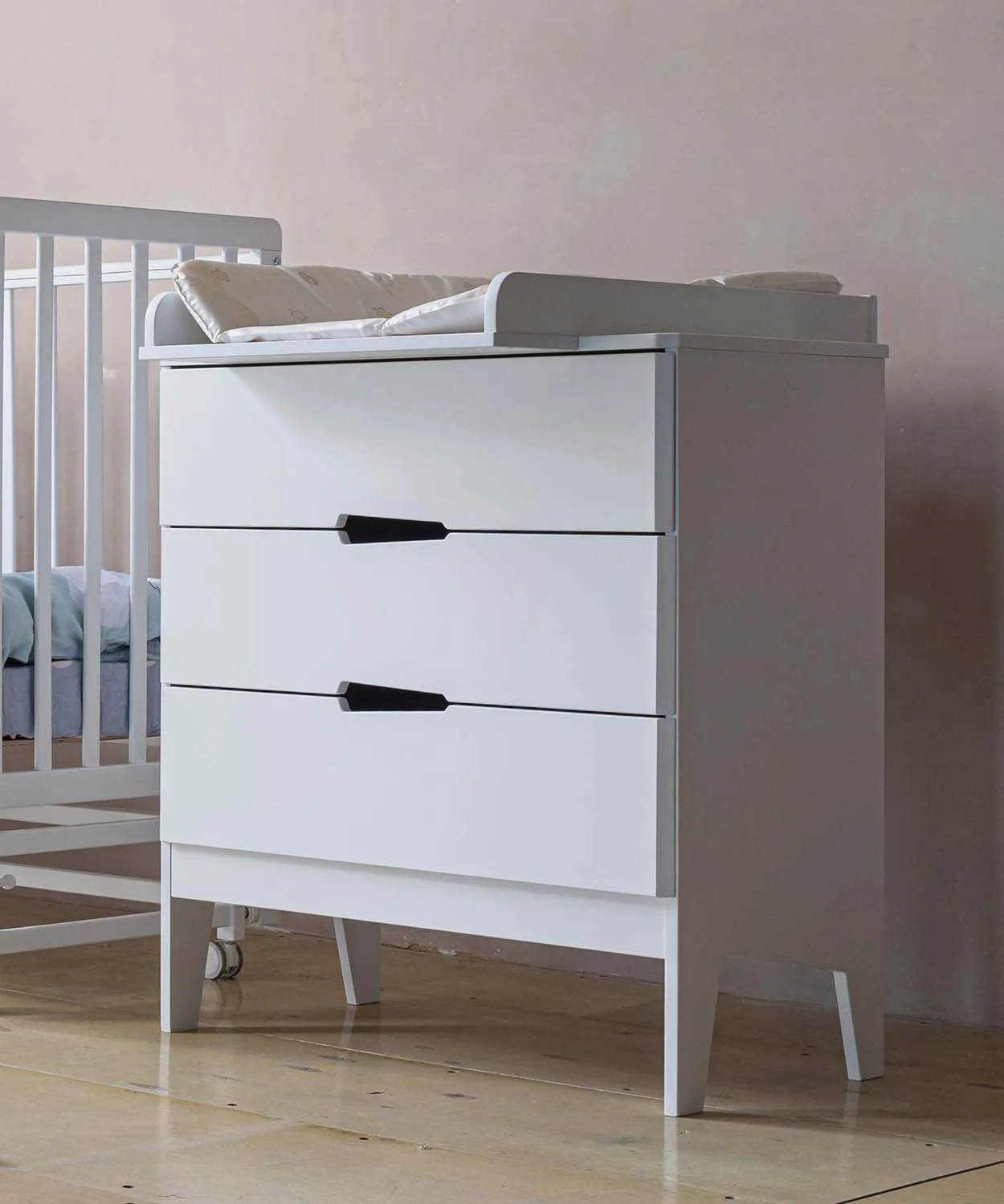 Пеленальный комод станет незаменимым помощником в ежедневном уходе за грудничком. На просторной пеленальной поверхности с ограничительными бортиками так удобно поменять подгузник или сделать легкий массаж. Комод оснащен съемным пеленальным столиком и имеет три функциональных ящика на телескопических направляющих с тихим ходом и плавным закрыванием. Используйте это пространство для гигиенических процедур и воздушных ванн, а все необходимое — памперсы, салфетки, кремы или лосьоны — будет под рукой. Все элементы изделия скруглены, а каркас и фасады изготовлены из экологически чистого материала, покрытые износостойкой безопасной краской.