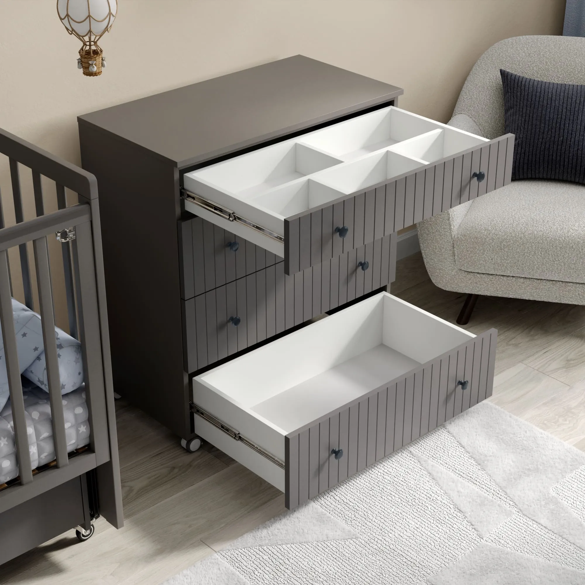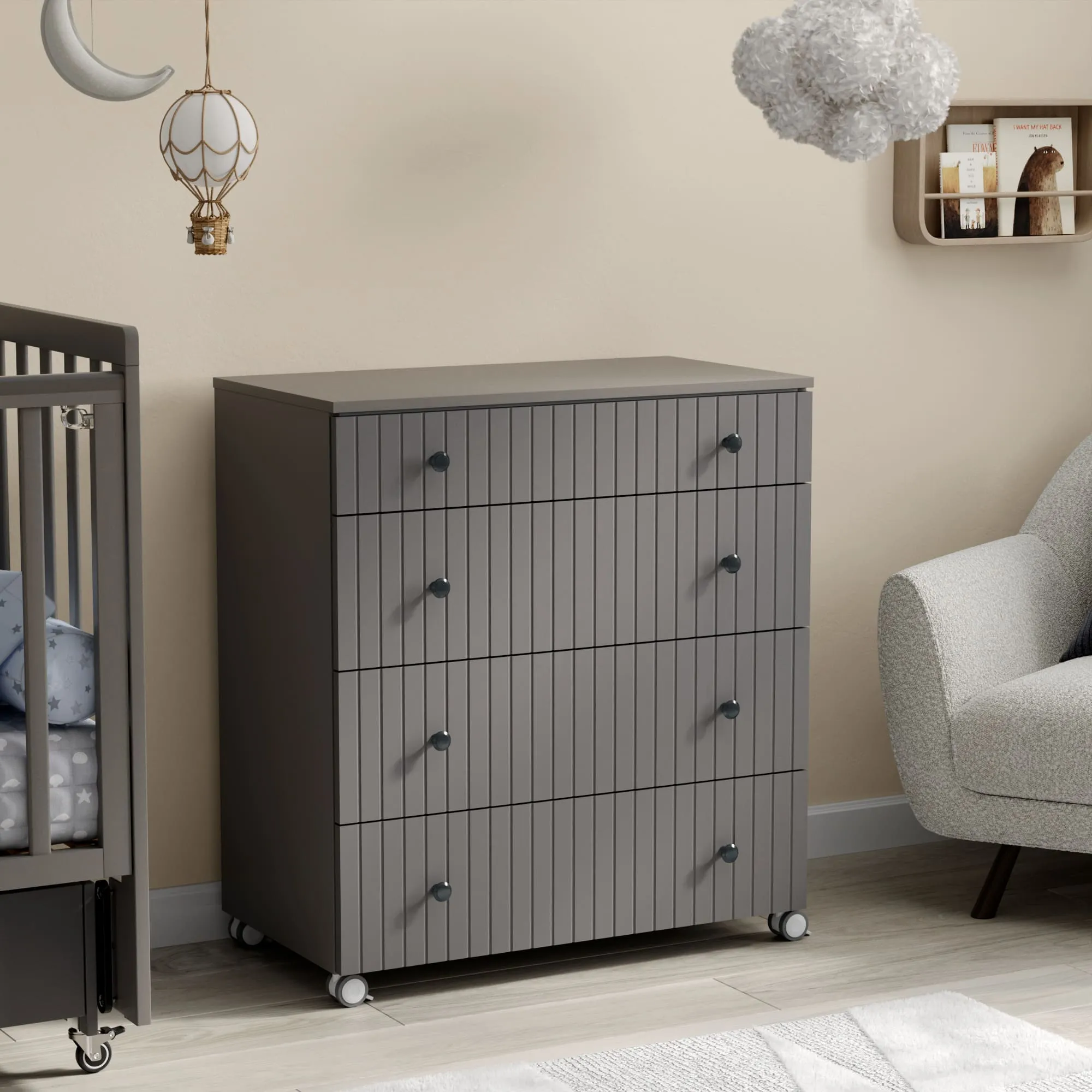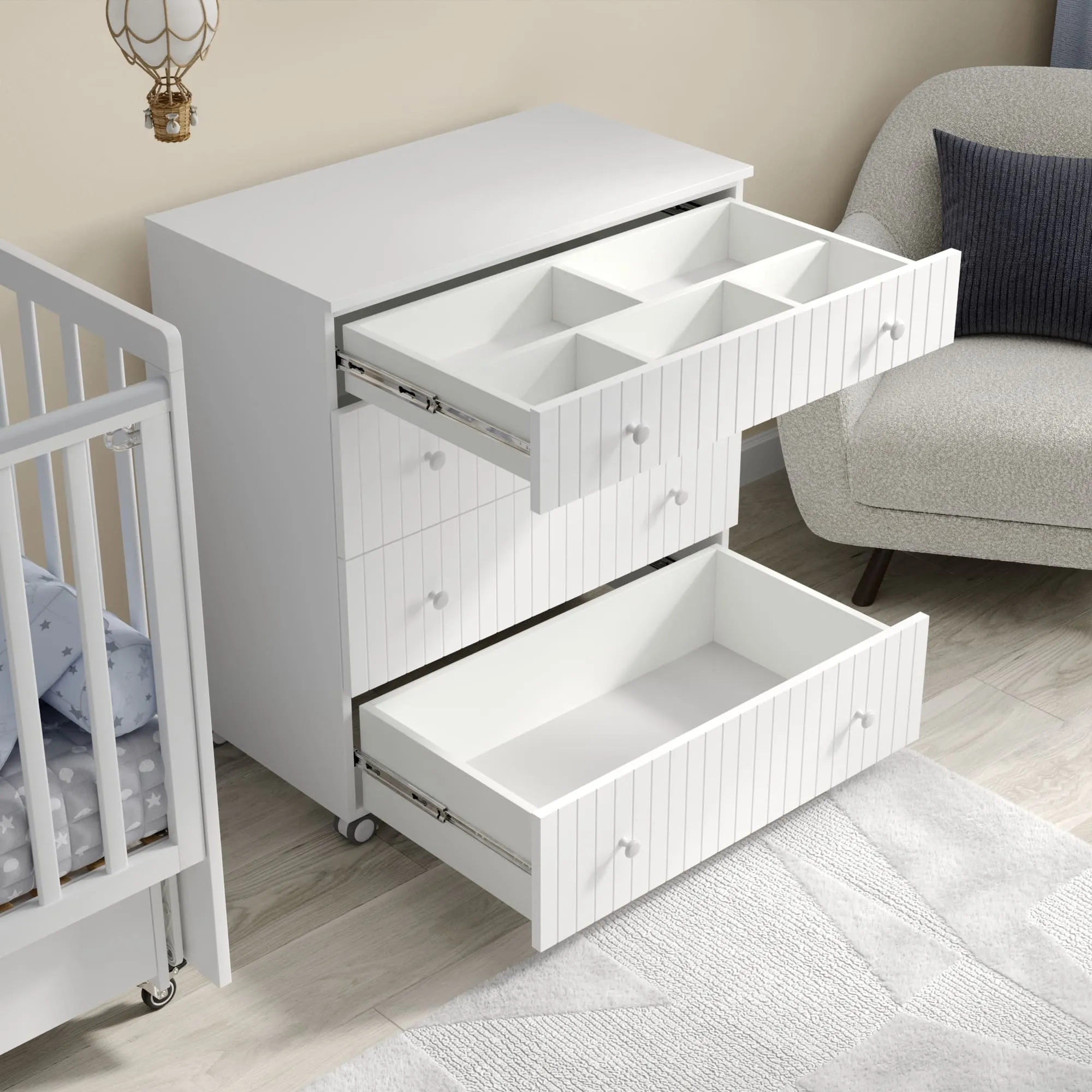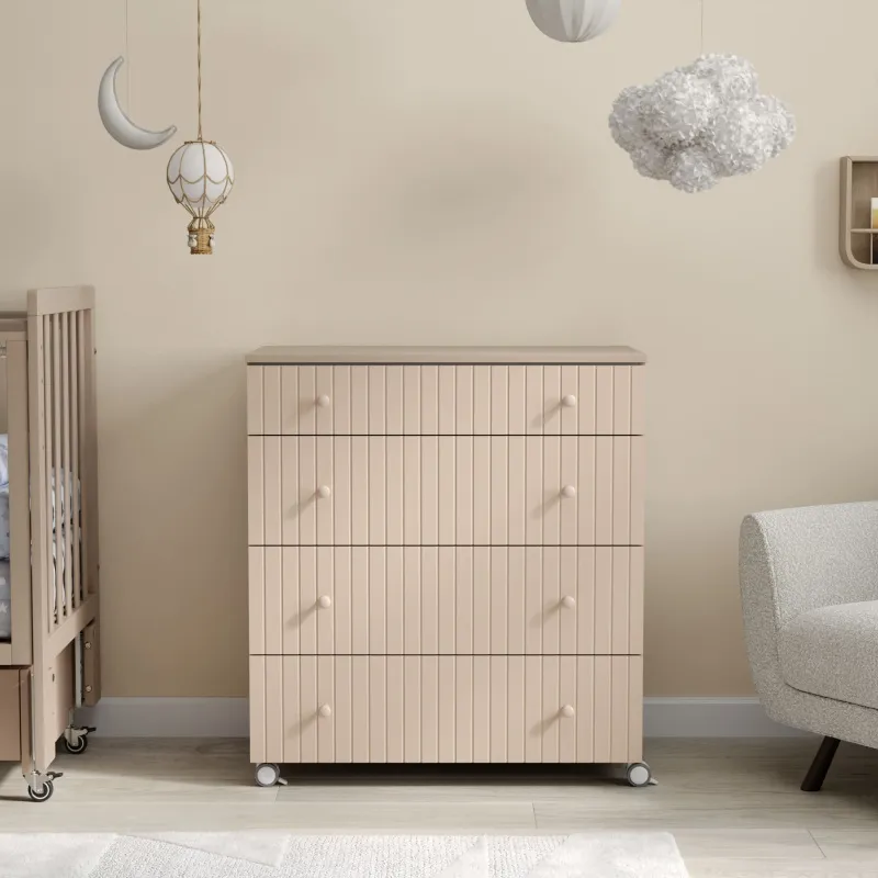 - Комод имеет колеса со стопором