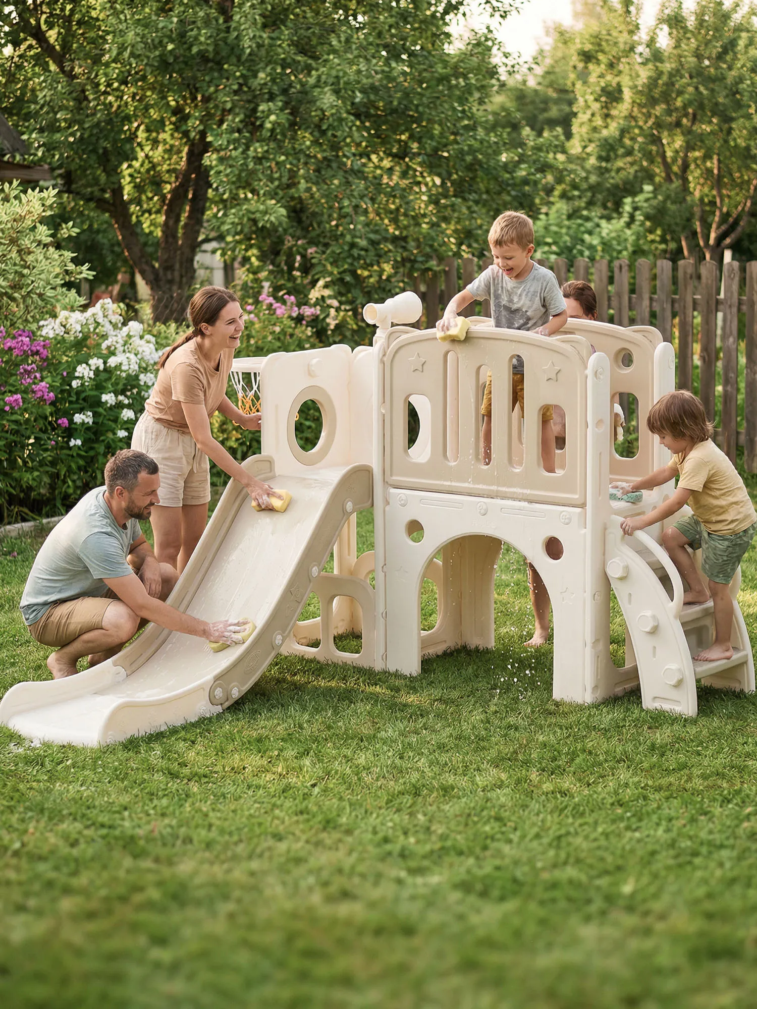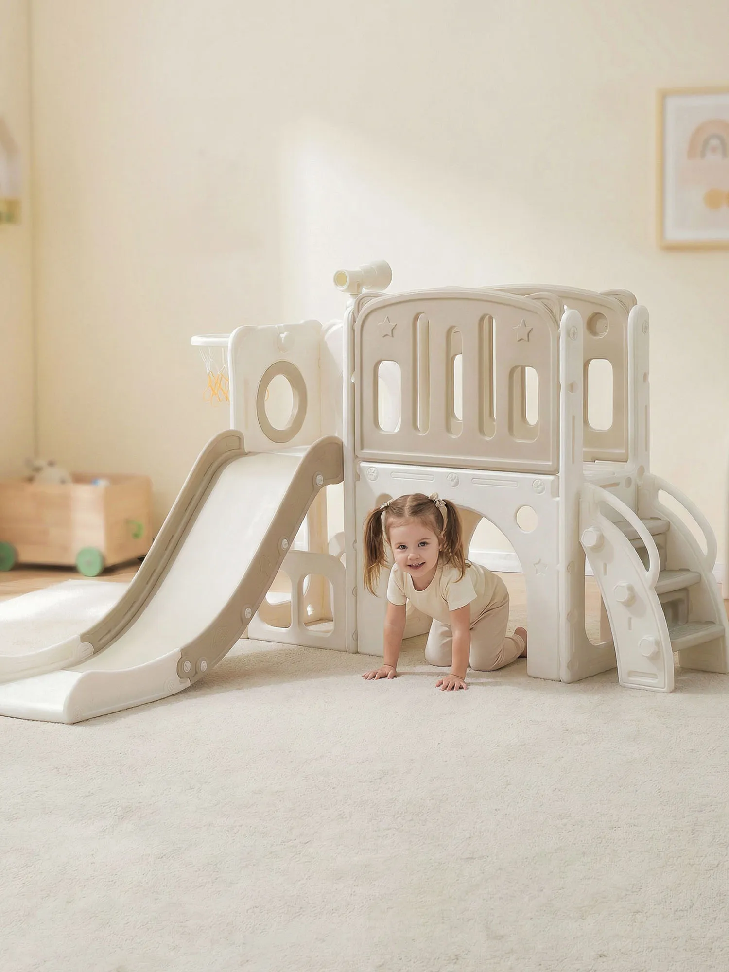 Детский комплекс выполнен в минималистичном дизайне с применением высококачественного пищевого пластика.