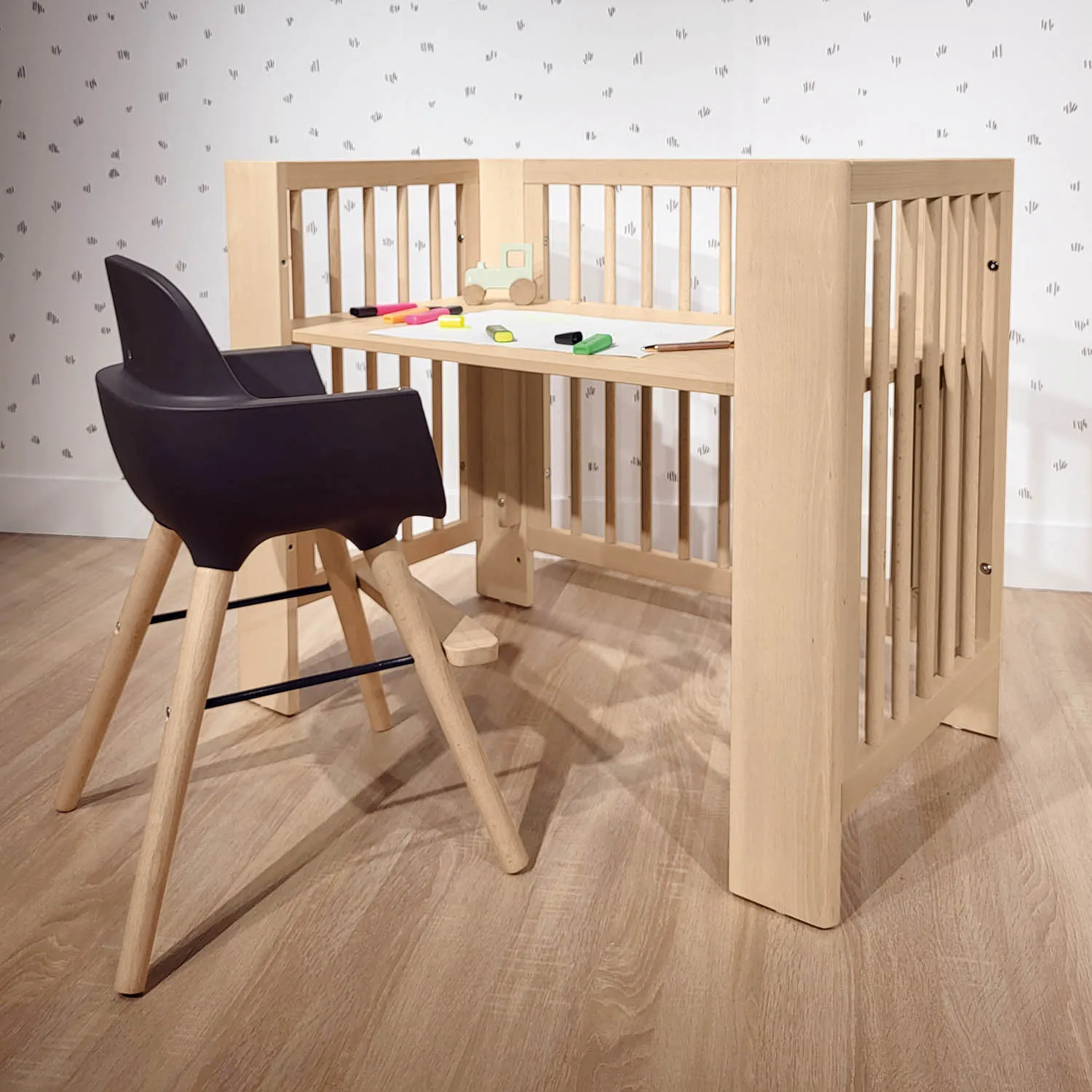 Характеристики: трансформируется в кровать с перилами или без них, высокий диван, диван Монтессори, детский игровой манеж, игровой стол и письменный стол / С 4 колесиками, 4 из которых с тормозами / Складная боковина с быстрой и простой системой крепления