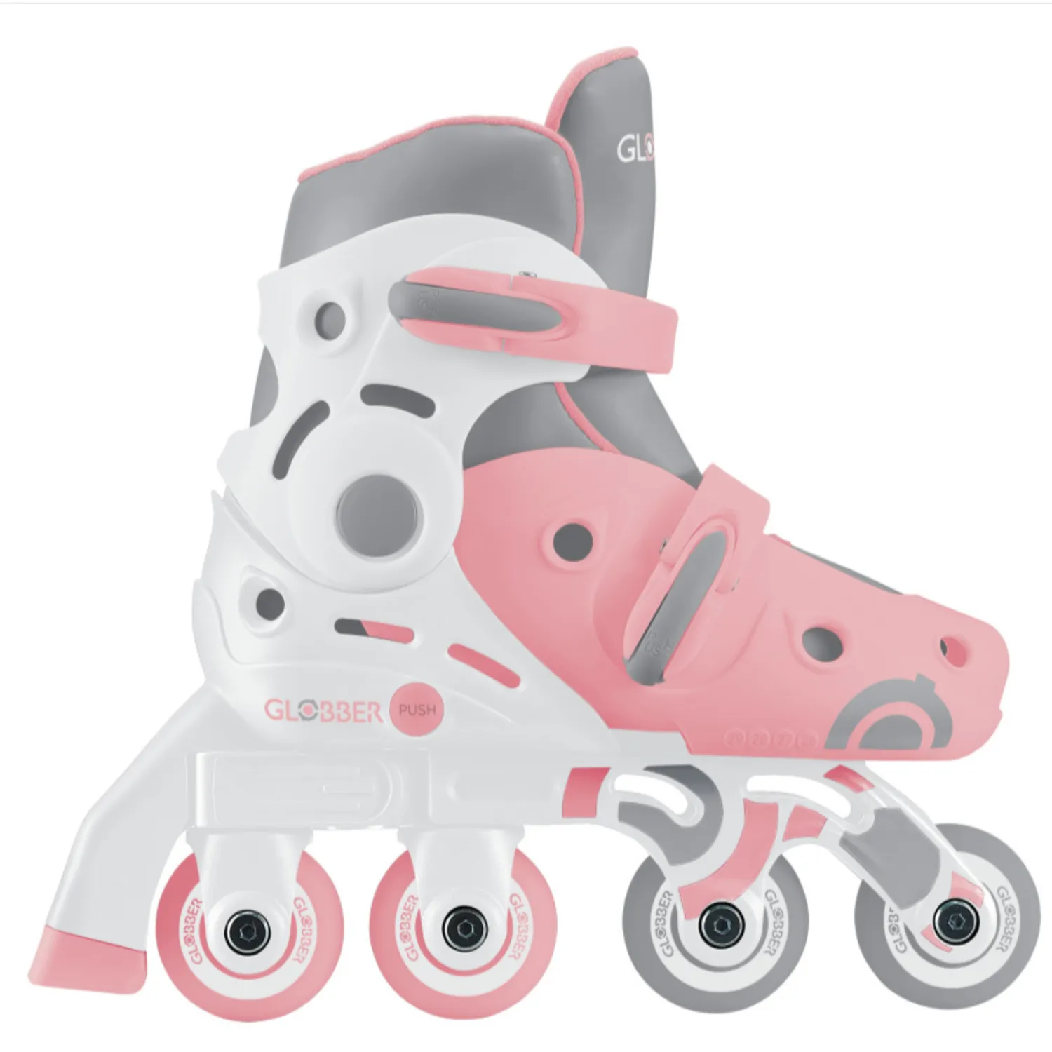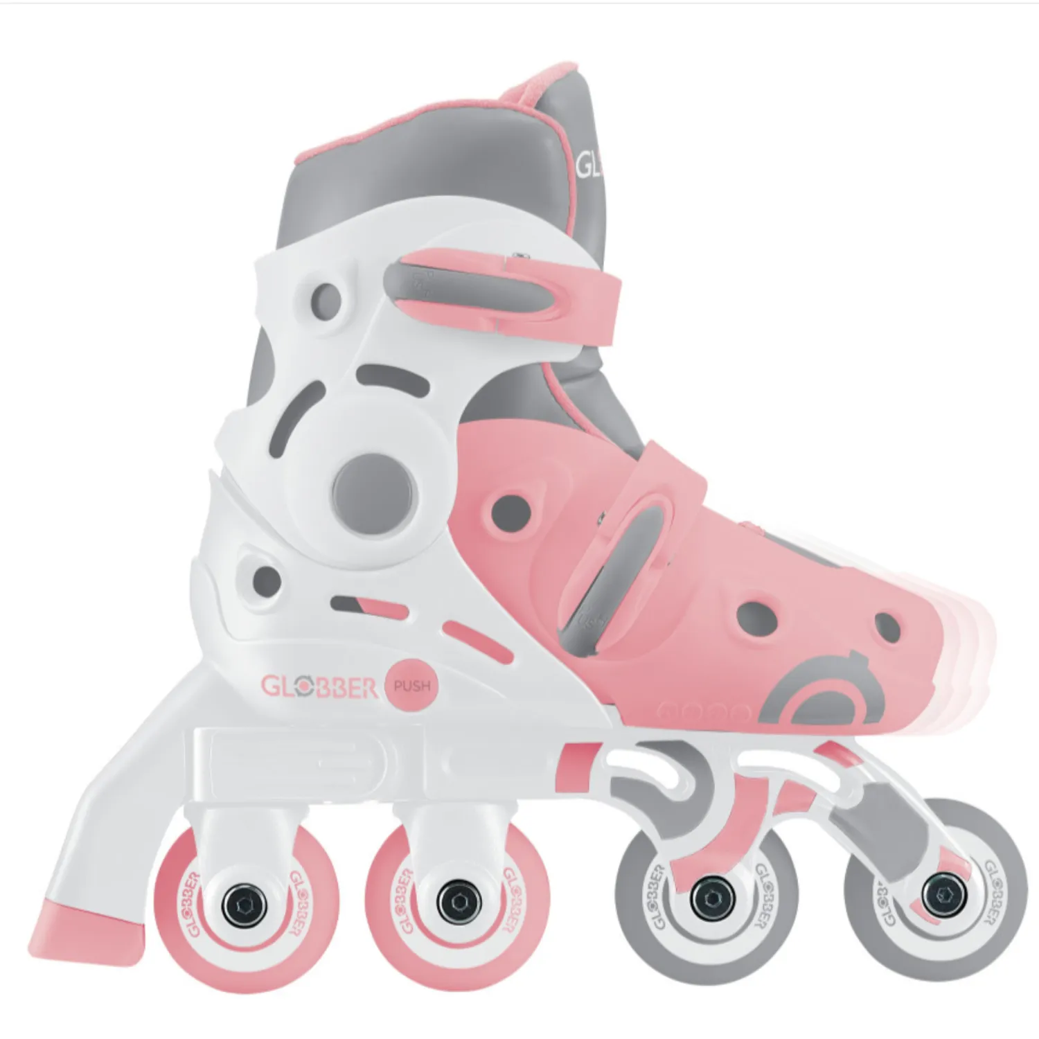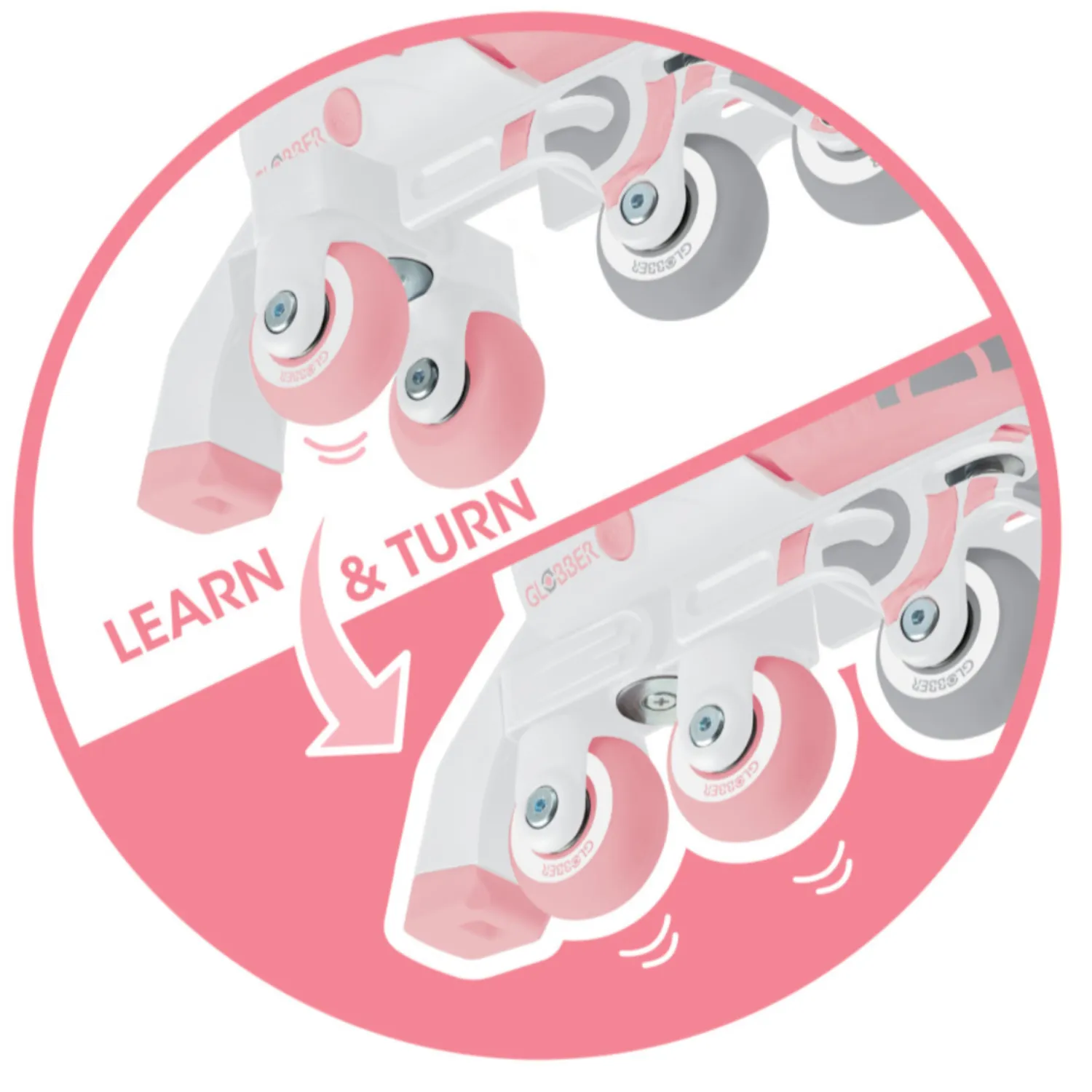 Роликовые коньки GLOBBER 2 в 1 с инновационным вращающимся модулем заднего колеса позволяет легко переключатся между двумя режимами: учебным (2 колеса вдоль, 2 поперек) и линейным.
