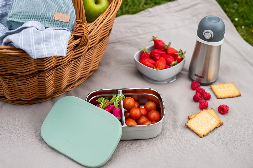 Контейнер из нержавеющей стали с силиконовой крышкой, защитным силиконовым чехлом и вставками-делителями из силикона. Ланчбокс из нержавеющей стали: материала, пригодного для хранения пищевых продуктов, без передачи вкуса или запаха и без окрашивания. Экологичный, прочный, небьющийся материал: здоровая альтернатива пластиковым коробкам. Легкий и прочный: практичный в переноске, идеально подходит для маленьких детей. Большая вместимость: может вместить полноценный обед или перекус на пикник. Две съемные силиконовые перегородки позволяют создавать отсеки по вашему желанию. Съемный силиконовый чехо обеспечивает хороший захват, предотвращает скольжение ланчбокса по столу и защищает его от падения. Легко мыть руками или в посудомоечной машине в деликатном режиме. Не содержит BPS и фталатов.