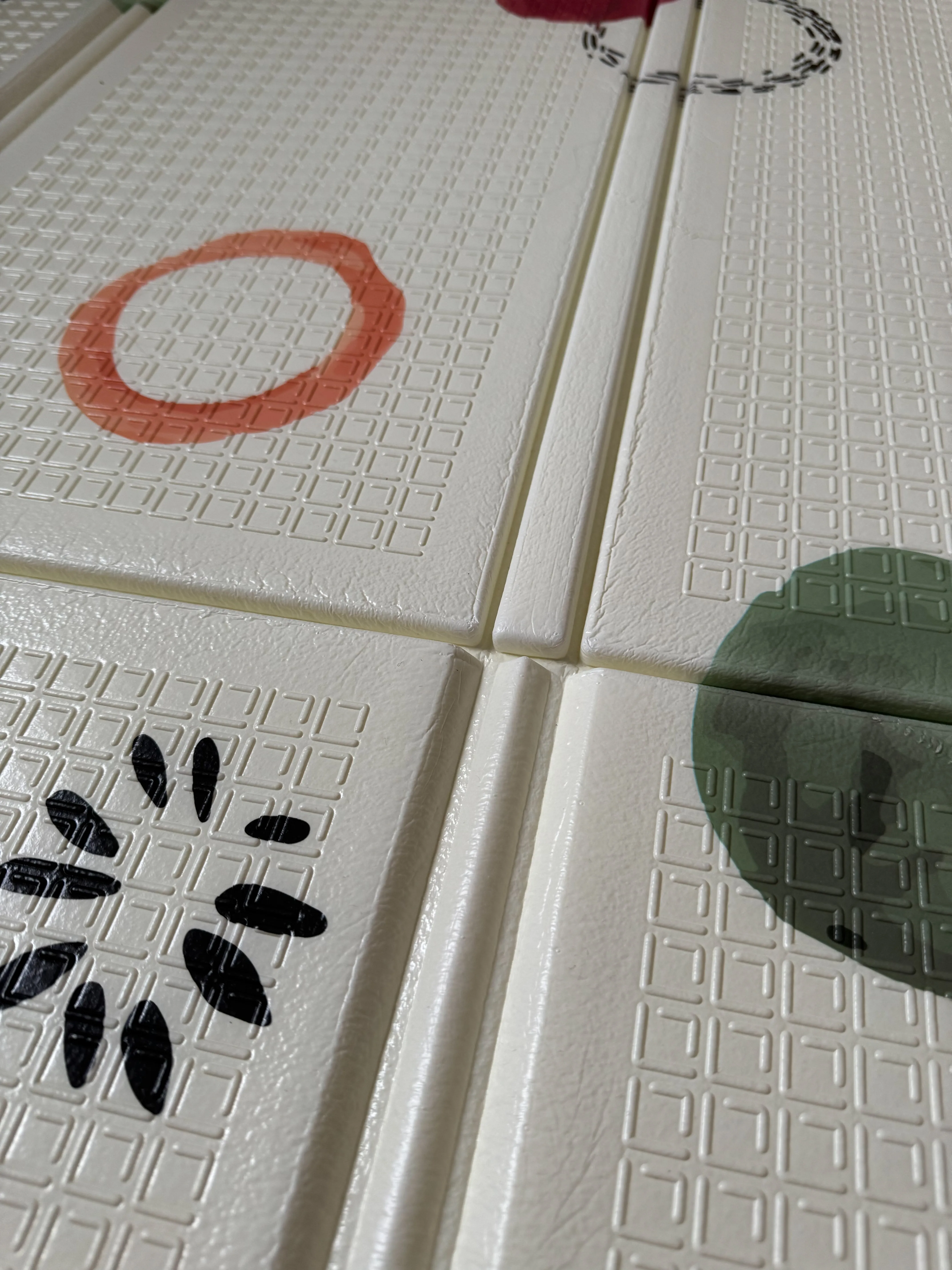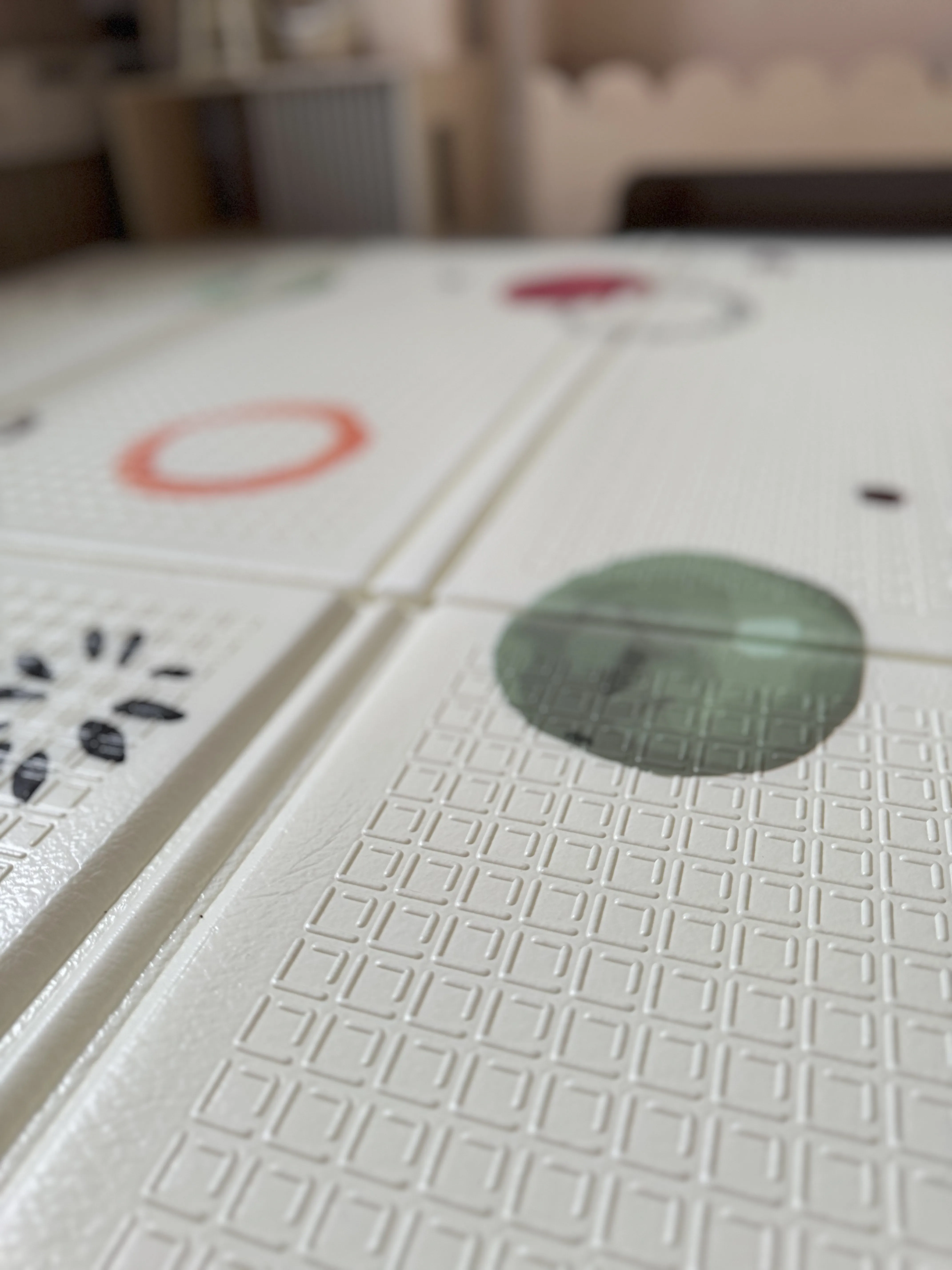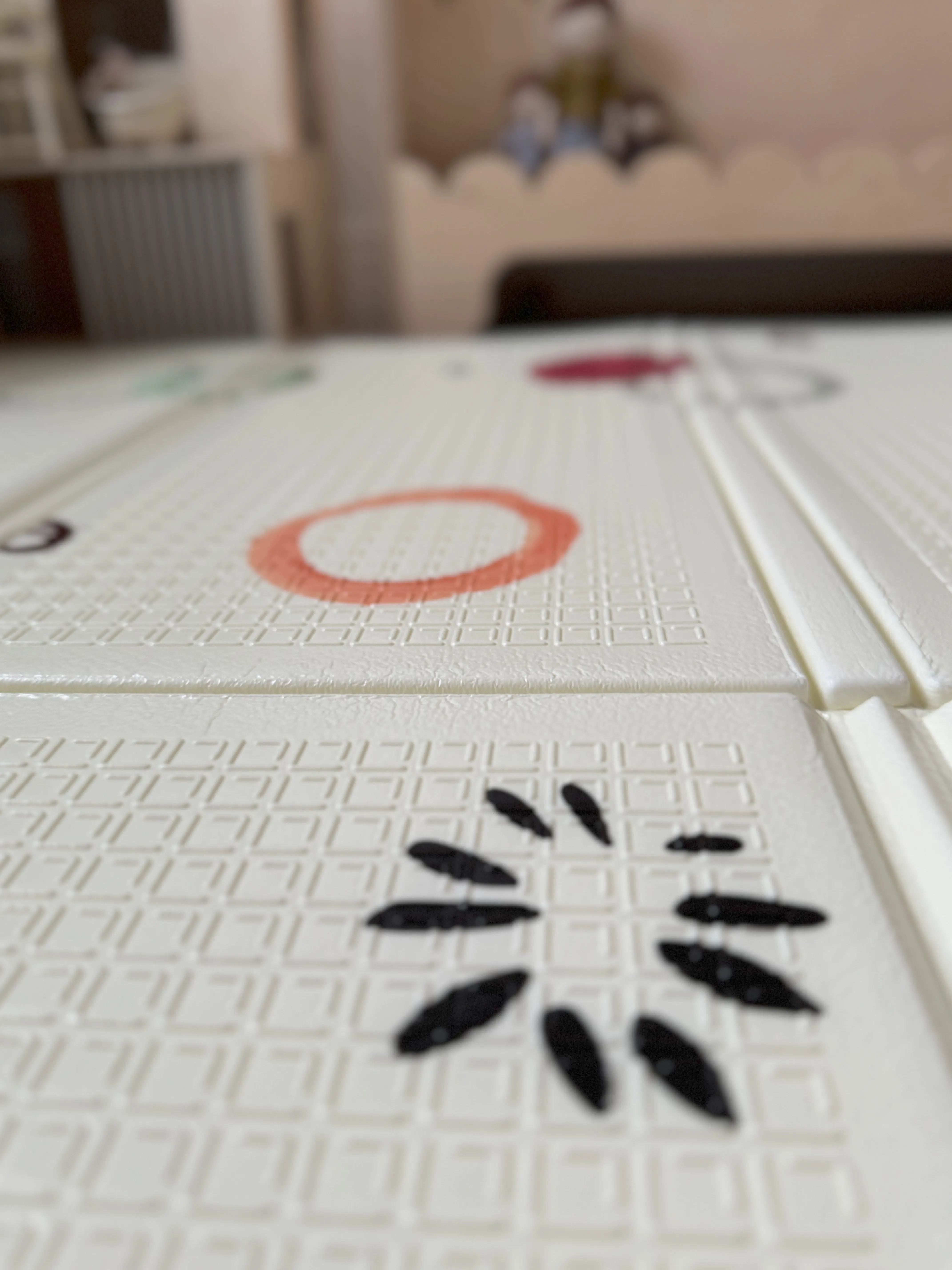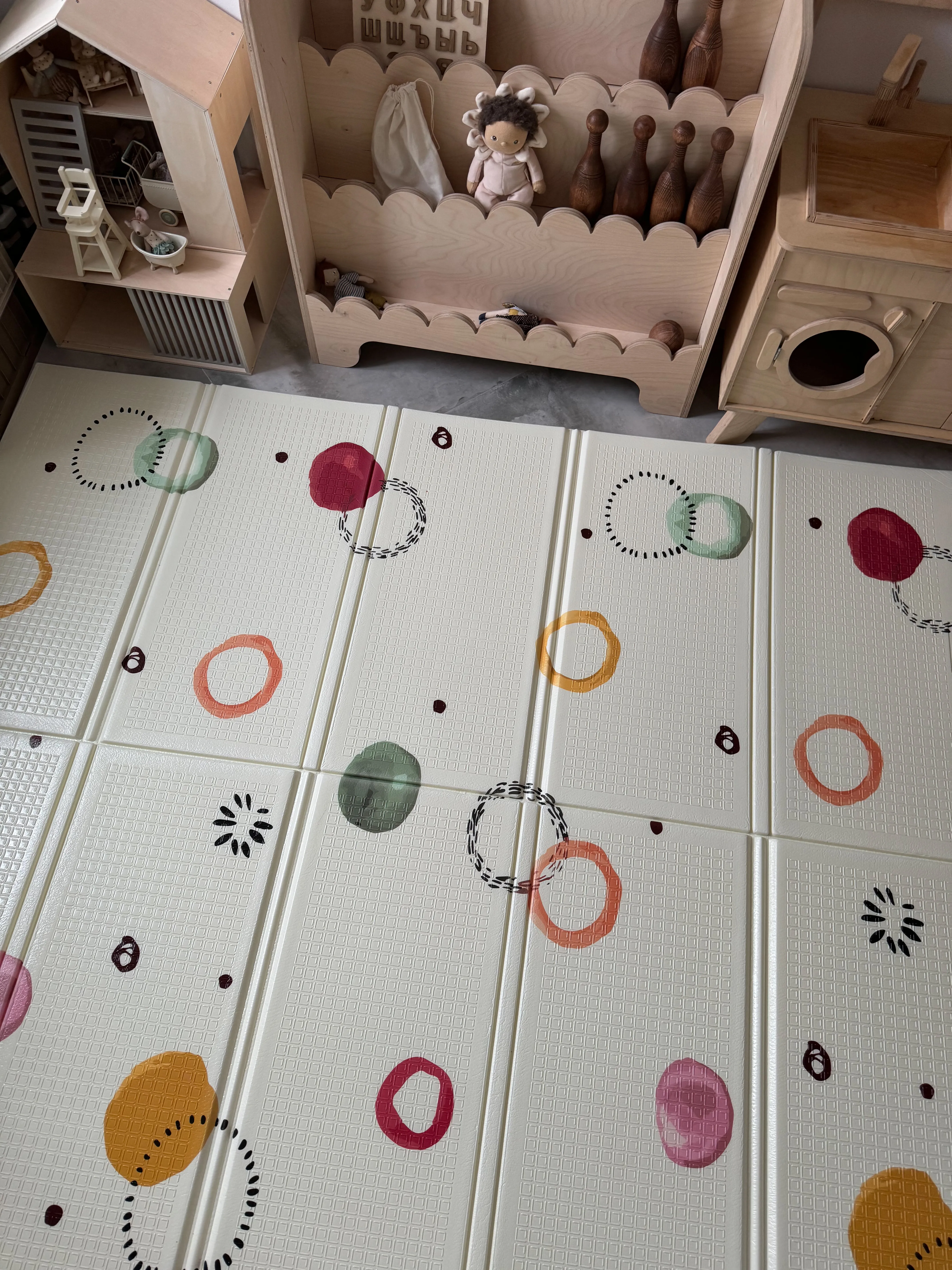 Рисунок нанесен на одну сторону, низ однотонный. Влагостойкое изделие легко мыть и дезинфицировать, в отличие от обычного ковра. Раскладной дизайн очень практичен в большом доме – перейти с малышом из детской комнаты в гостиную или на кухню не составит труда. Складной коврик удобно взять в дорогу или на улицу, поскольку в сложенном виде он занимает минимум пространства. Чистое игровое место всегда с собой!