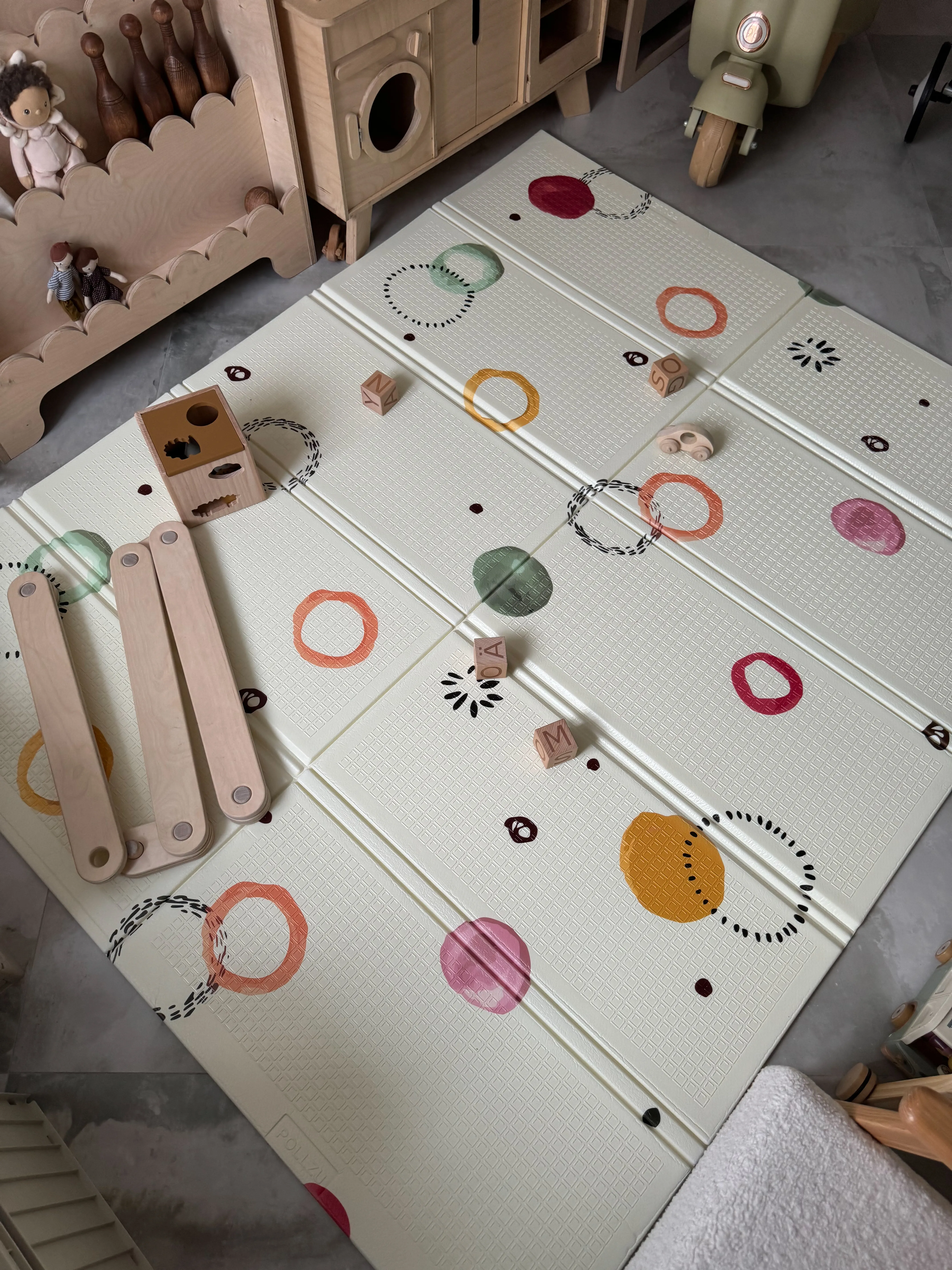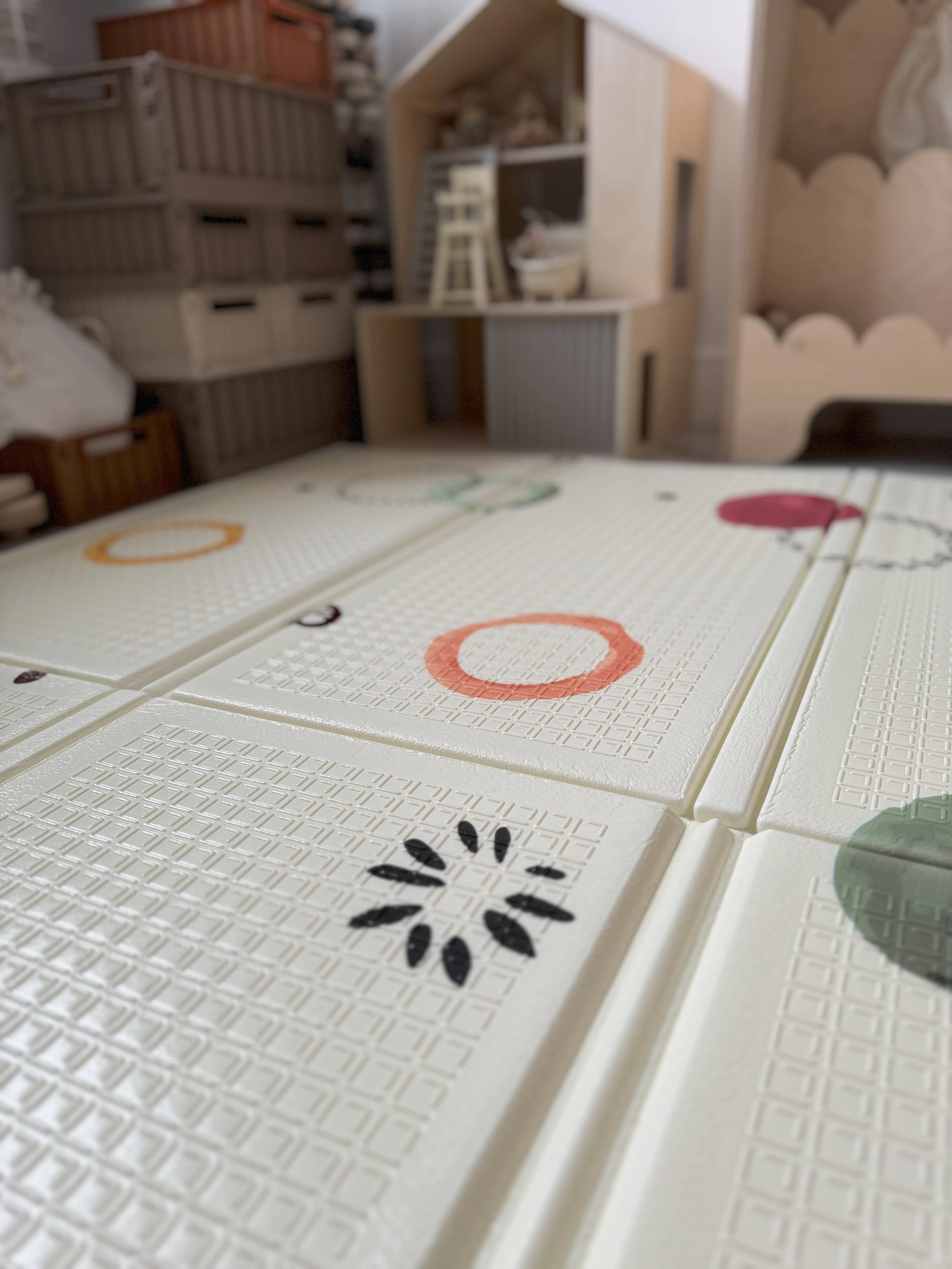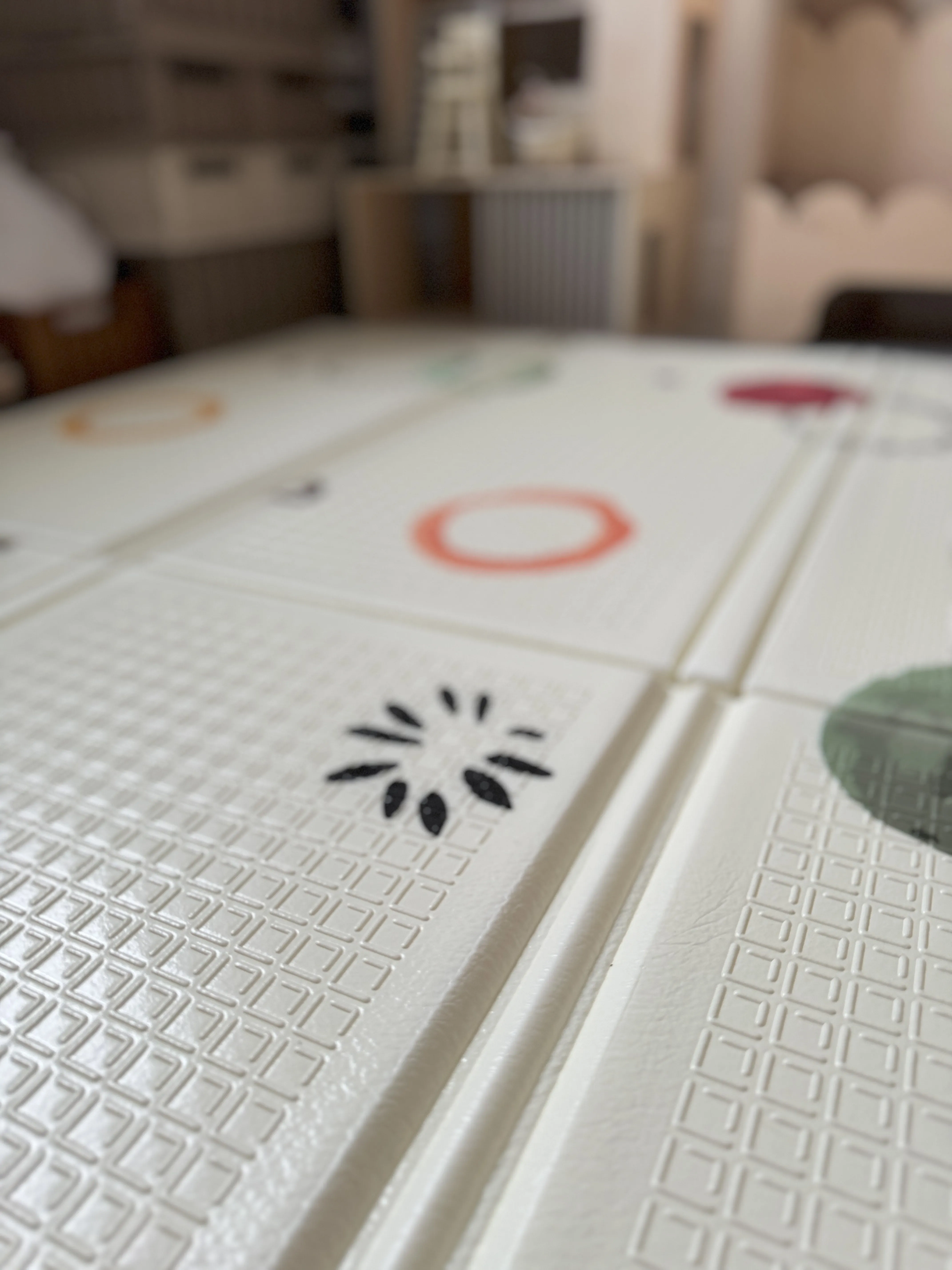 Рисунок нанесен на одну сторону, низ однотонный. Влагостойкое изделие легко мыть и дезинфицировать, в отличие от обычного ковра. Раскладной дизайн очень практичен в большом доме – перейти с малышом из детской комнаты в гостиную или на кухню не составит труда. Складной коврик удобно взять в дорогу или на улицу, поскольку в сложенном виде он занимает минимум пространства. Чистое игровое место всегда с собой!