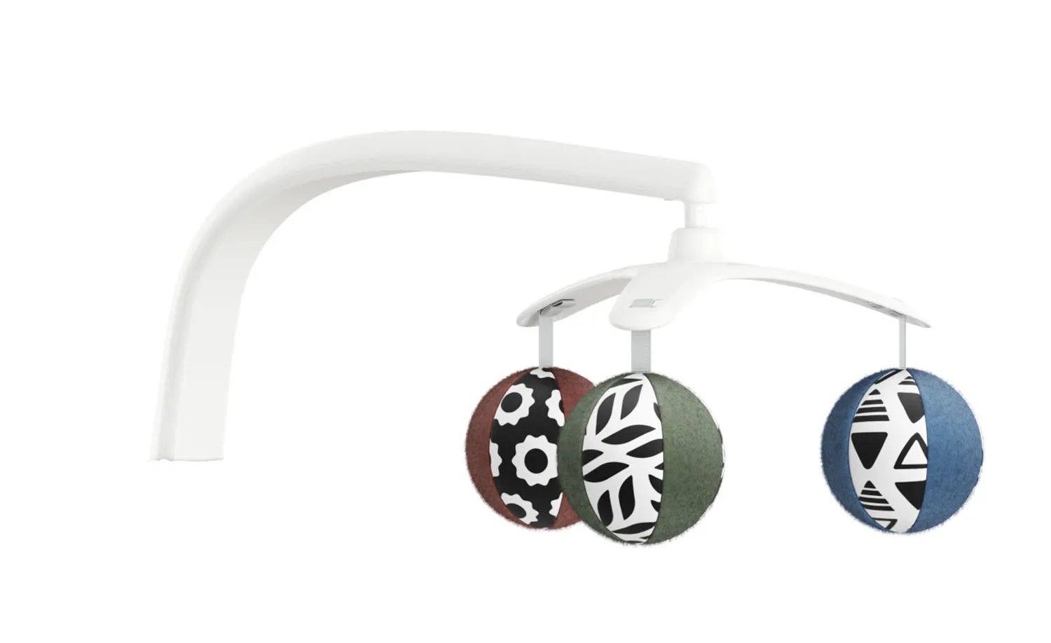 Занимательный мобиль с игрушками-шариками, выполненными в цветах и узорах, способствует развитию малыша.