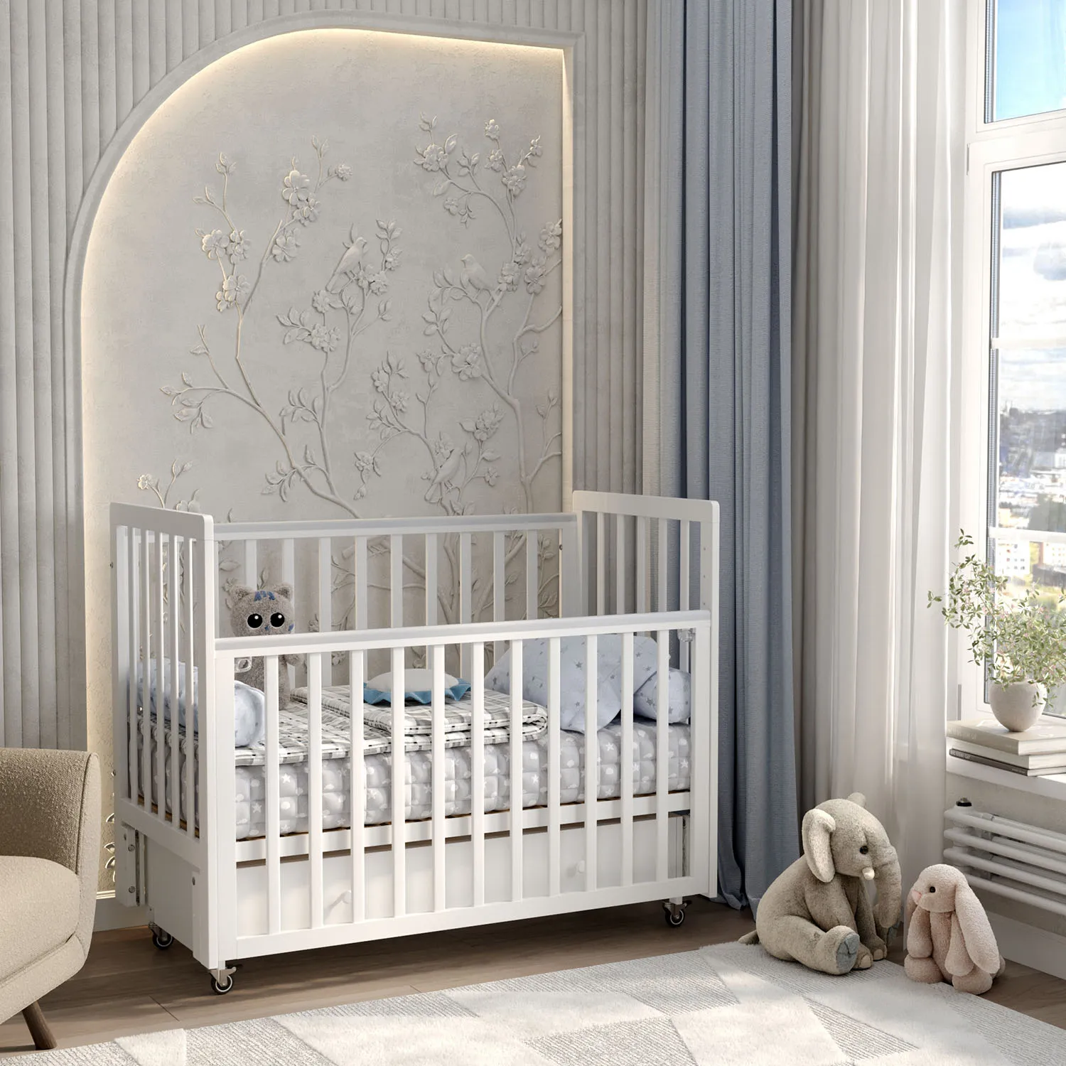 - Высота уровней ложа для кроватки на колёсах: 34 см, 41 см, 44 см, 51 см, 54 см, 60 см, 63 см