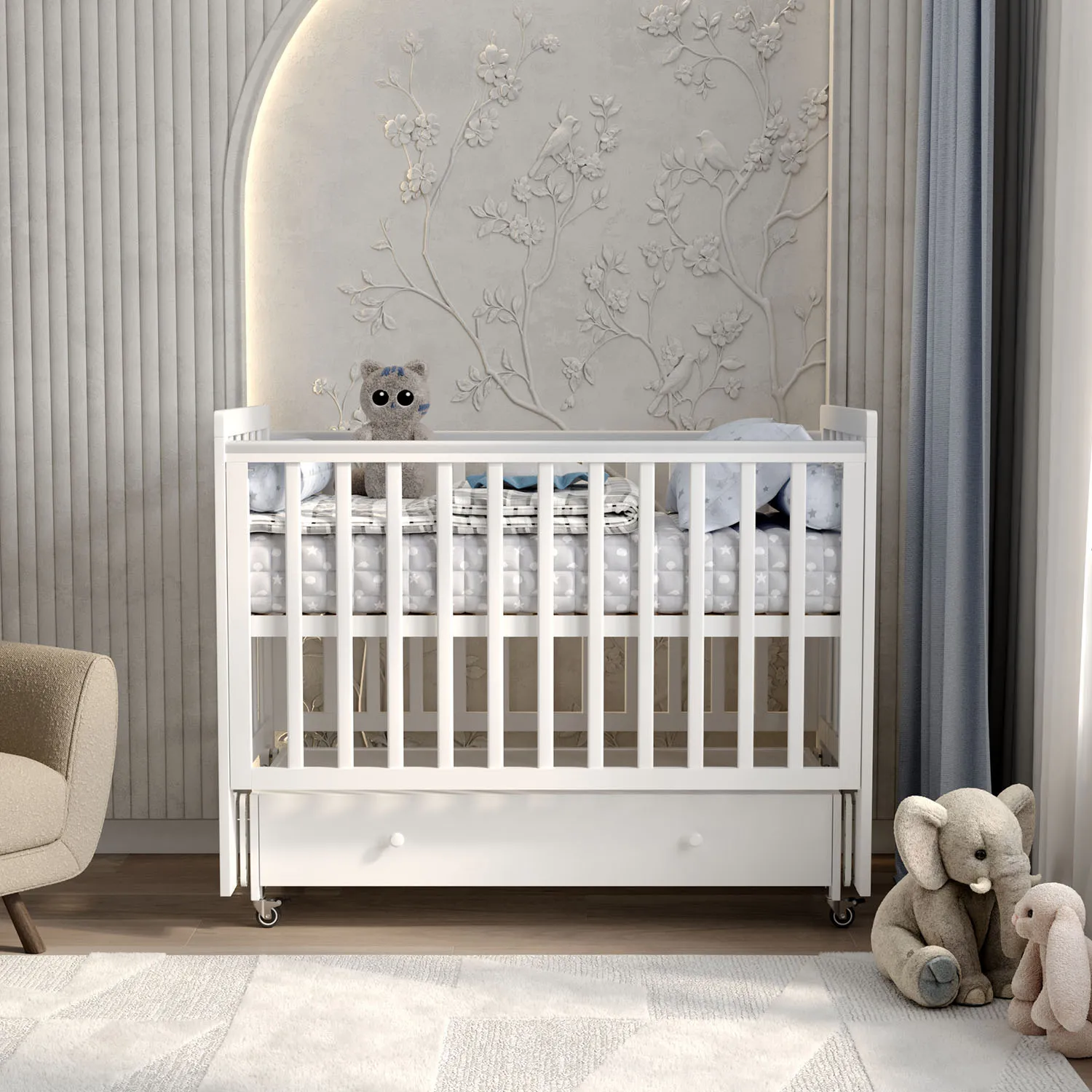 Ящик для хранения вещей и игрушек, также идет в комплекте с кроваткой и имеет шариковые направляющие полного выдвижения. Эта функция позволяет использовать всю глубину ящика.