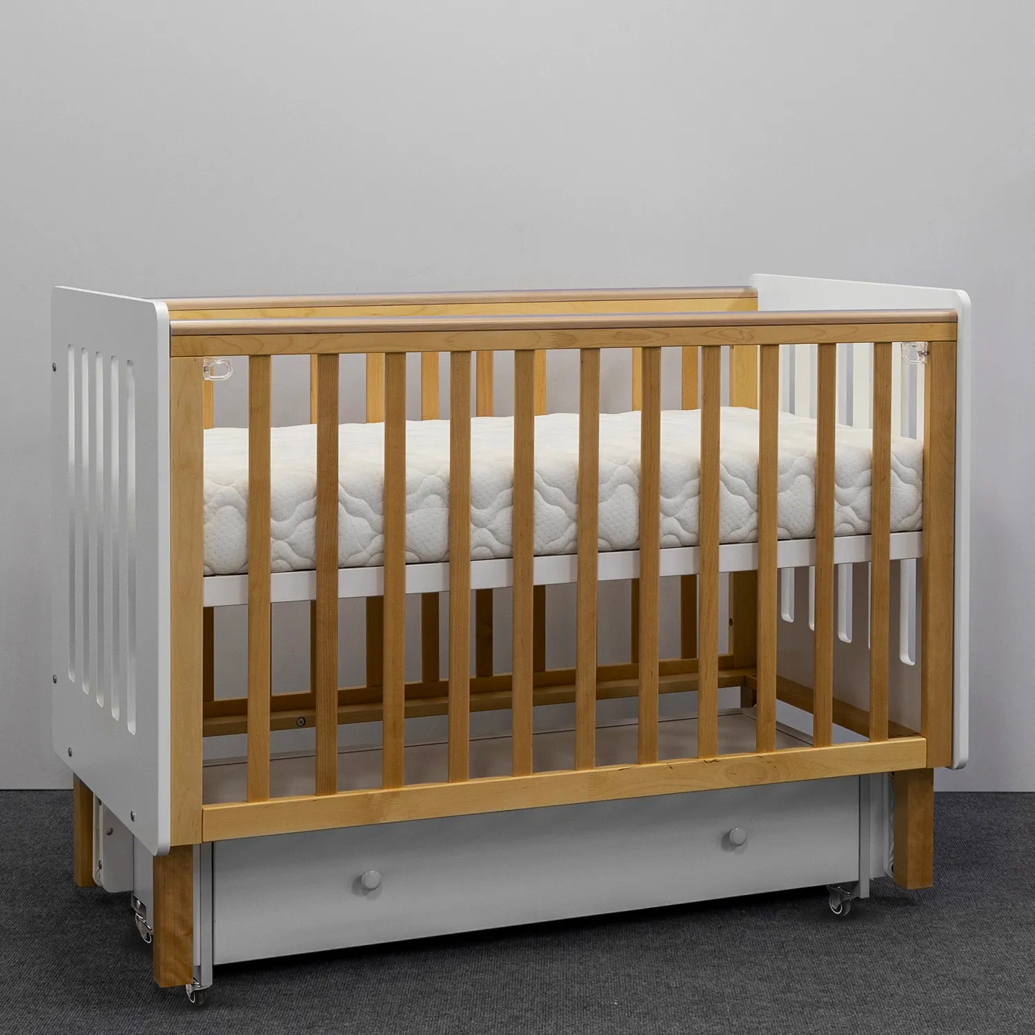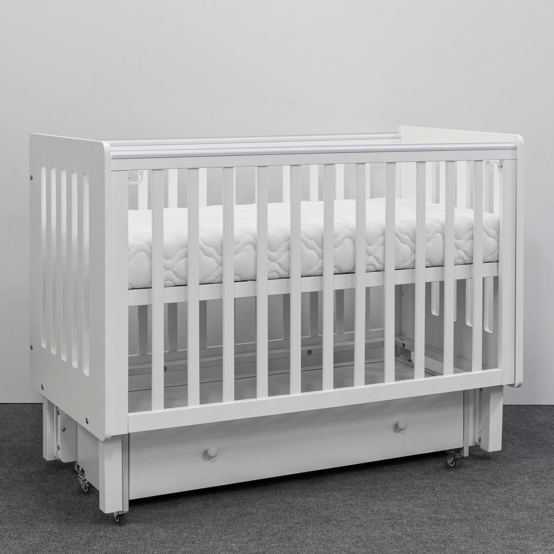 - Высота уровней ложа для кроватки на колёсах: 30, 42, 55 см