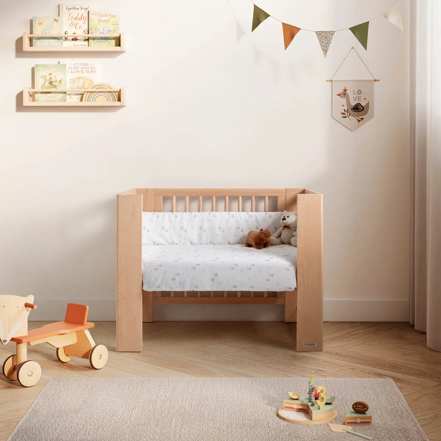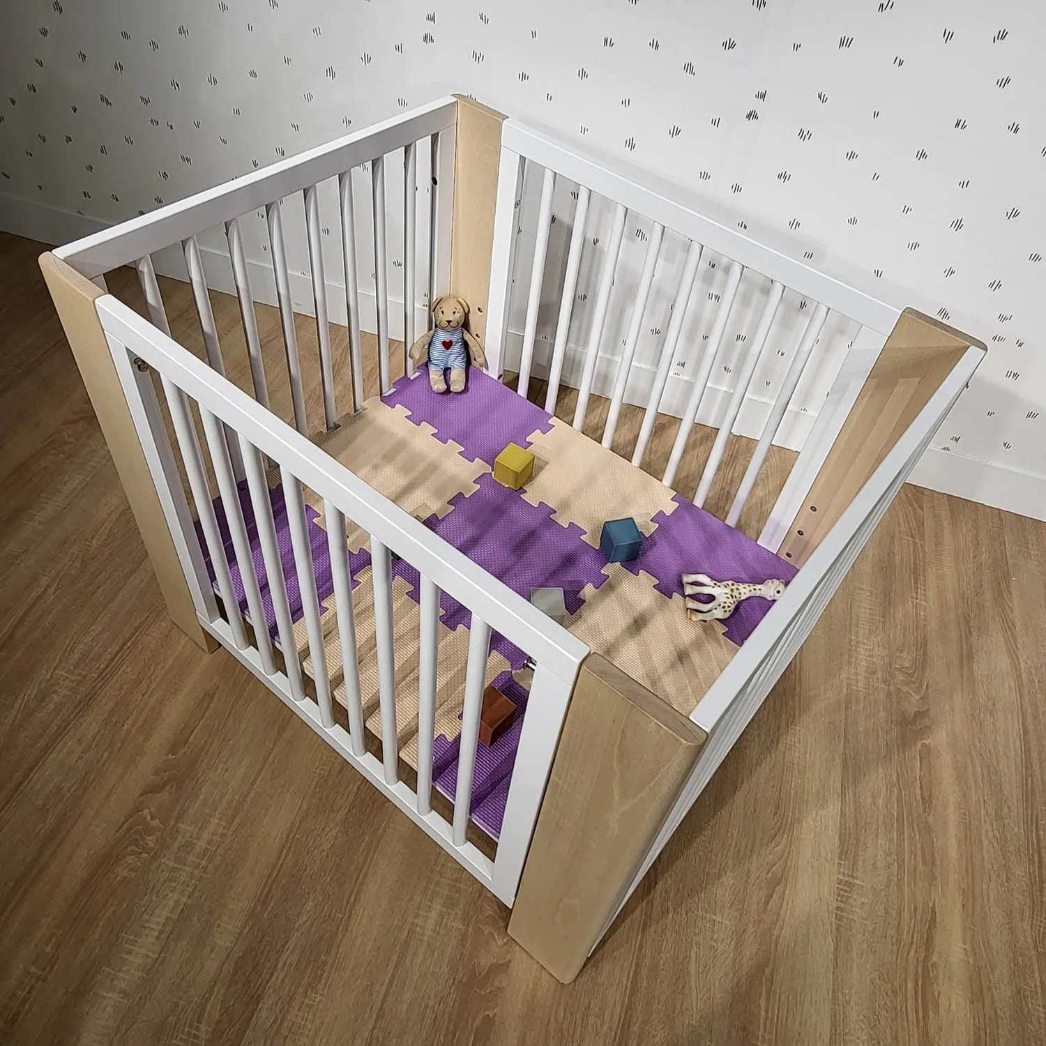 Характеристики: трансформируется в кровать с перилами или без них, высокий диван, диван Монтессори, детский игровой манеж, игровой стол и письменный стол / С 4 колесиками, 4 из которых с тормозами / Складная боковина с быстрой и простой системой крепления