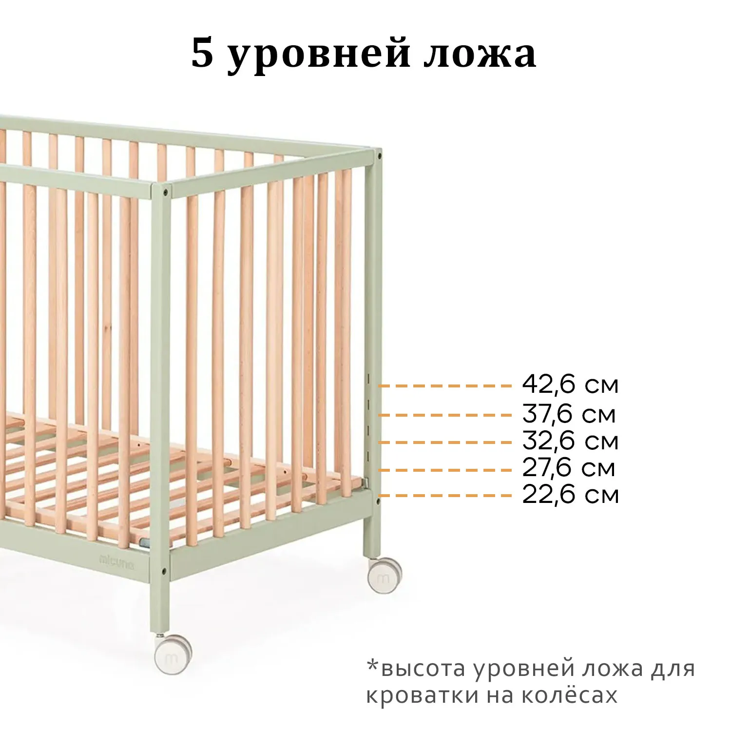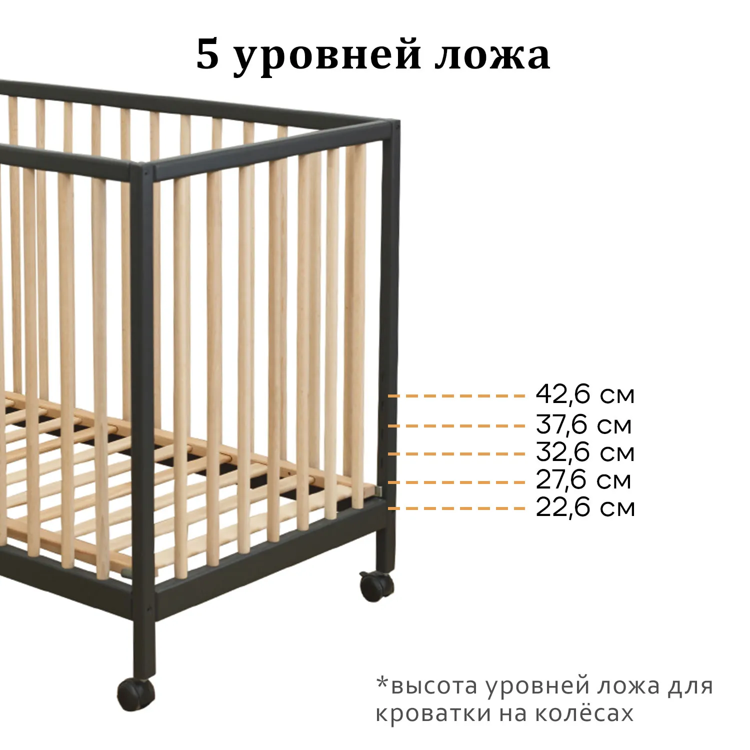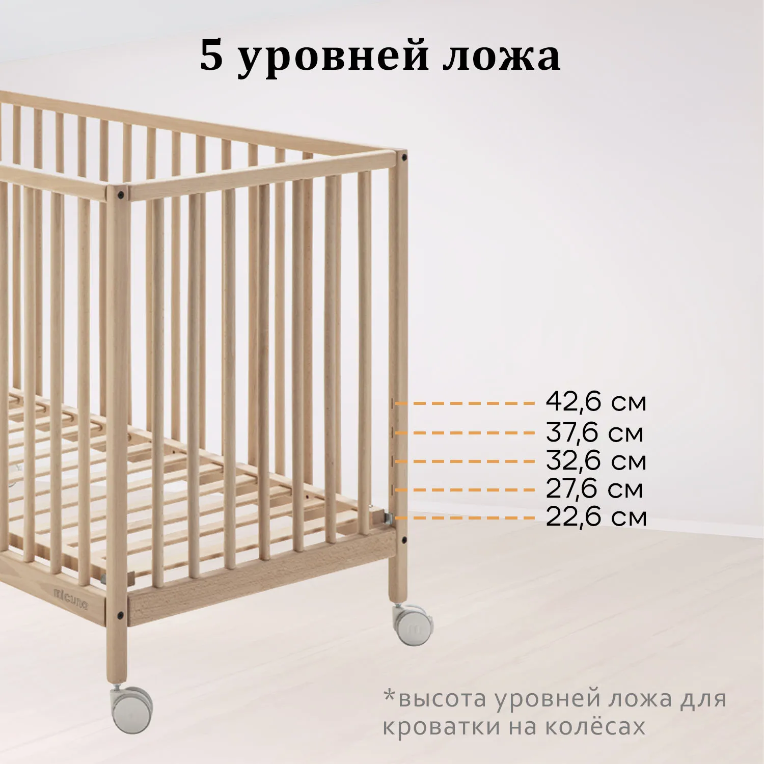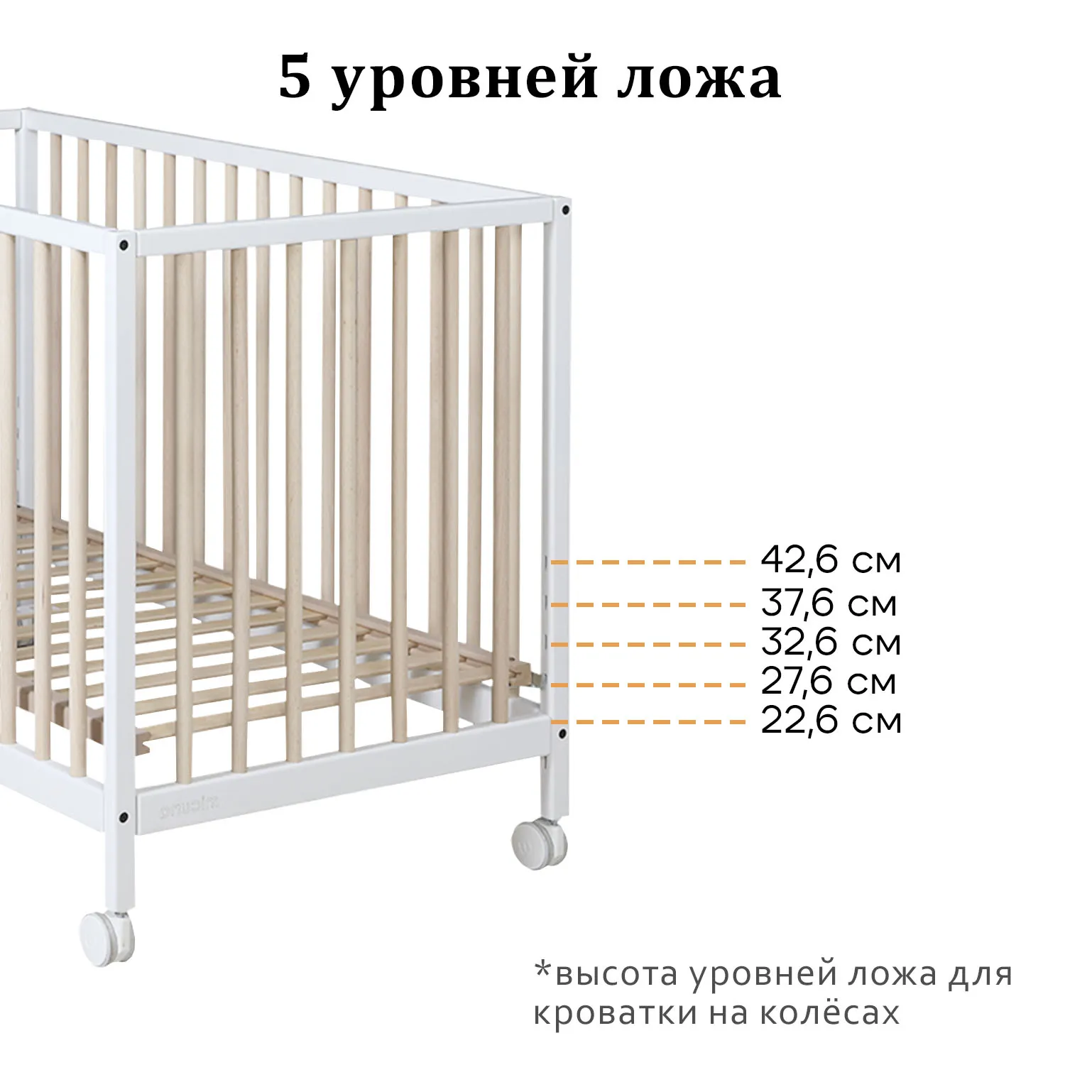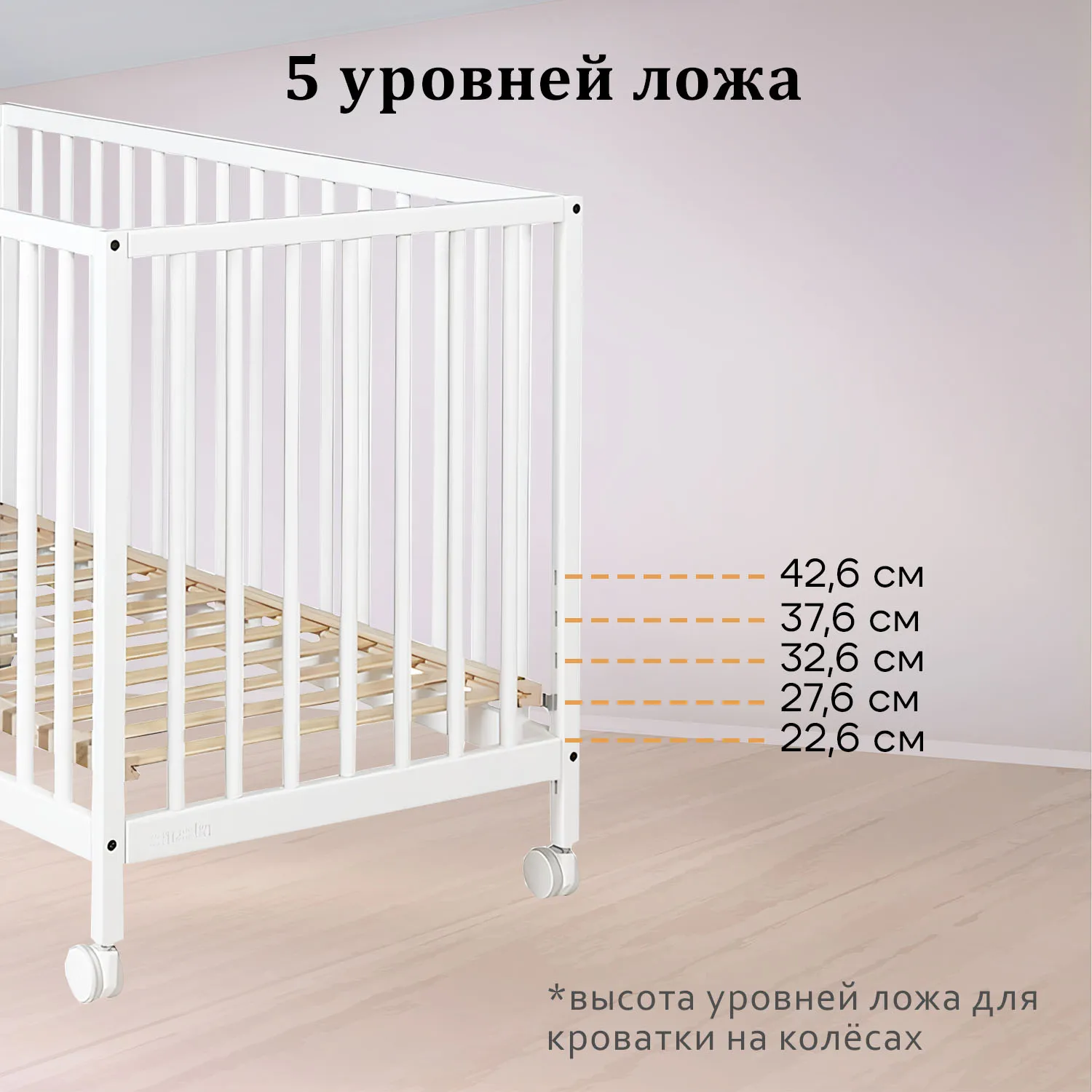 - Высота уровней ложа для кроватки на колёсах: 22.6 / 27.6 / 32.6 / 37.6 / 42.6 см