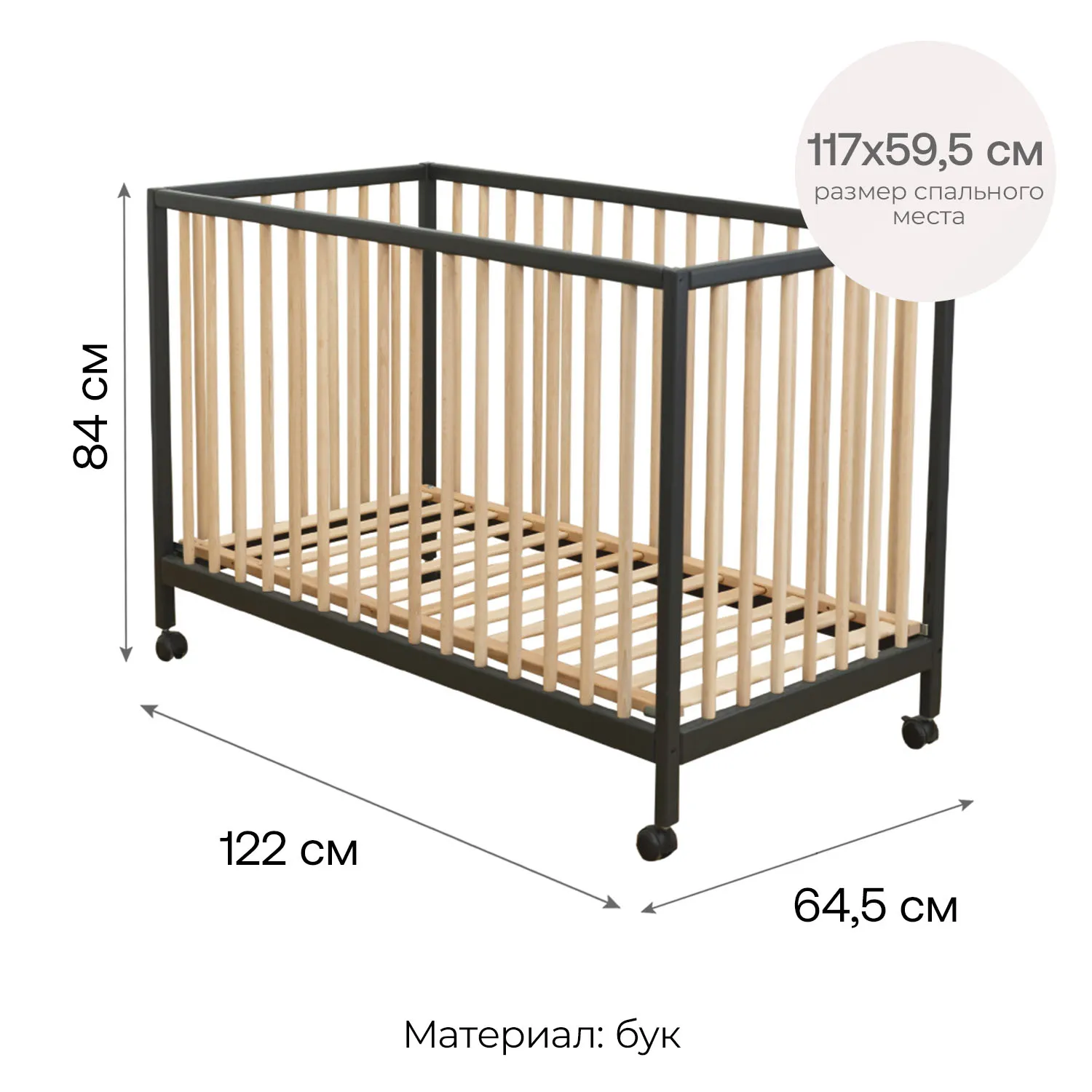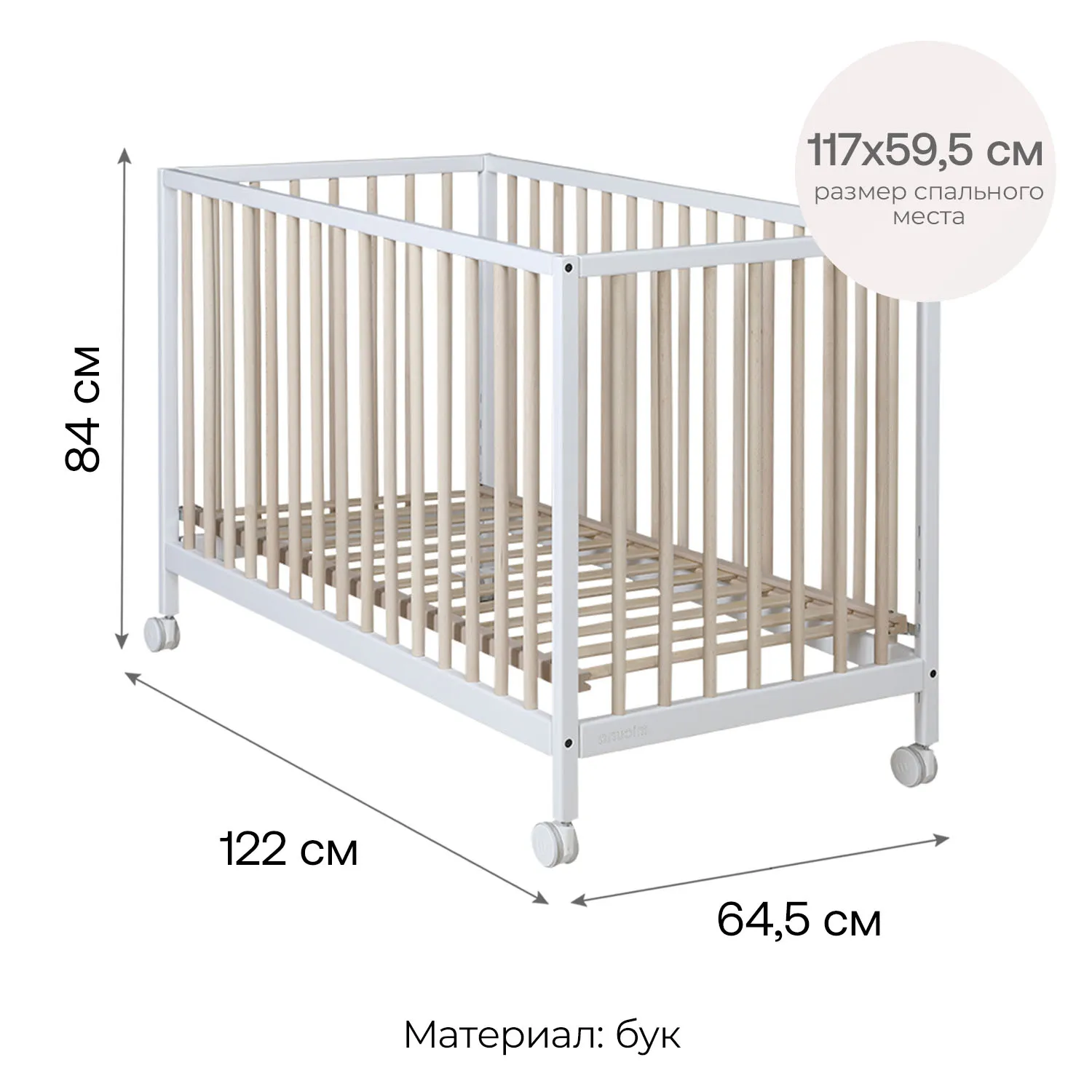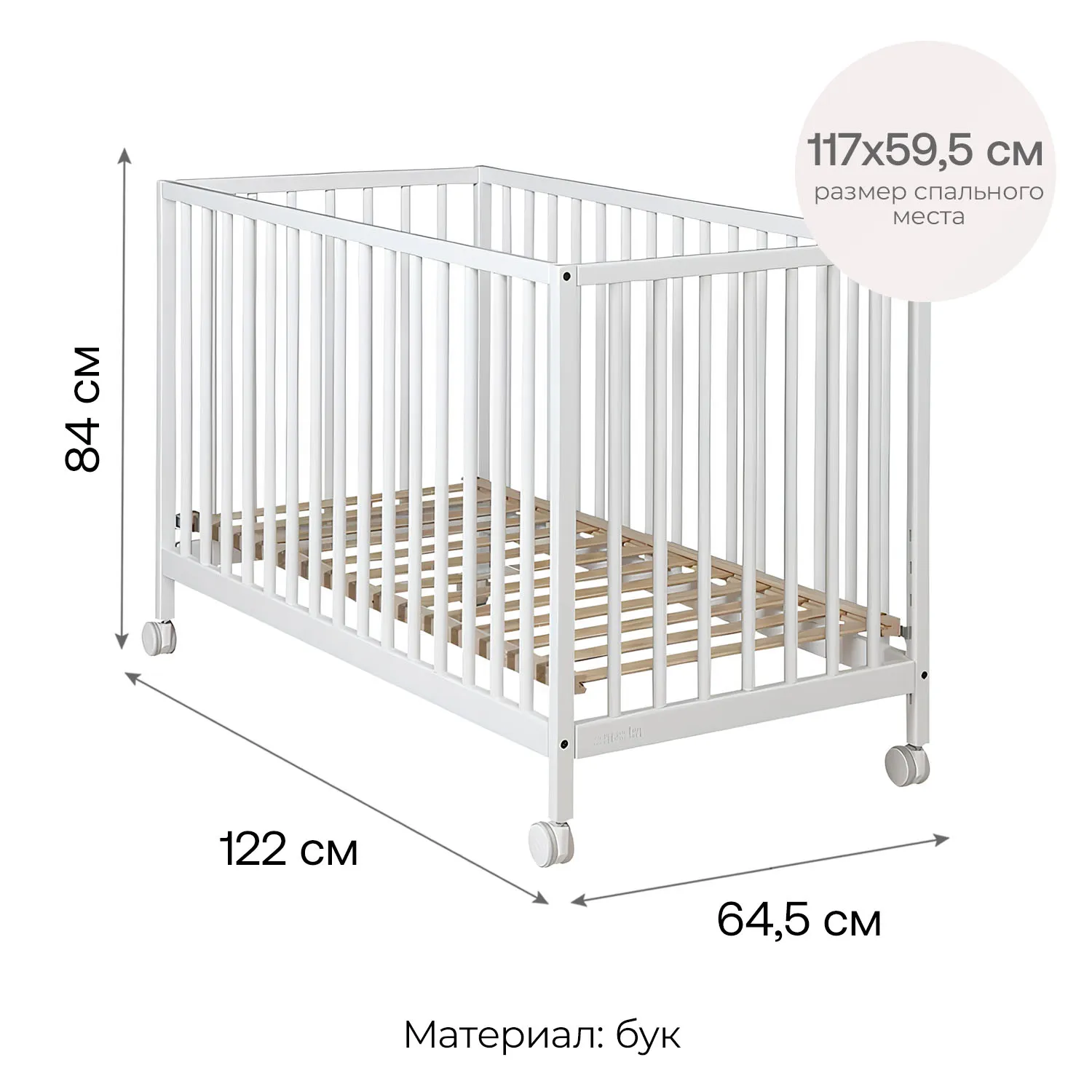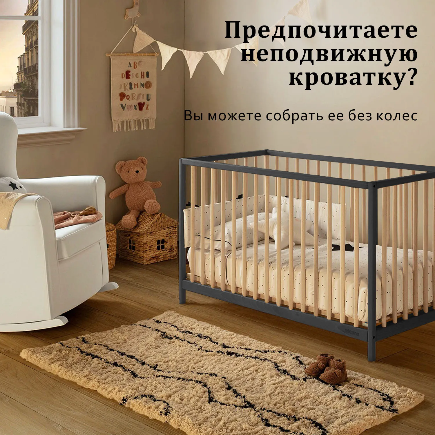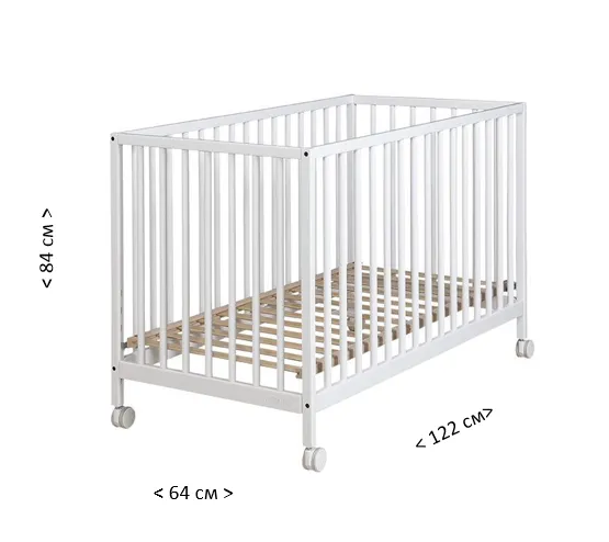 - Высота уровней ложа для кроватки на колёсах: 22.6 / 27.6 / 32.6 / 37.6 / 42.6 см