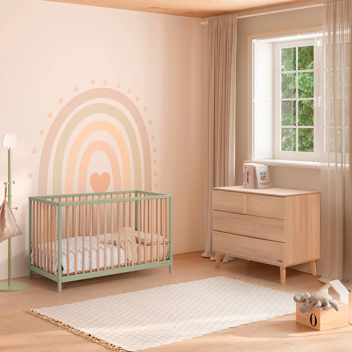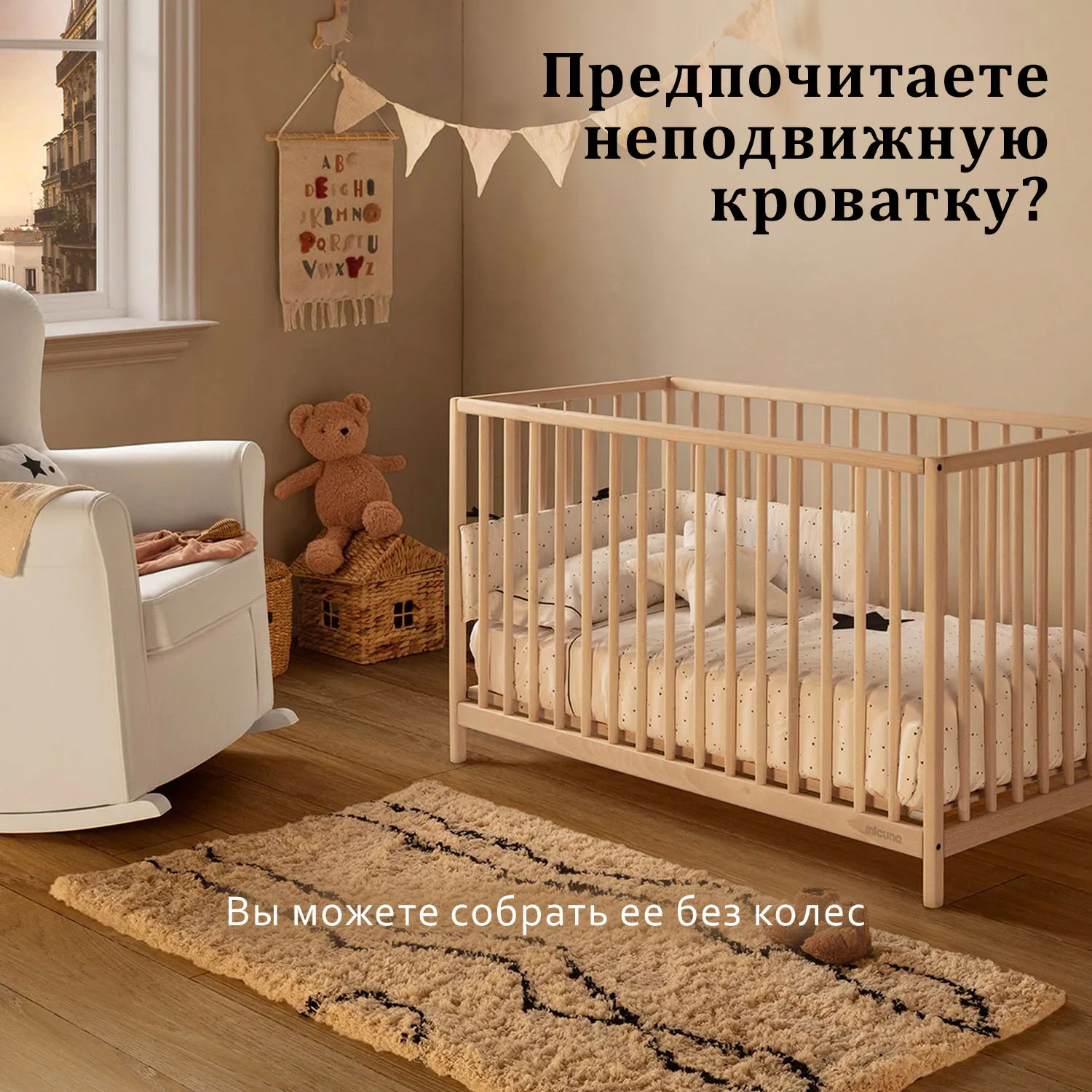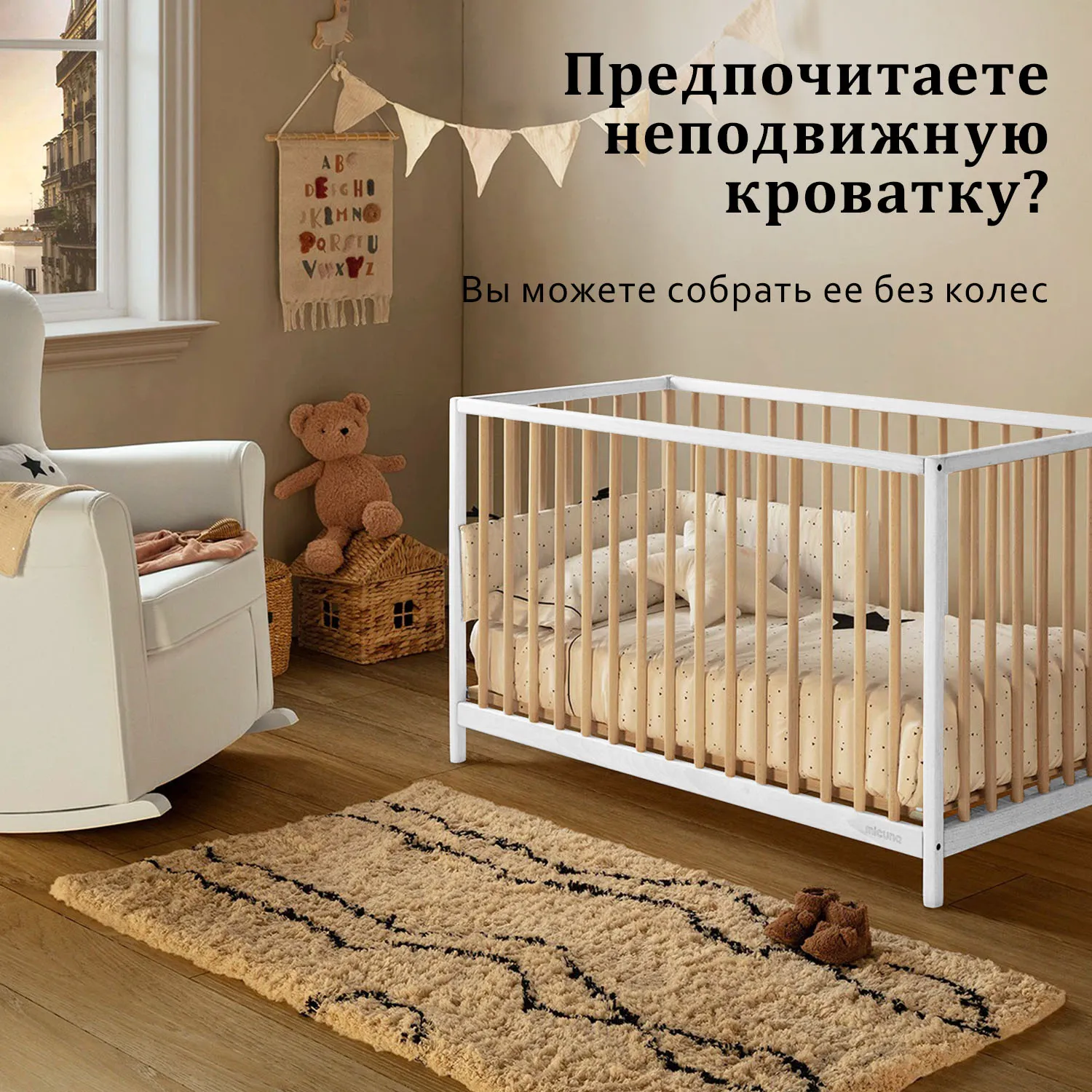 Кроватка Micuna Nordika оснащена поворотными колесиками, два из которых имеют стопор. Благодаря им вы сможете без труда поменять место кроватки в комнате, либо поместить ее в другую комнату при необходимости. Когда ребенок подрастет, колеса можно снять, оставив статичные ножки.