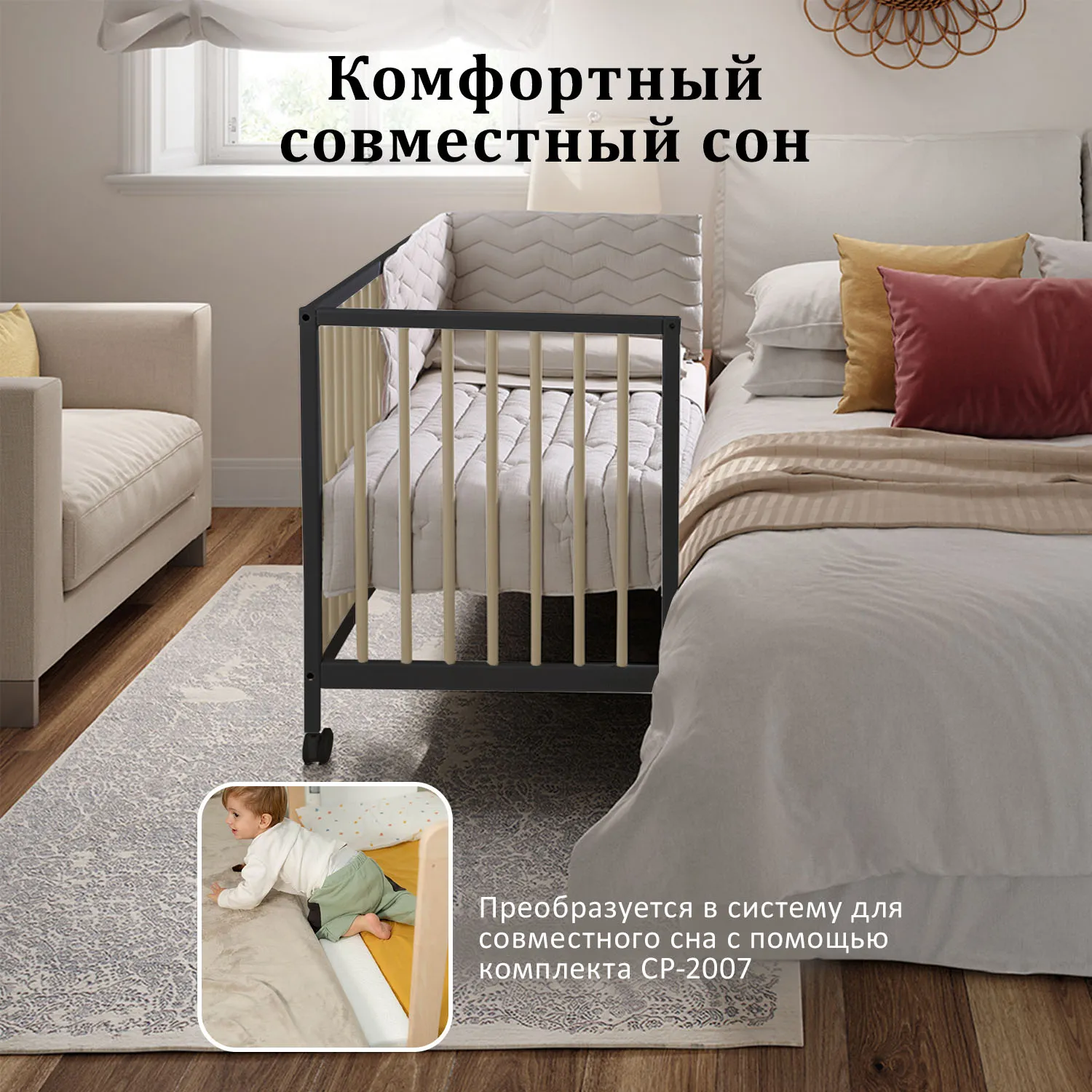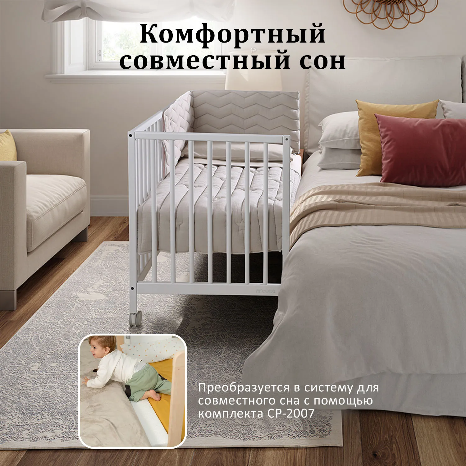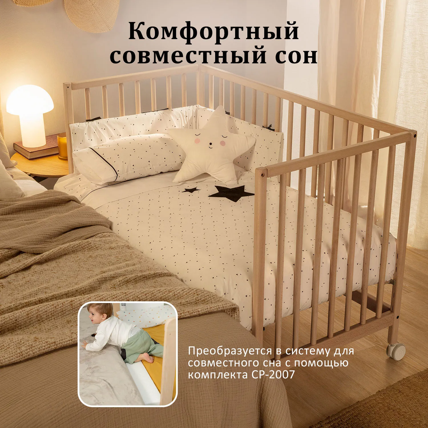 Если вы планируете совместный сон, необходимо приобрести опцию CP-2007. Она представляет собой комплект креплений и планки, с помощью которых можно превратить кроватку в приставную, чтобы малыш спал рядом с родителями.
