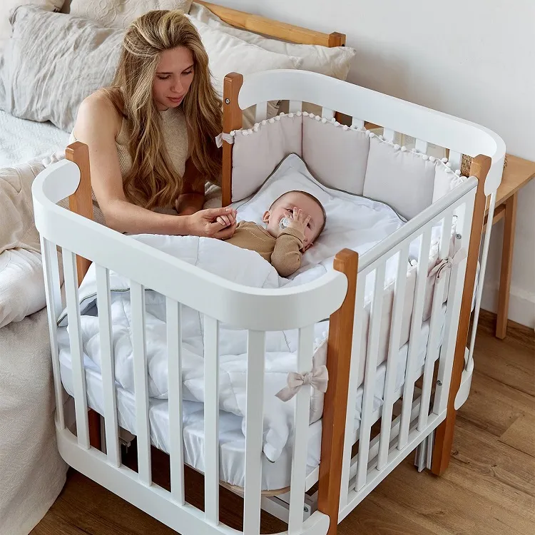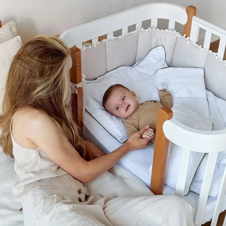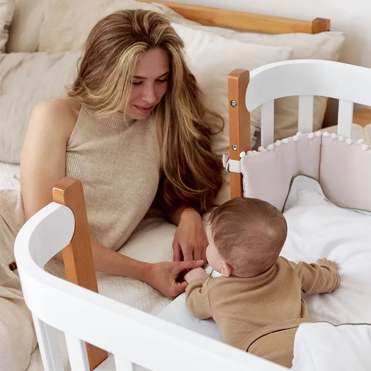 Люлька дарит вам возможность чувствовать и видеть каждый вздох крохи – просто уберите перегородку и придвиньте люльку вплотную к кровати родителей. Чтобы люлька не отодвинулась от взрослой кровати, в комплект включены два фиксирующих ремешка. Вам будет удобно покормить малыша, проверить самочувствие, поправить одеяло или переложить ребёнка после кормления, а малыш будет чувствовать безопасность рядом с мамой.