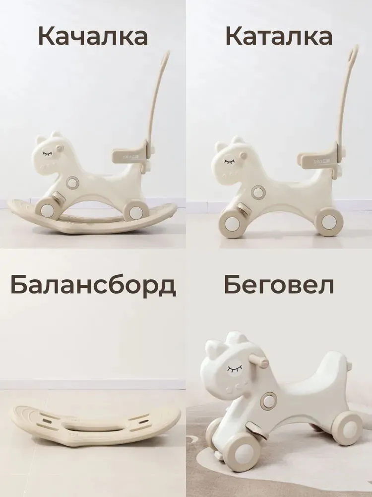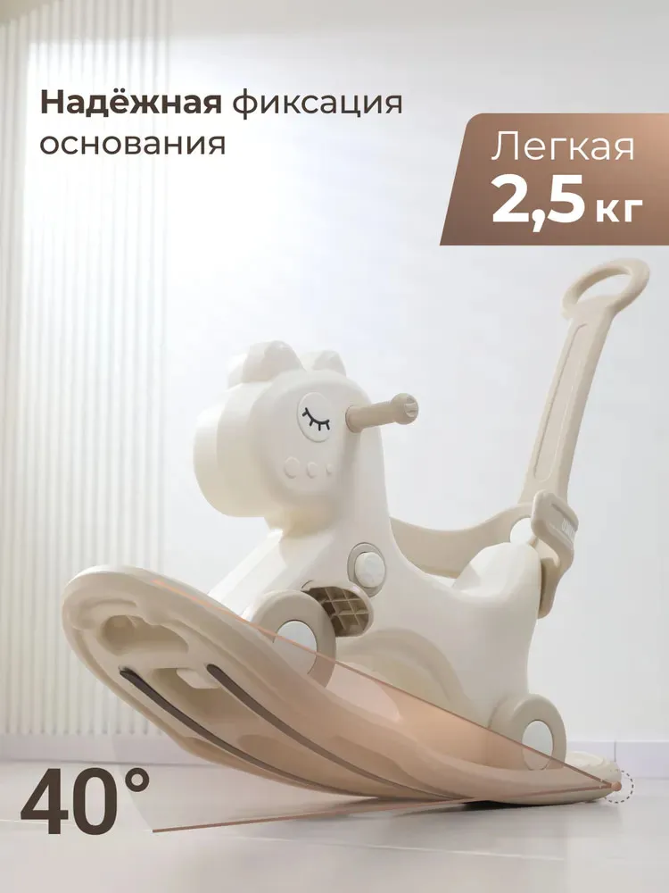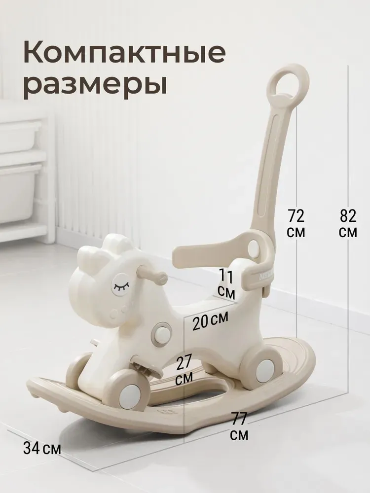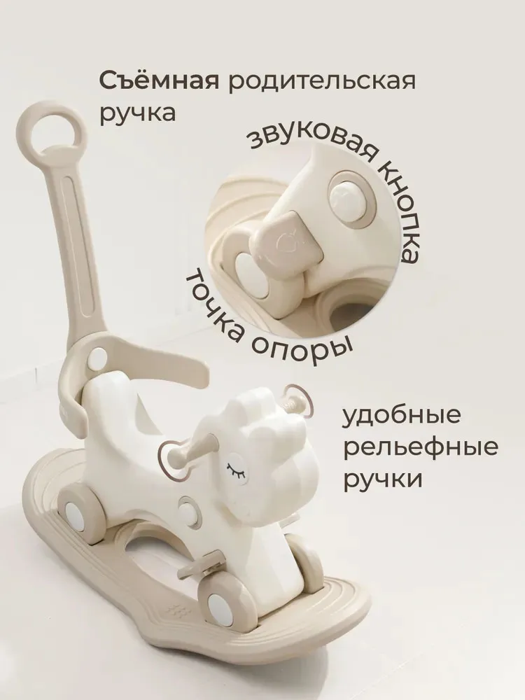 Широкое основание при качании обеспечивают максимальную безопасность для вашего малыша. Съемное основание позволяет легко превратить лошадку-качалку в лошадку-беговел. Фактически покупая одну игрушку, вы приобретаете две.