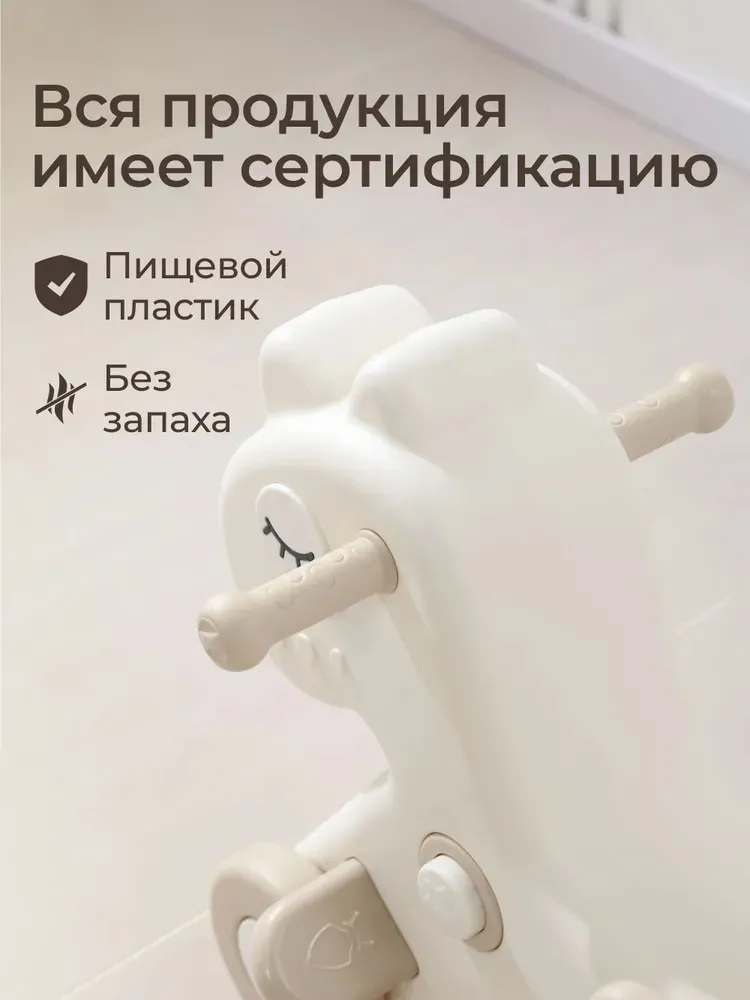 Как и другие детские товары марки Unix Kids, лошадка пушкар изготовлена из пищевого пластика 4-го класса — согласно классификации ГОСТ, гипоаллергенного и абсолютно безвредного даже для самых маленьких пользователей. Также этот материал не боится UV-лучей, и его можно использовать на улице.