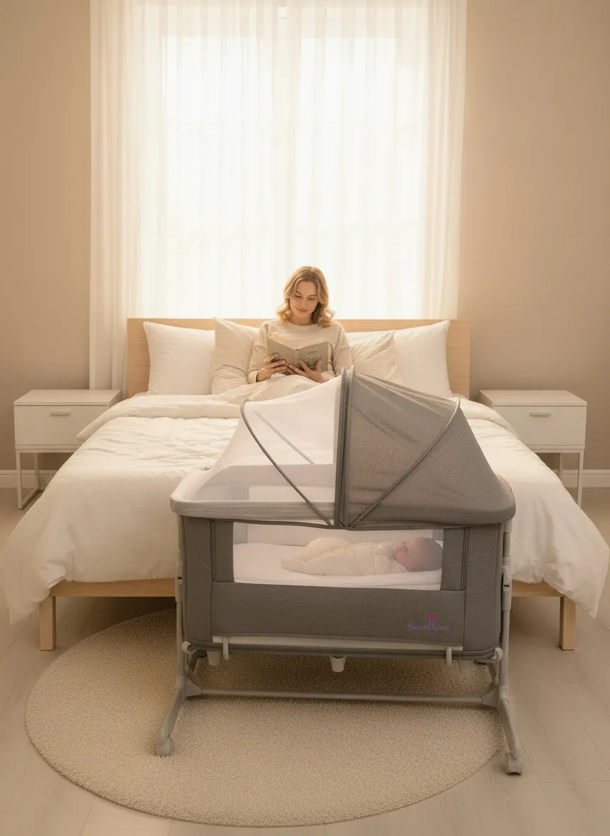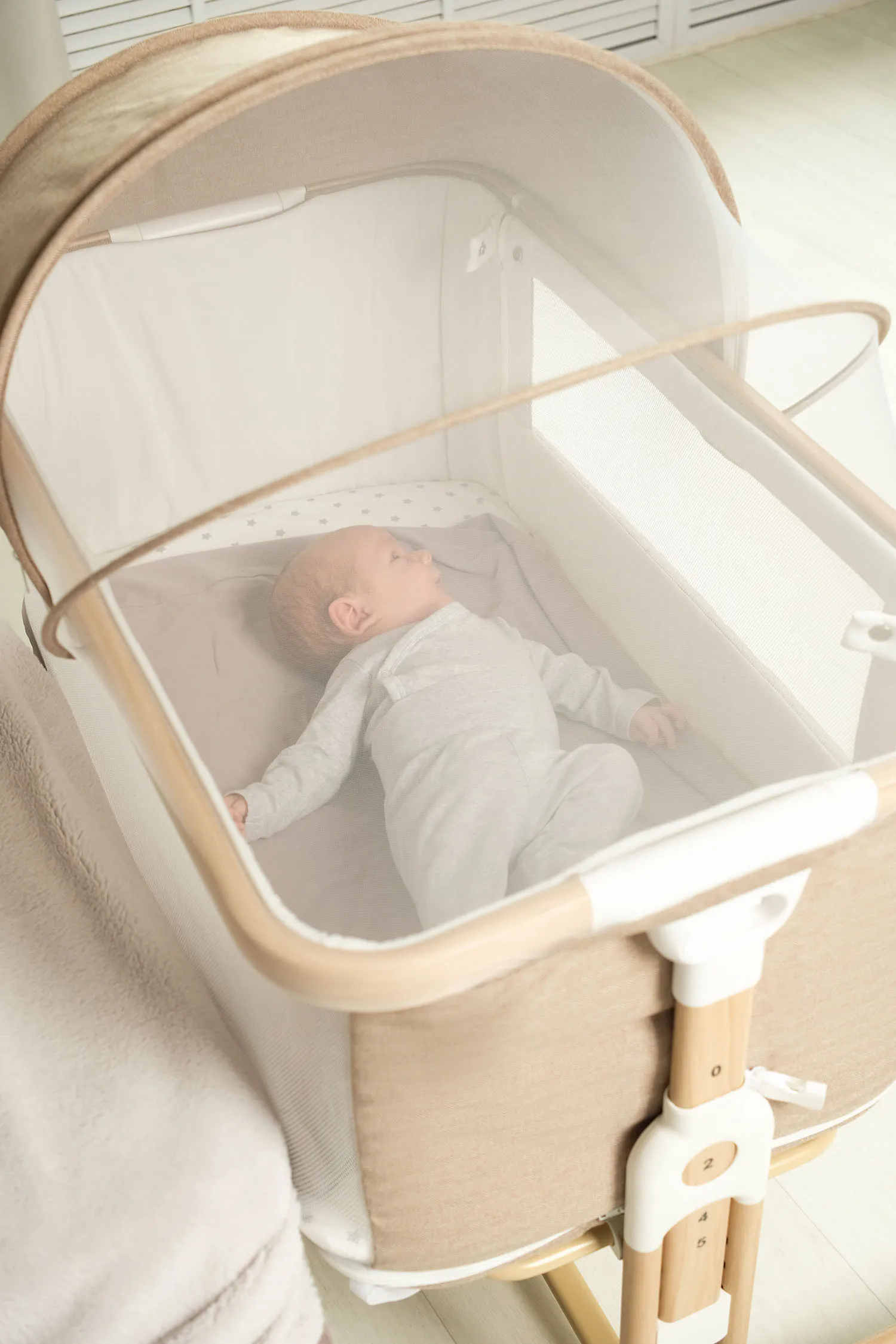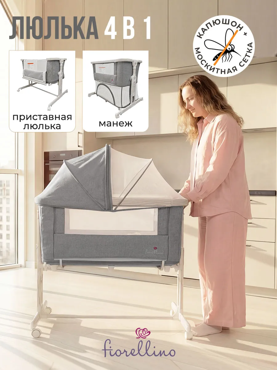 Многофункциональная приставная люлька Fiorellino нежного бежевого цвета станет идеальным и уютным местом для малыша с рождения. Эта колыбель обеспечит спокойный сон новорожденного. Благодаря сетчатым бортикам вы сможете наблюдать за малышом, а колесики позволят легко перемещать люльку из комнаты в комнату.