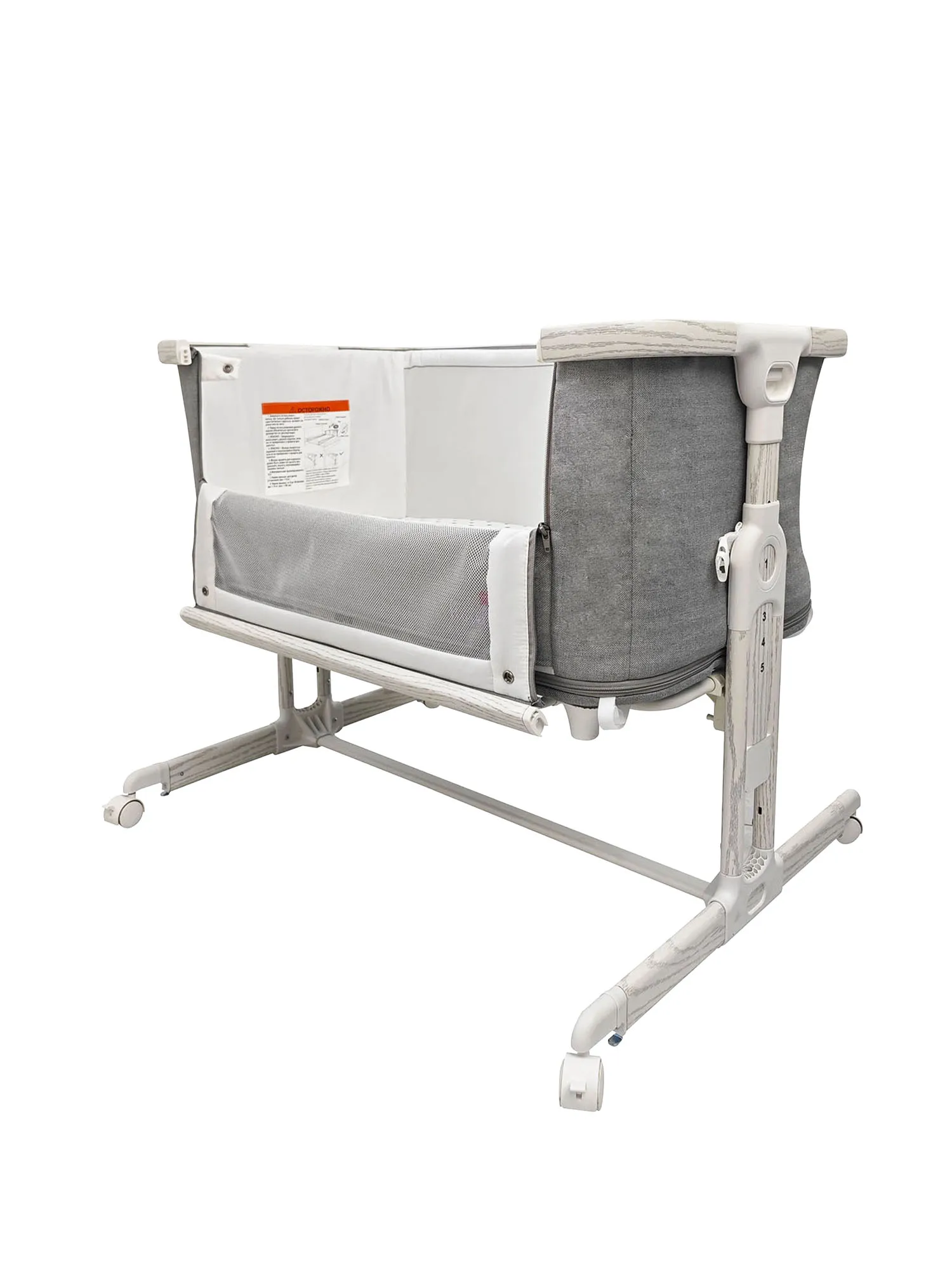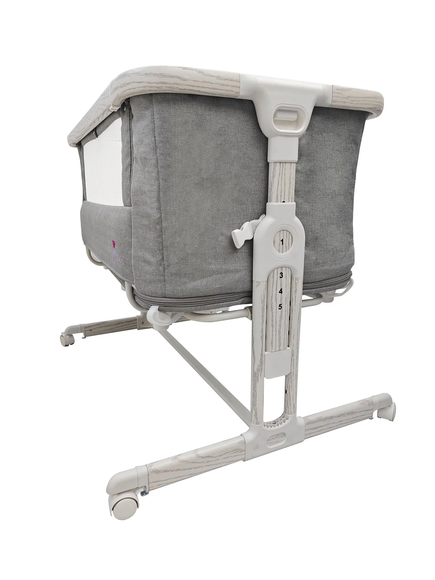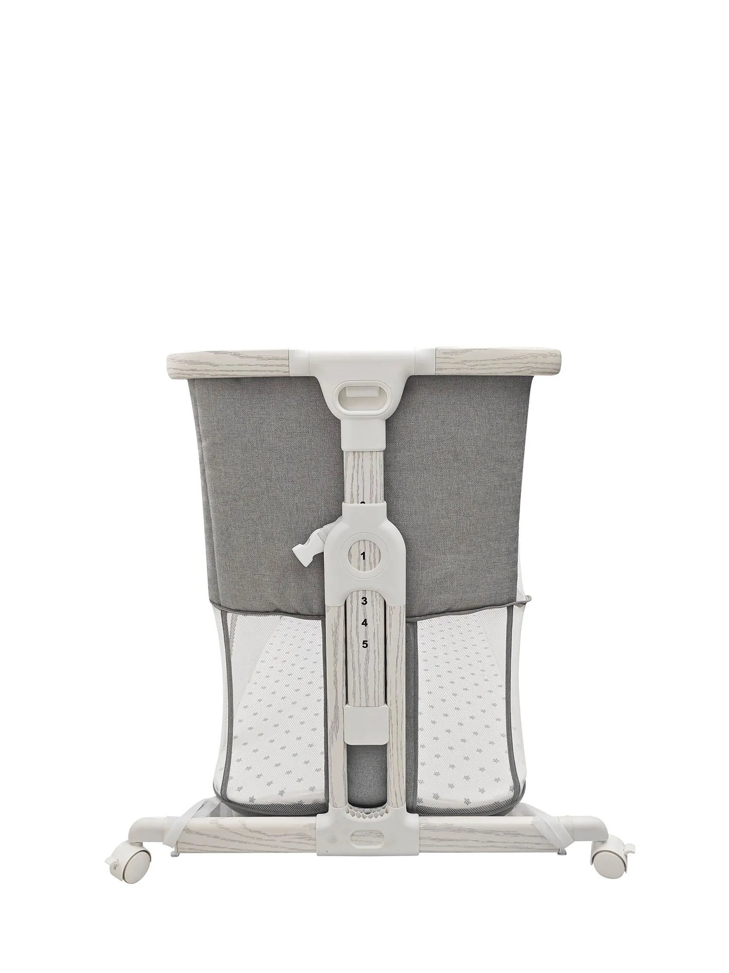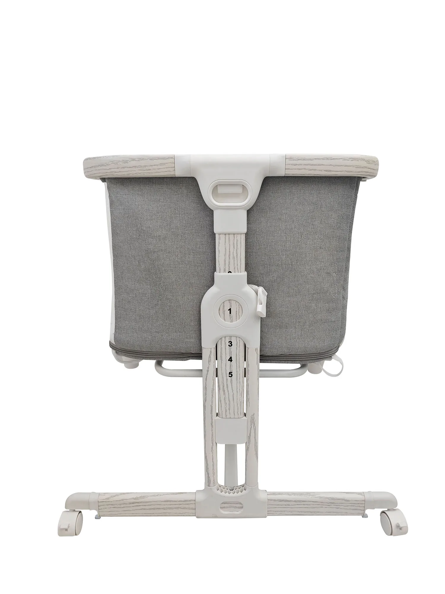 6 положений по высоте позволяют использовать люльку в качестве приставной кроватки. В варианте стационарной колыбели можно устанавливать ложе под наклоном, что снижает вероятность рефлюкса и СВДС. Запрещается использовать наклонное положение в варианте приставной кроватки со снятым бортиком.