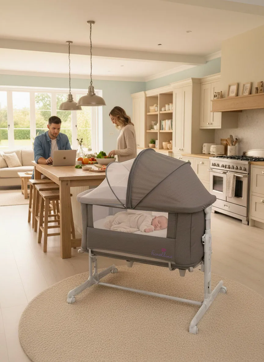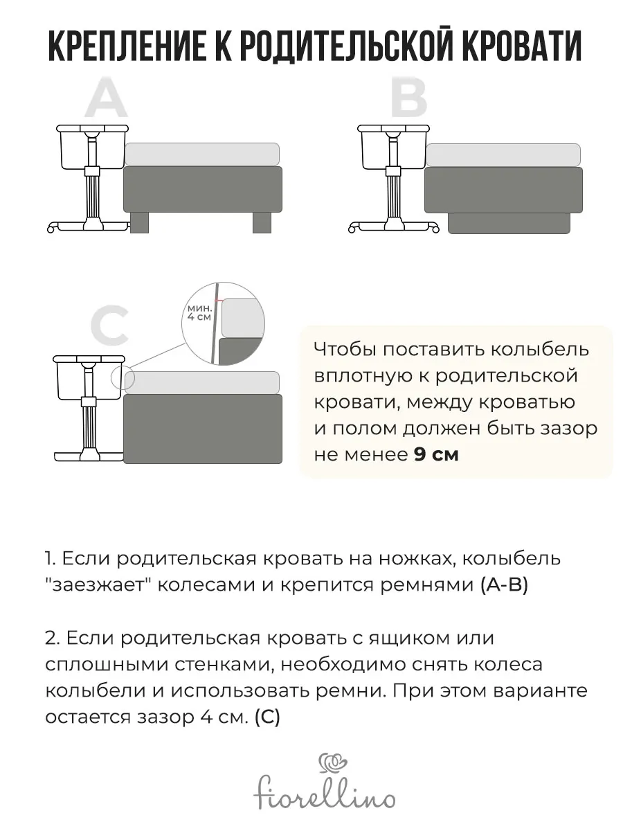 - Приставная колыбель: для малышей с рождения до 4–6 месяцев. Легко крепится к кровати родителей (ремни в комплекте), обеспечивая удобство кормления и присмотра. Максимальный вес — 9 кг.