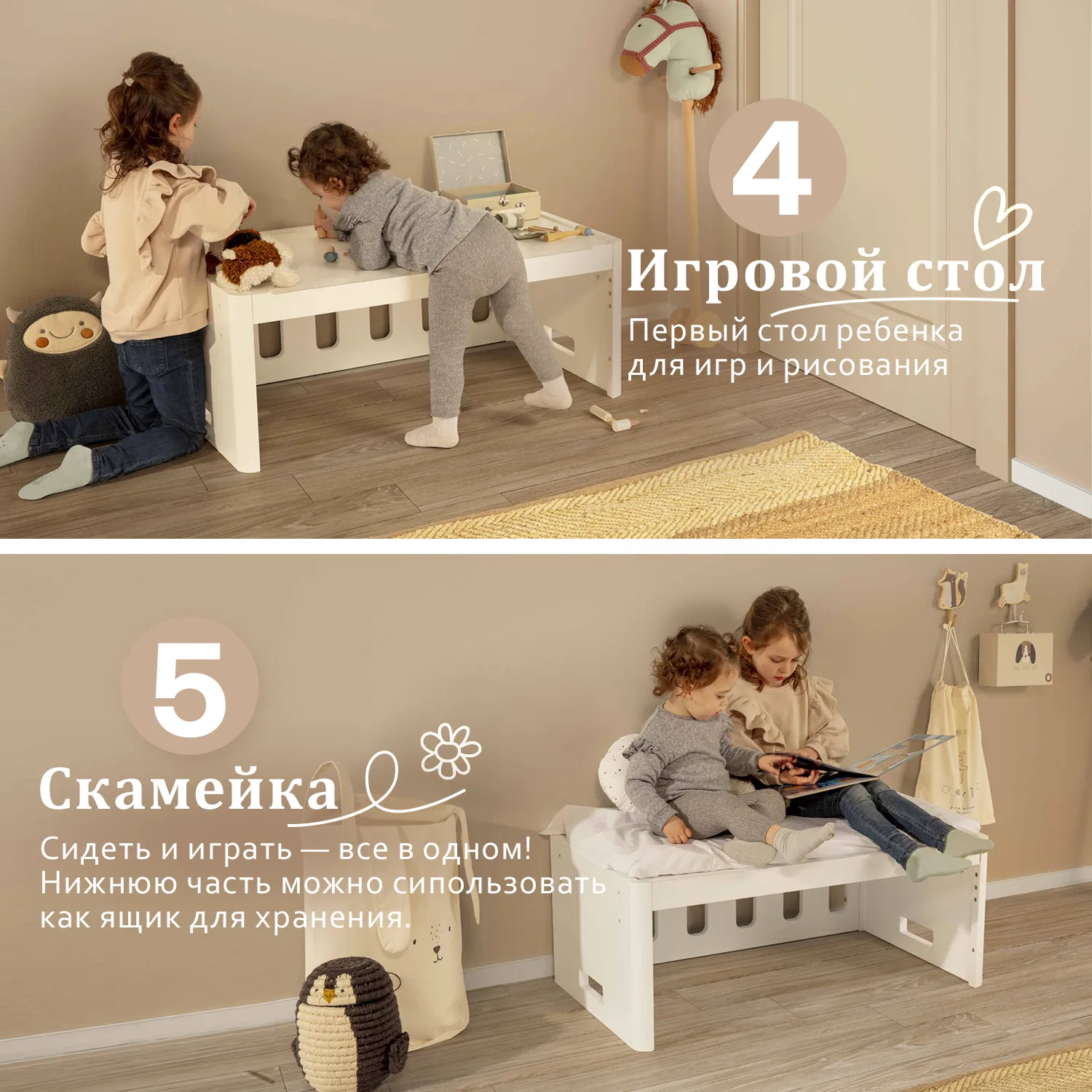 - Варианты трансформации: ящик для игрушек, стол, диван, игровой стол, скамейка