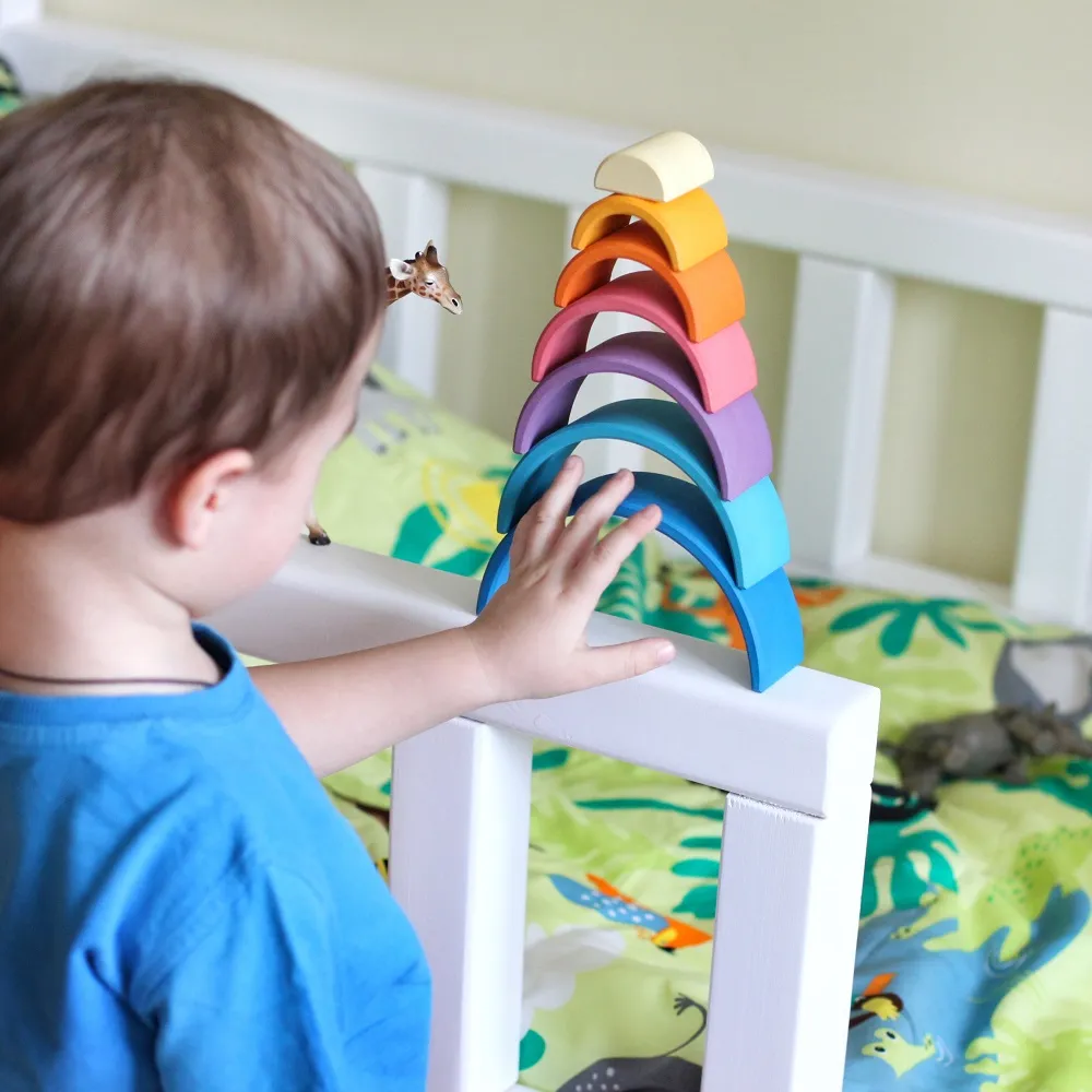 Играя с пирамидкой-радугой, ваш ребенок может изучать цвета, разобраться с понятиями «больше — меньше», «внутри — снаружи», строить интересные конструкции, гаражи для игрушечных машинок, туннели для поездов железной дороги, вольеры для игрушечных животных и многое-многое другое.