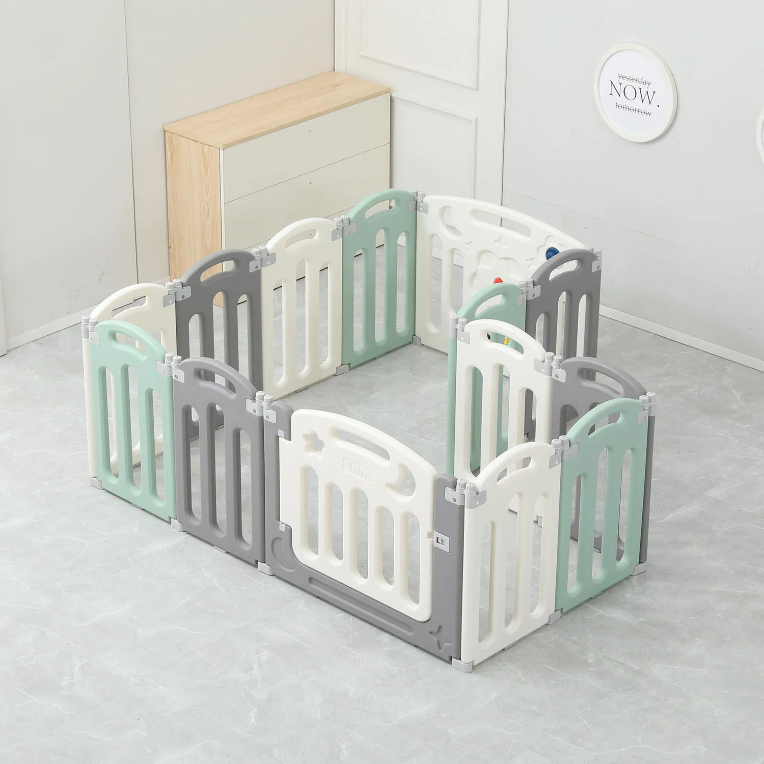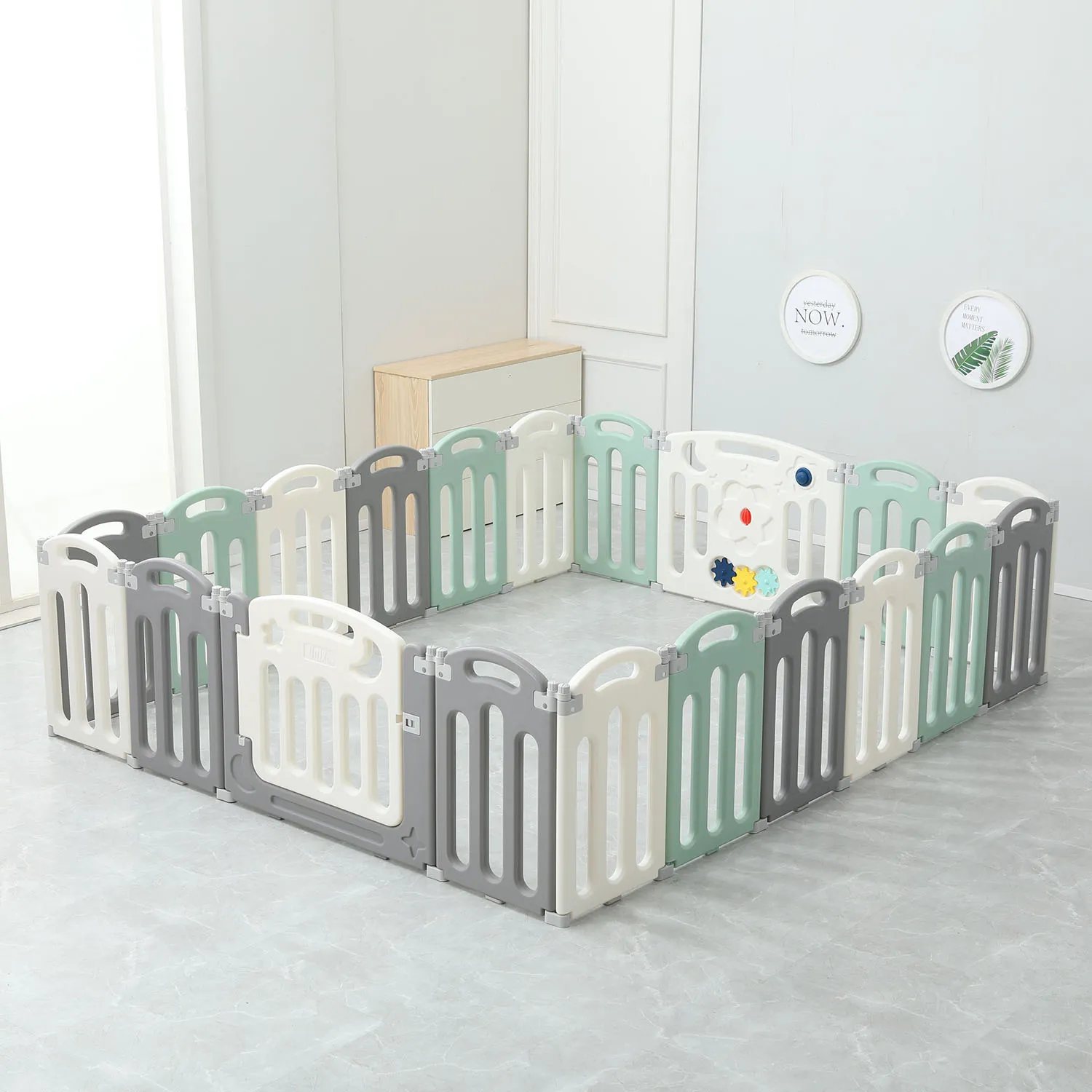 Количество и размер панелей: панель малая (ширина 37 см) — белая 6 шт / серая 6 шт / зеленая 6 шт., панель Бизиборд (ширина 75см) 1 шт., панель Вход (ширина 75 см) 1шт