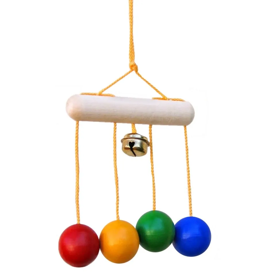 Мобиль-подвеска «Палочка» — одна из первых развивающих игрушек для малыша с рождения, выполненная из натуральной древесины липы и имеющая металлический звенящий бубенчик. Игрушку можно подвешивать над кроваткой: вашему малышу не будет скучно, он с увлечением будет рассматривать красочные шарики и пытаться до них дотянуться, развивая моторику рук и координацию движений. Шарики двигаются на веревочке вверх-вниз и при передвижении непроизвольно задевают бубенчик, который мелодично звучит.