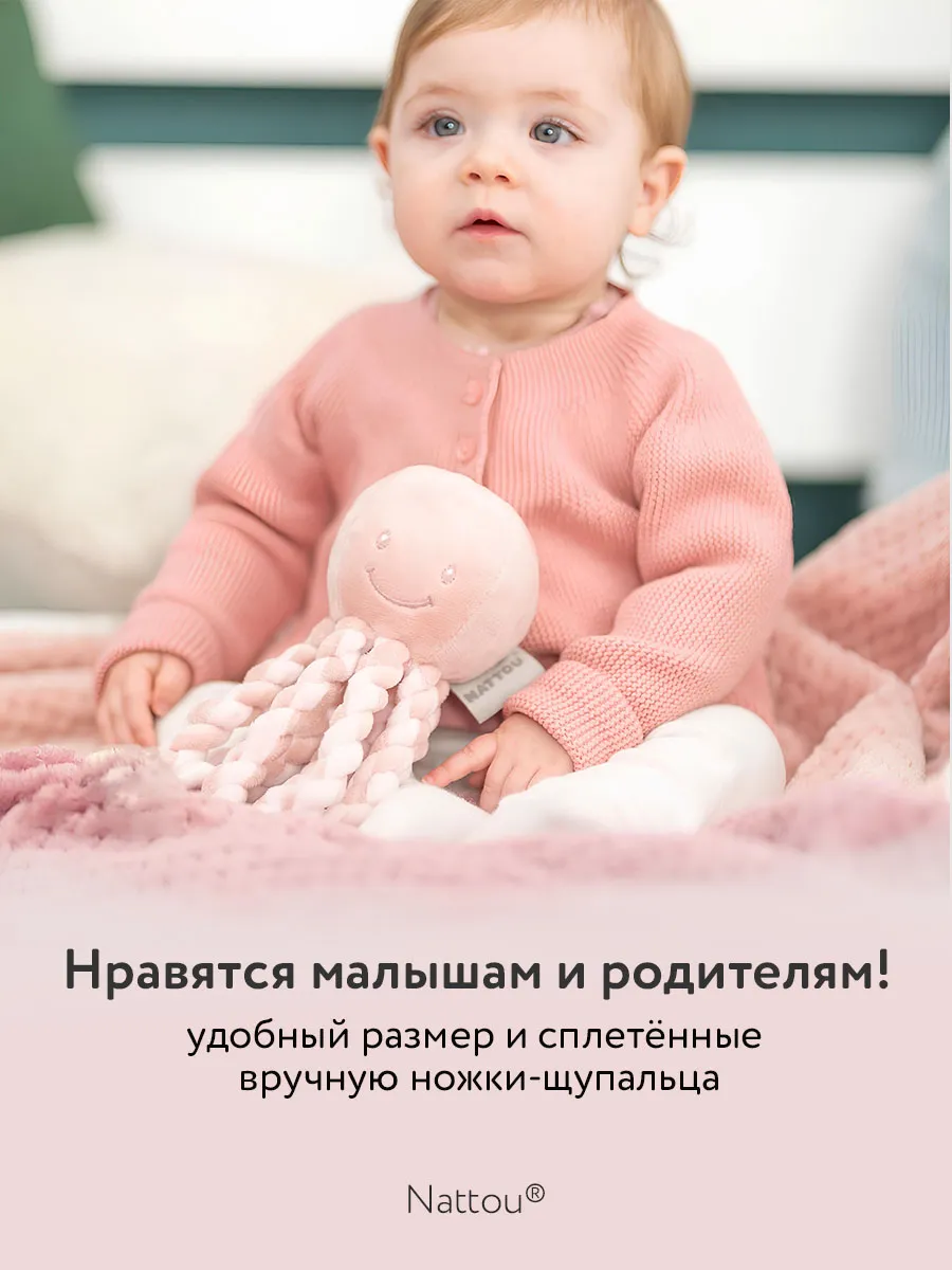 - удобный размер и сплетённые вручную ножки-щупальца, которые на ощупь напоминают пуповину в утробе матери – игрушка идеально подойдёт для новорождённых малышей;