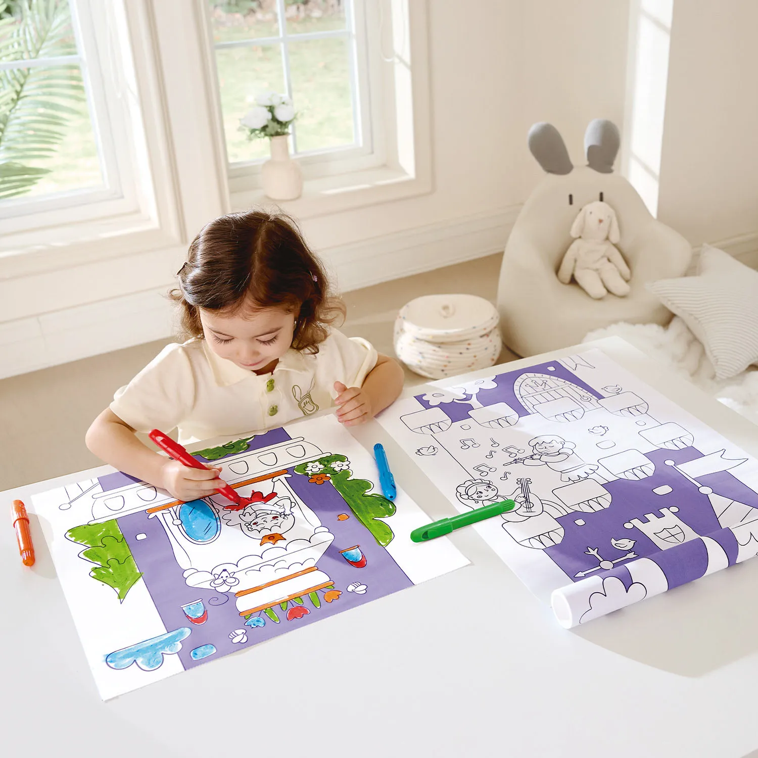 Набор представляет с собой большие листы бумаги с клеевым слоем (весь рулон более 5 метров в длину) и яркие карандаши — всё необходимое для погружения в сказочный мир с замками, принцессами, магией и драконами.