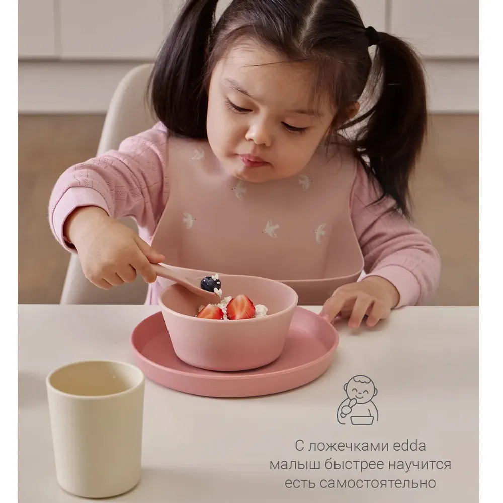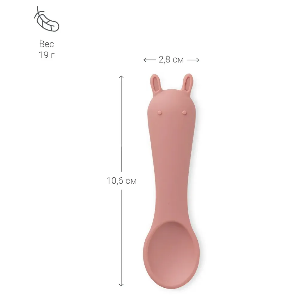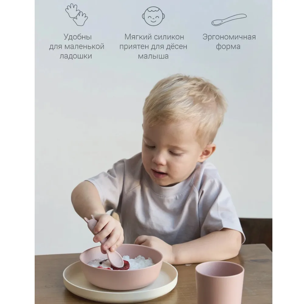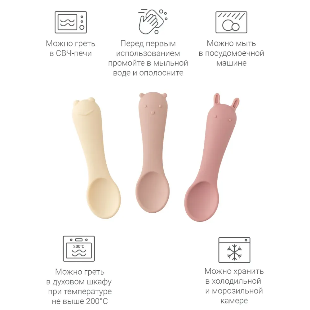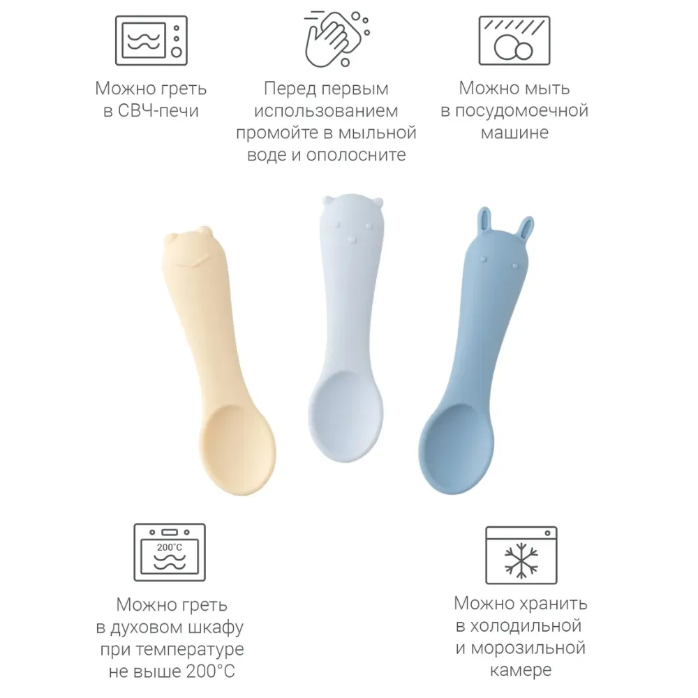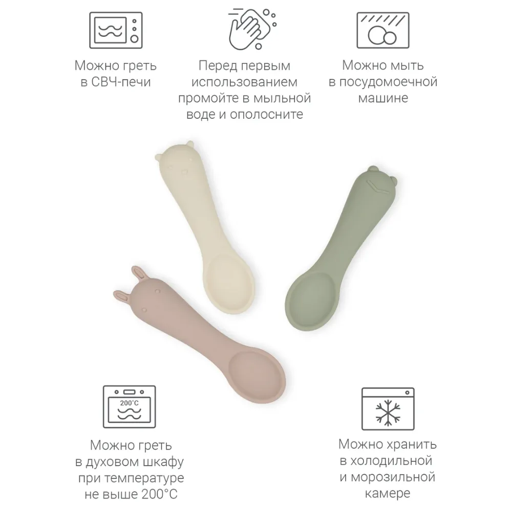 Размер и форма ложки разработаны с учетом физиологии малышей для лучшего захвата, поэтому она удобно ложится в ладошку малыша. Ложечки бесшумны во время еды, и просты в уходе: их можно мыть в посудомоечной машине, они выдерживают высокие температуры и подходит для СВЧ-печи.
