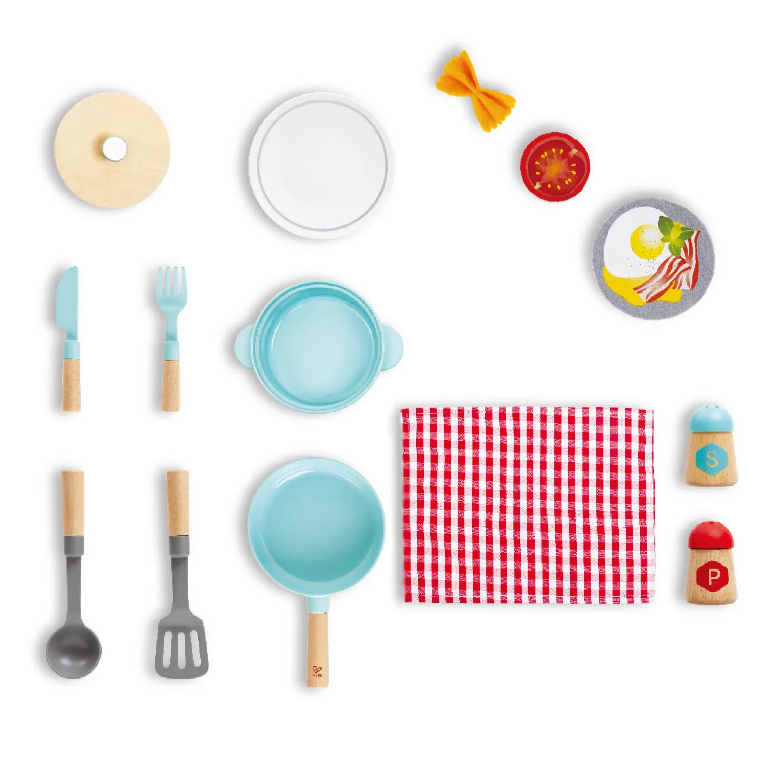 - В наборе: кастрюля и сковородка с крышкой, лопатка, половник, 2 вилки и 2 ножа, 2 мини-скатерти, солонка и перечница, паста и ломтик помидорки