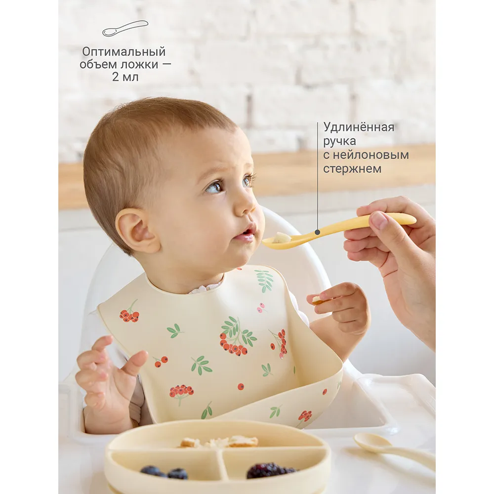 - Плотный нейлоновый стержень внутри ручки — ложку удобно держать, ручка не гнётся во время кормления, и еда не расплёскивается.