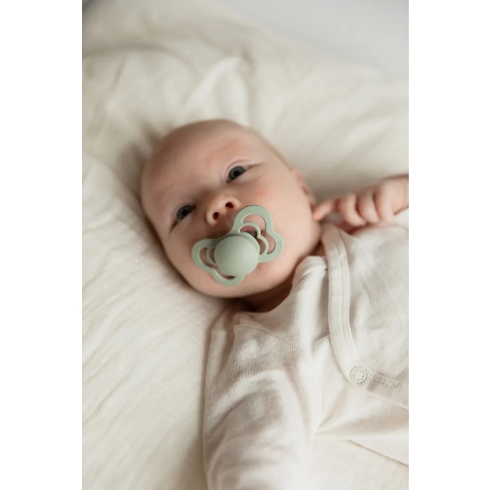Эксклюзивная пустышка с широкой фигурной накладкой, через которую хорошо циркулирует воздух. Сосок симметричной каплевидной формы способствует правильному расположению языка и развитию челюстно-челюстных мышц малыша.