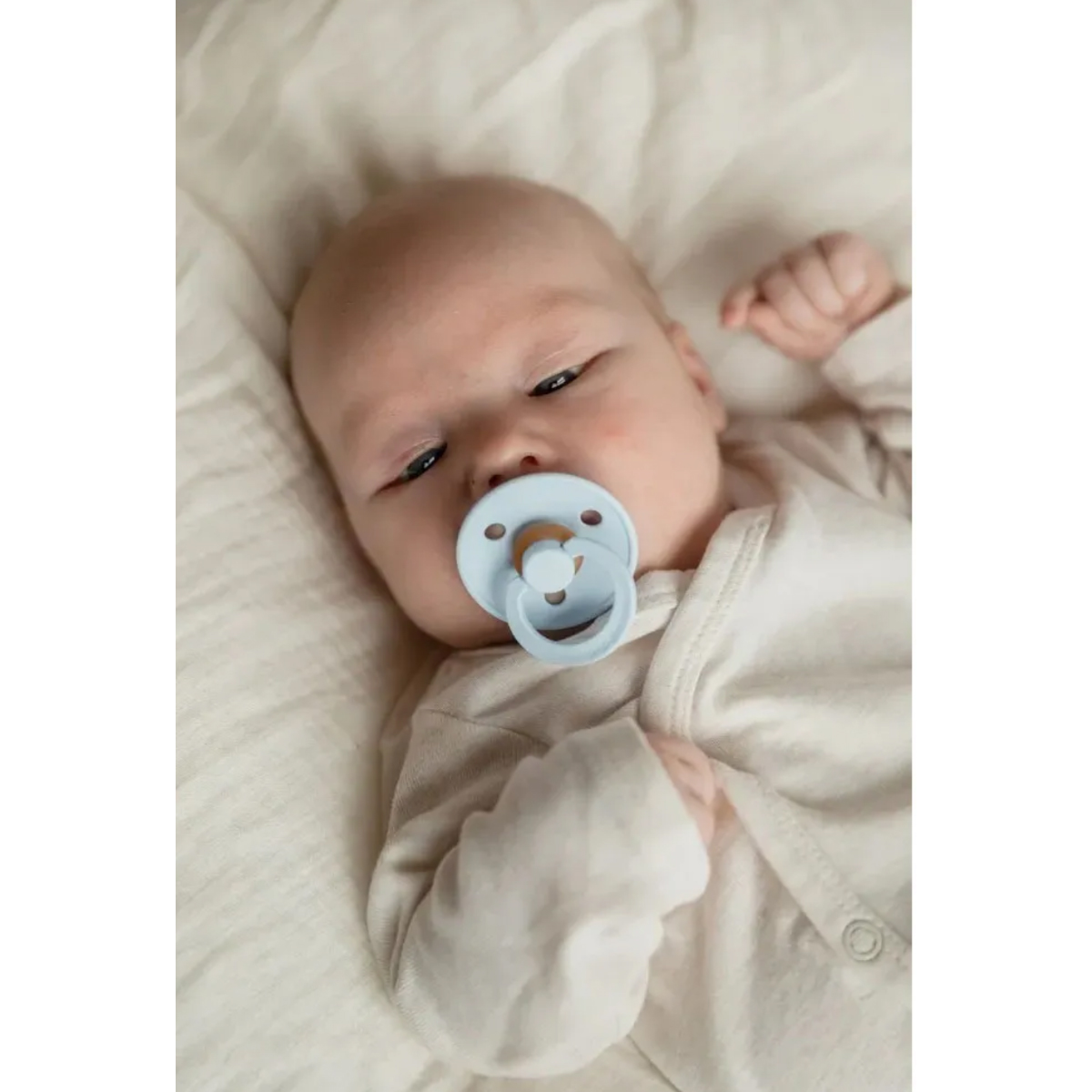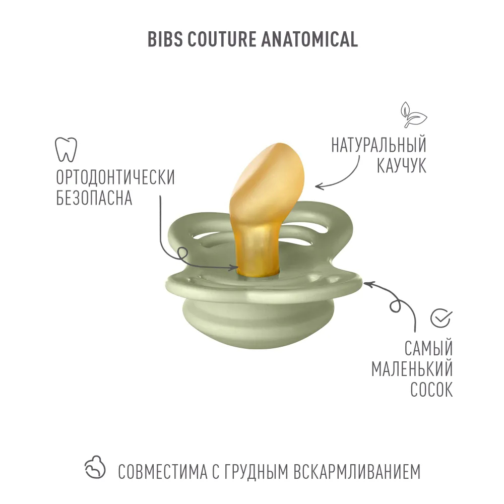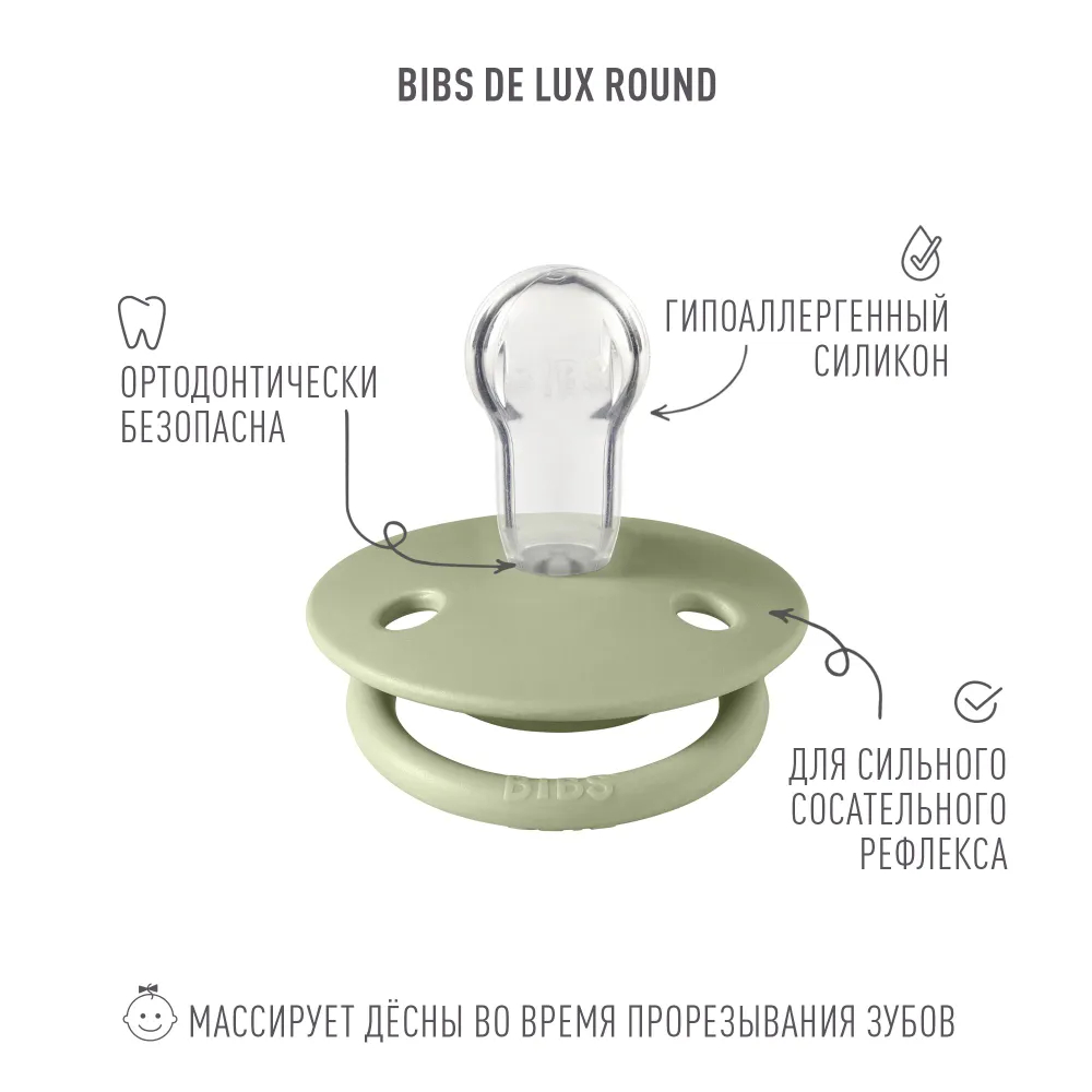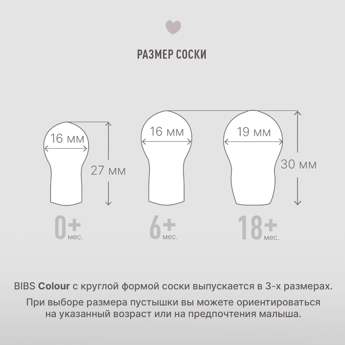 Классический круглый сосок напоминает сосок матери, благодаря чему Bibs Colour идеально подходит для малышей с рождения и совместима с грудным вскармливанием. Можно использовать для недоношенных детей. Пустышки Color имеют сосок из натурального каучука. За счет формы накладки пустышка не соприкасается с кожей малыша.