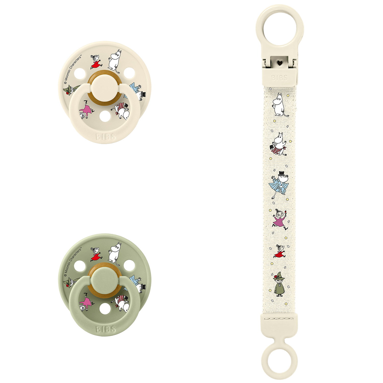 Подарочный набор BIBS x Moomin — это милый комплект, в который входят пустышки цвета слоновой кости и шалфея, а также зажим для пустышек цвета слоновой кости с изображением уникальных персонажей Муми-троллей. Создан, чтобы вызывать улыбки, успокаивать малышей и добавлять волшебства в повседневную жизнь родителей.