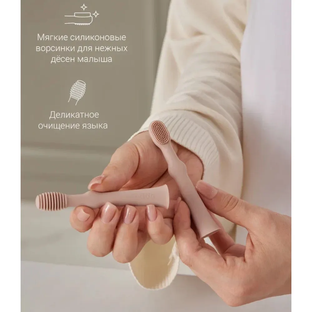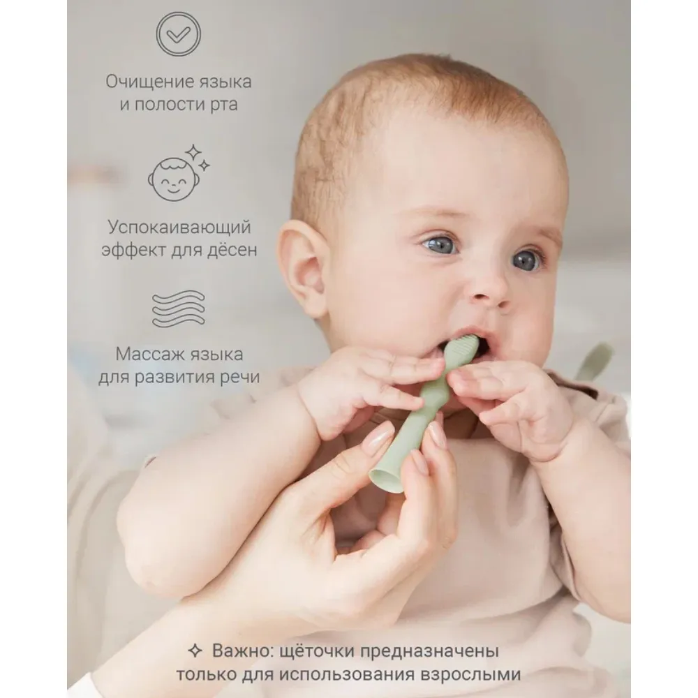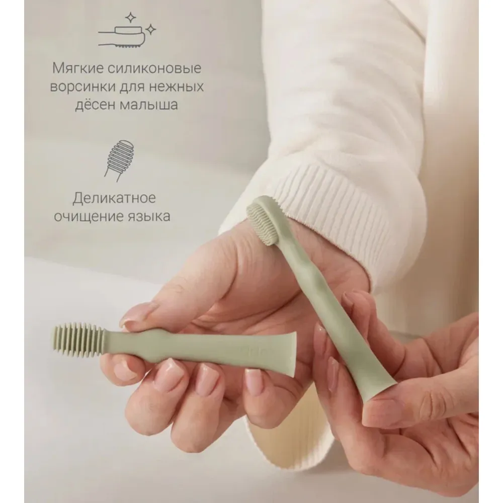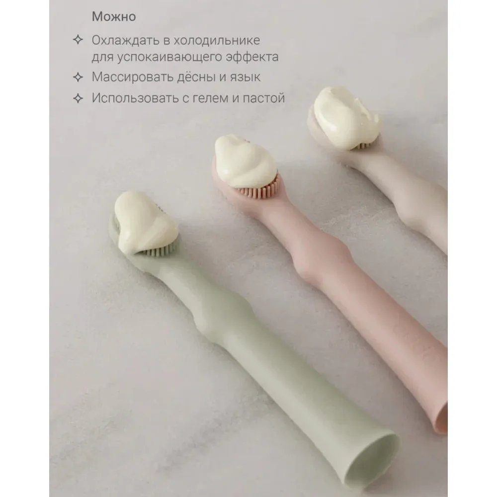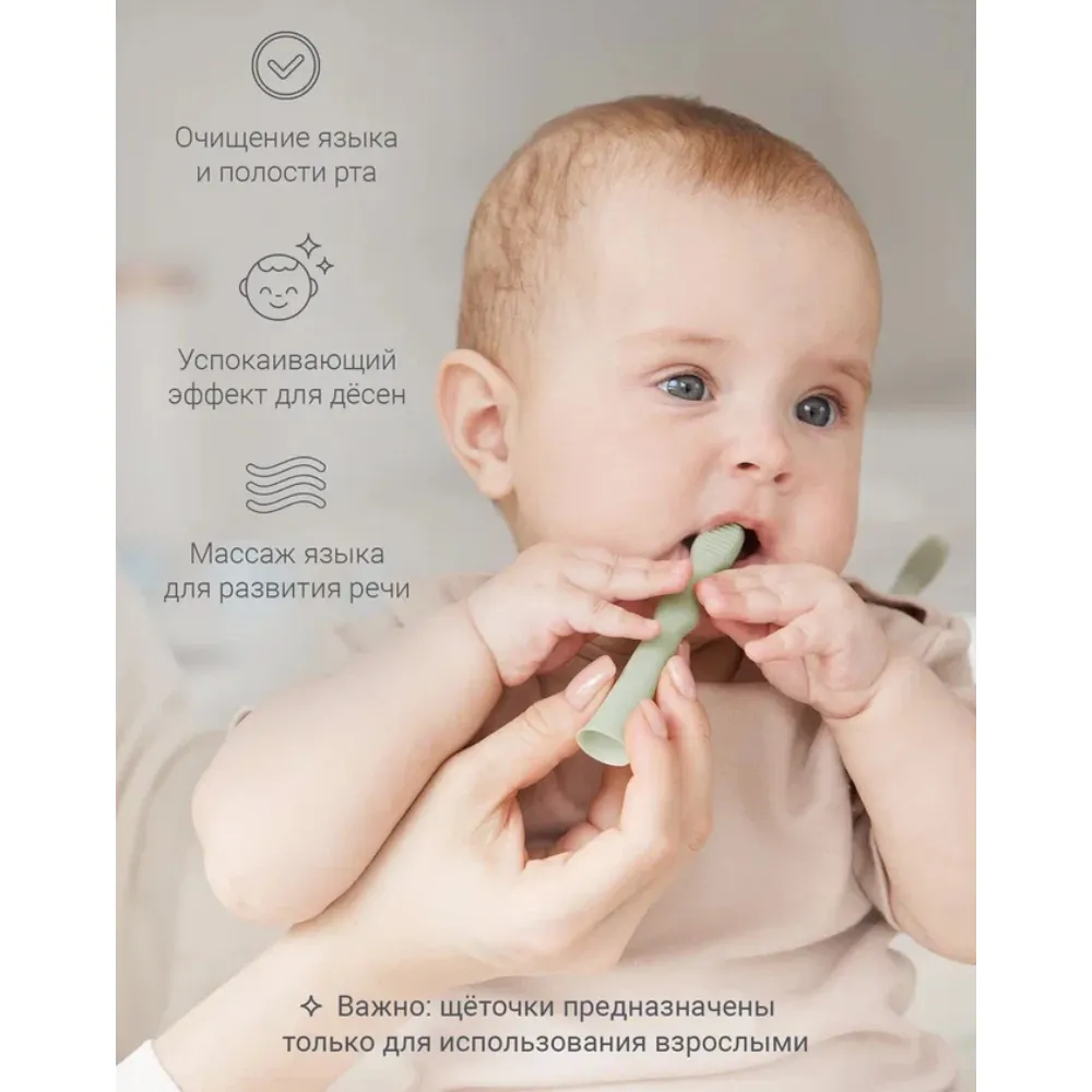 Нежные и мягкие щетинки улучшают кровообращение и помогают уменьшить давление в период прорезывания зубов. Щёточка для языка бережно очищает его от остатков пищи и налёта.