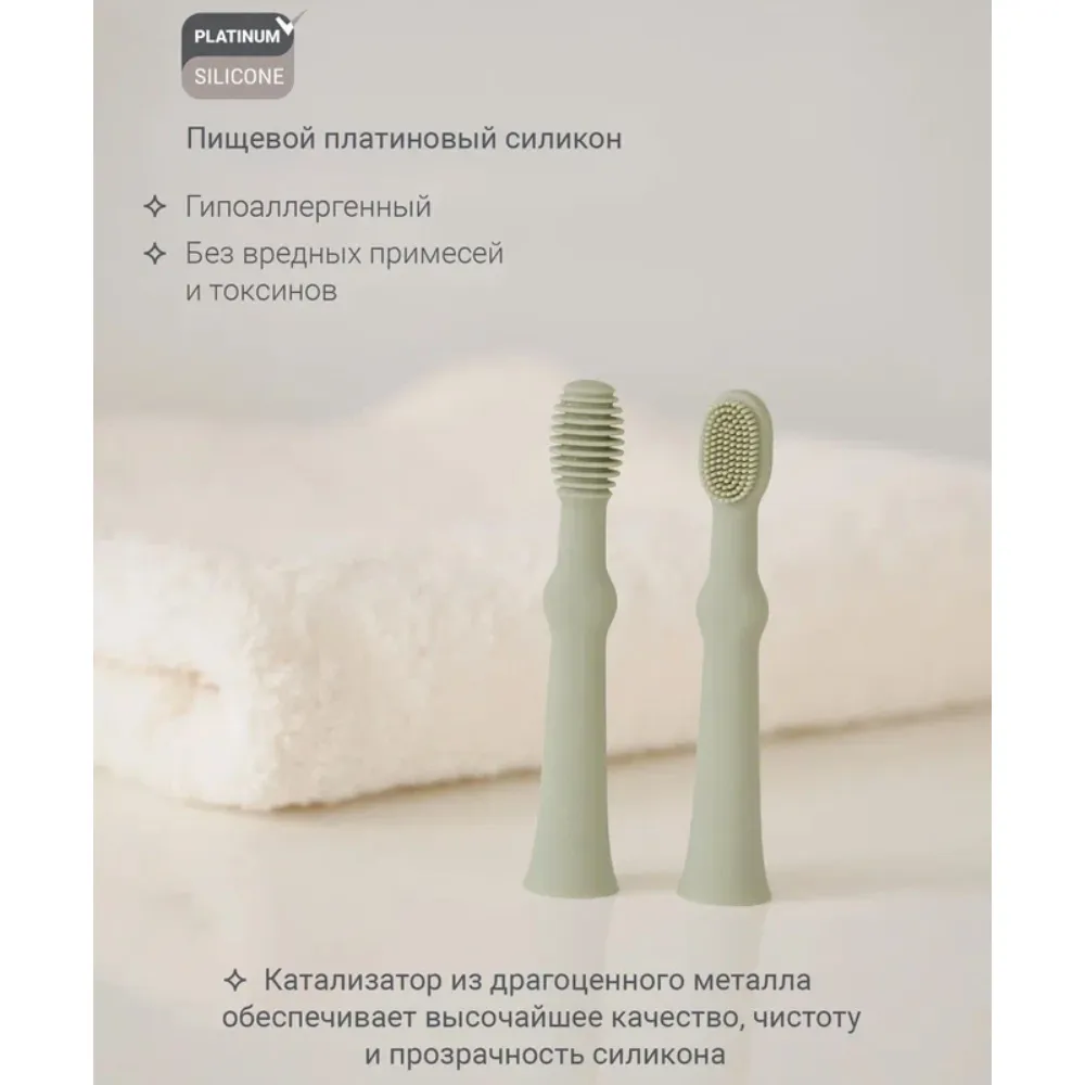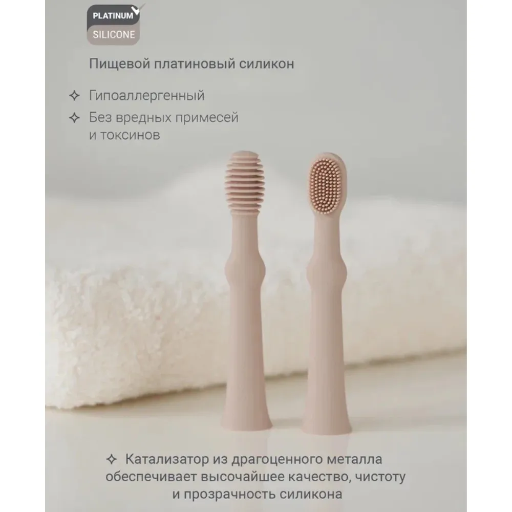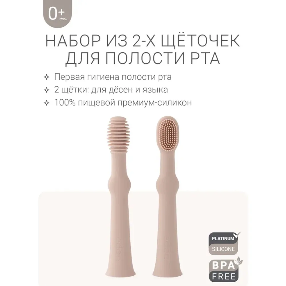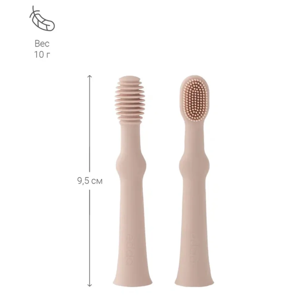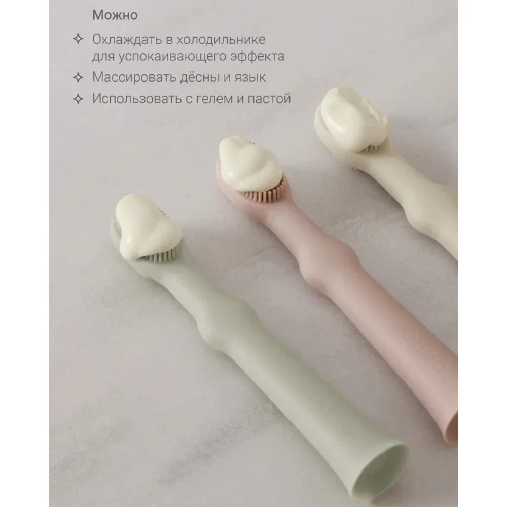 Нежные и мягкие щетинки улучшают кровообращение и помогают уменьшить давление в период прорезывания зубов. Щёточка для языка бережно очищает его от остатков пищи и налёта.