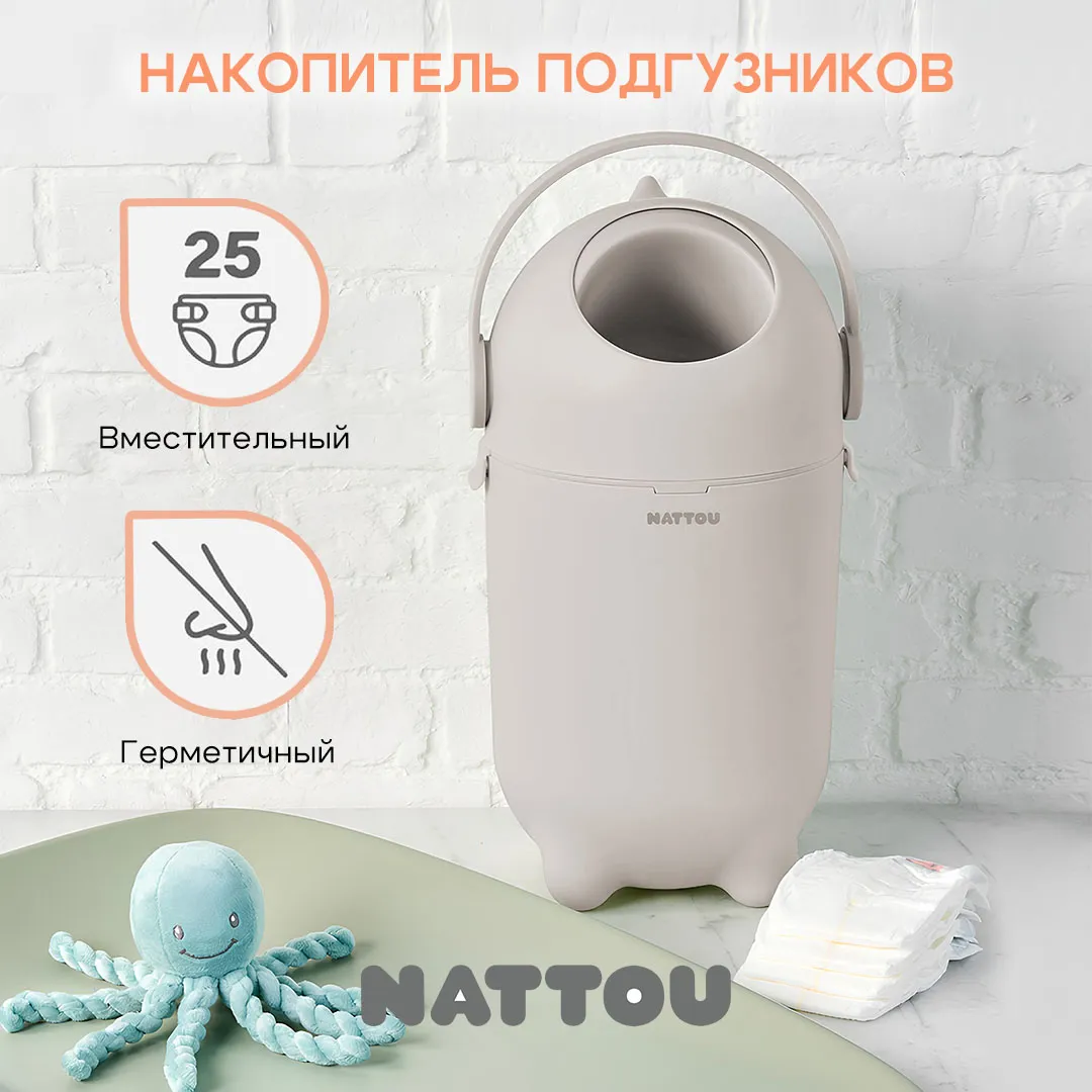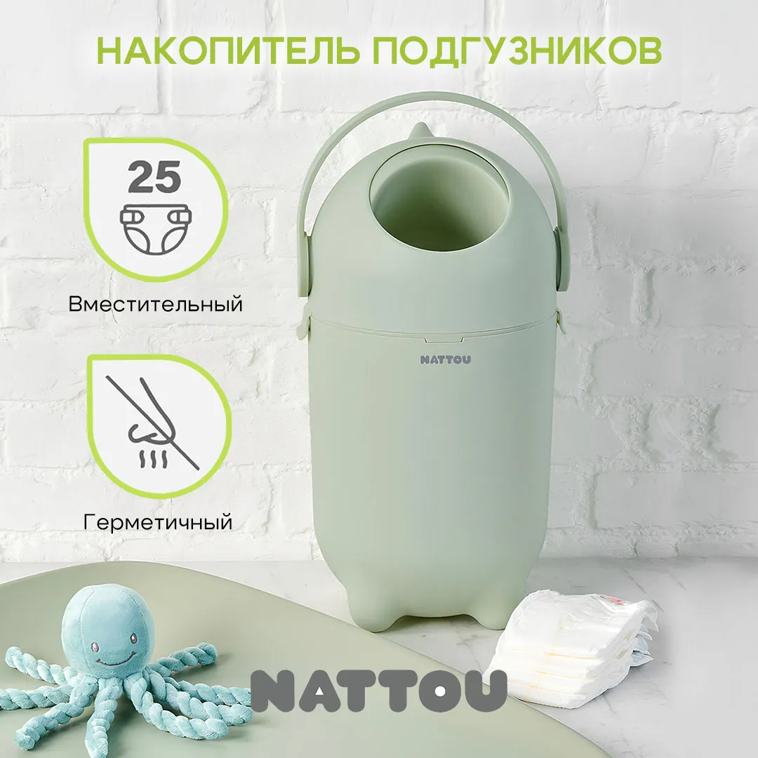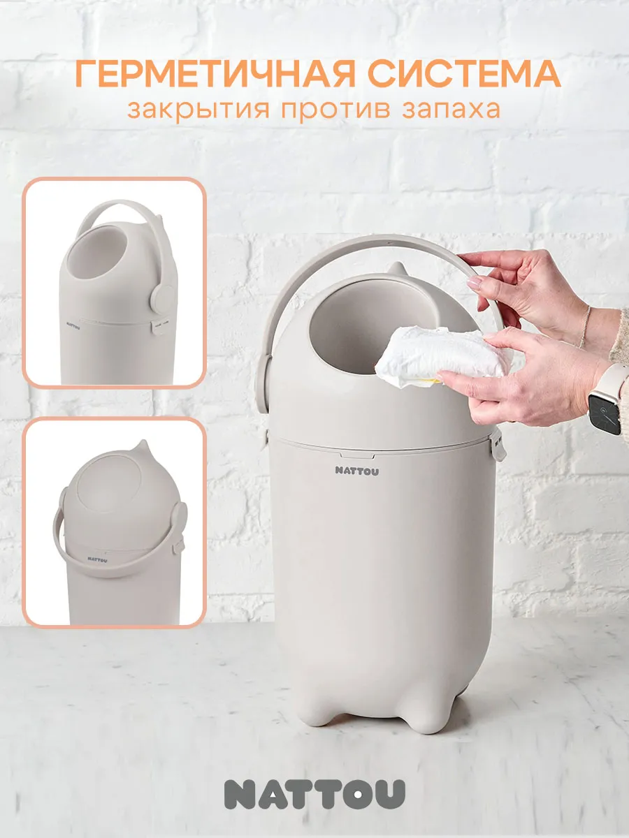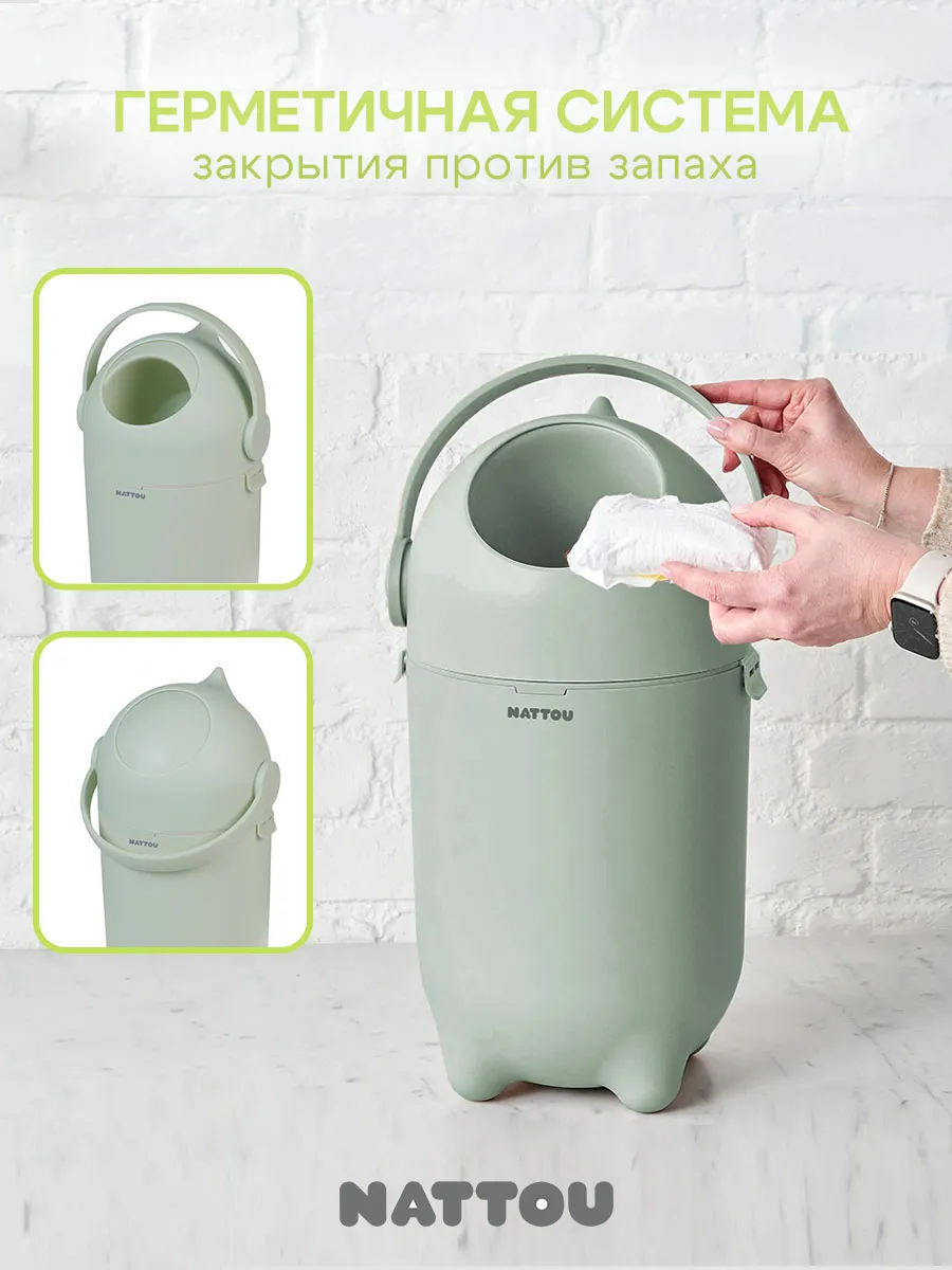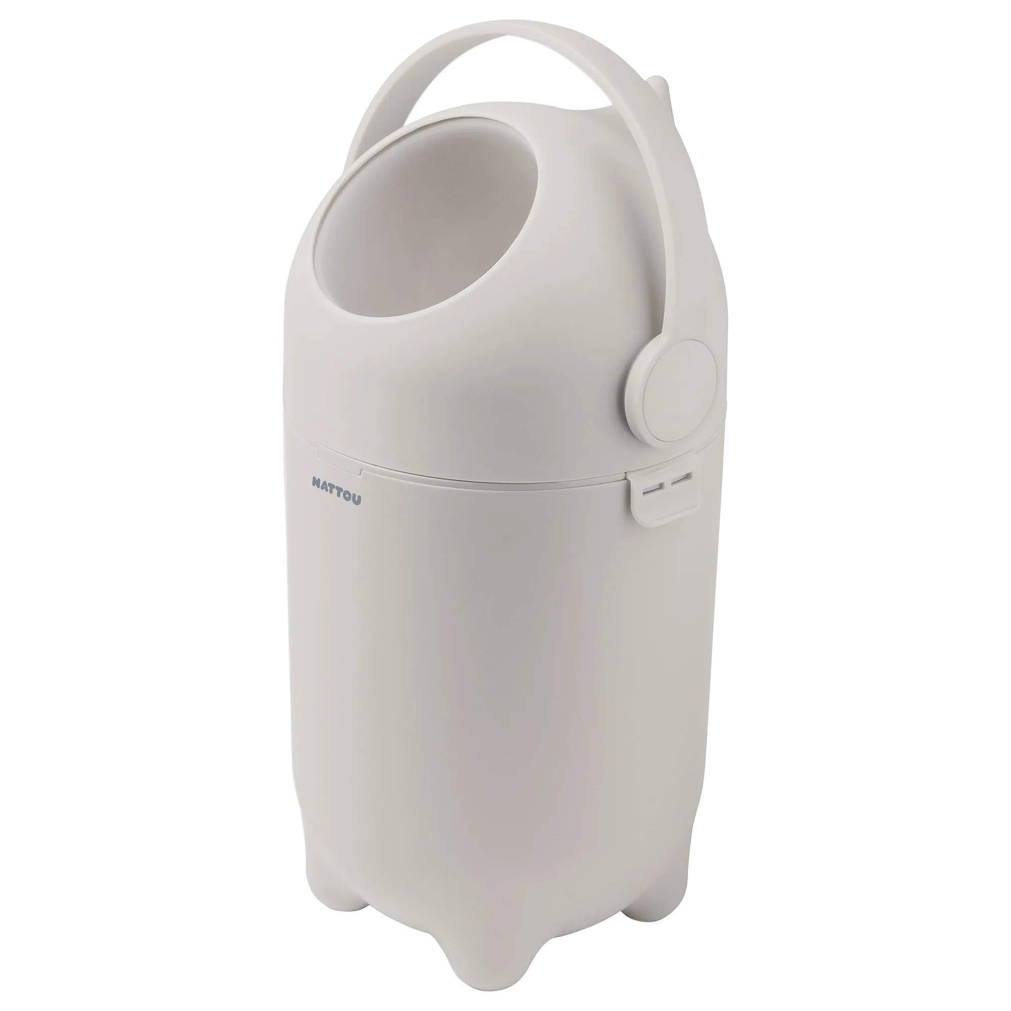 Предотвратите появление неприятных запахов в комнате благодаря накопителю для подгузников Nattou. Максимально простой в использовании: поднимите ручку, чтобы бросить подгузник в накопитель, а затем опустите ее снова, чтобы подгузник упал в мешок. Это легко сделать одной рукой! Накопитель очень экономичный, для него подходят любые мусорные пакеты. Благодаря специальной системе закрытия, запах от подгузников остается внутри, а не снаружи в комнате!