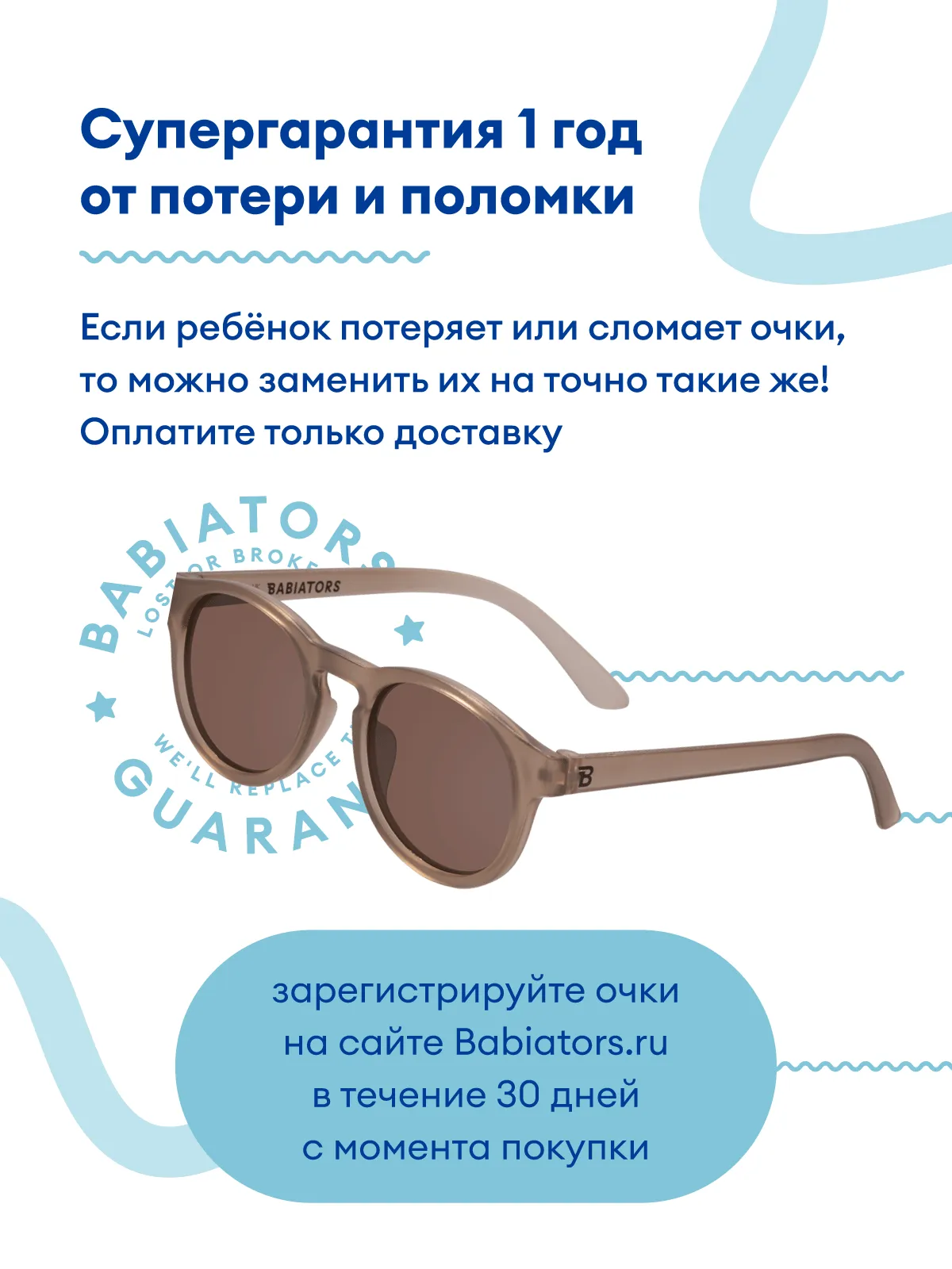 Производитель дает гарантию на поломку или потерю очков сроком на 1 год: для этого необходимо в течение месяца после покупки зарегистрировать ее на сайте www.babiators.ru и получить бесплатную гарантию 1 год! В случае потери покупатель платит только за доставку.